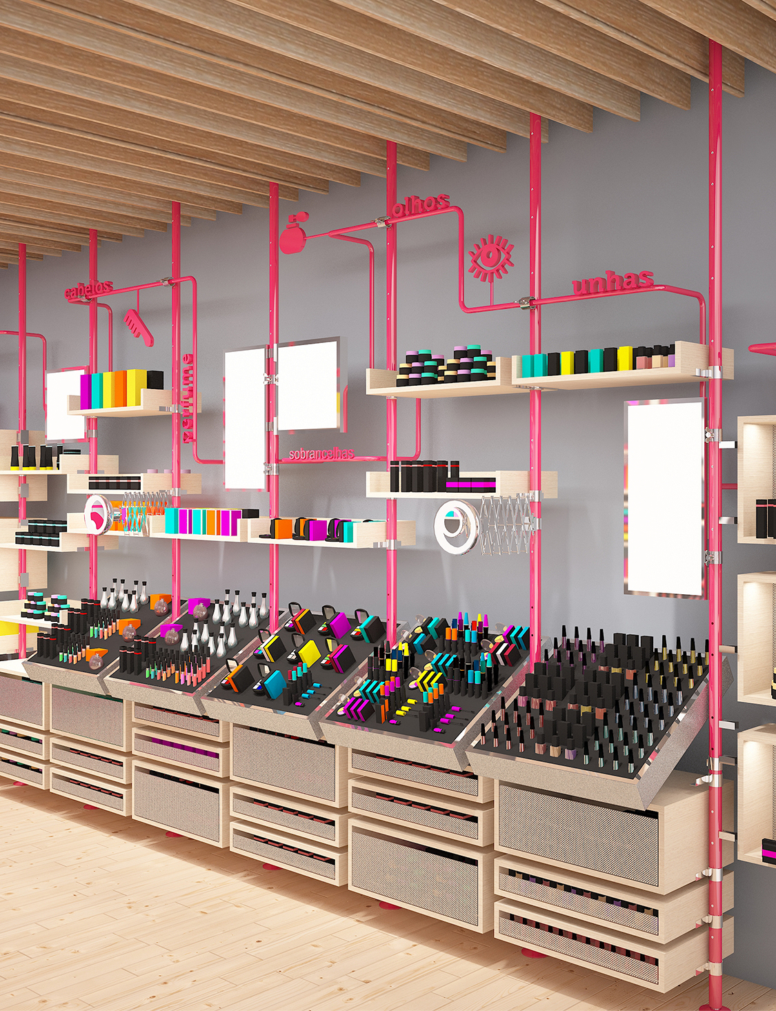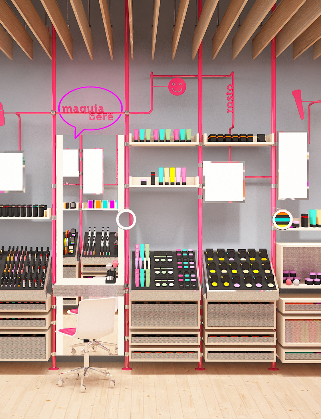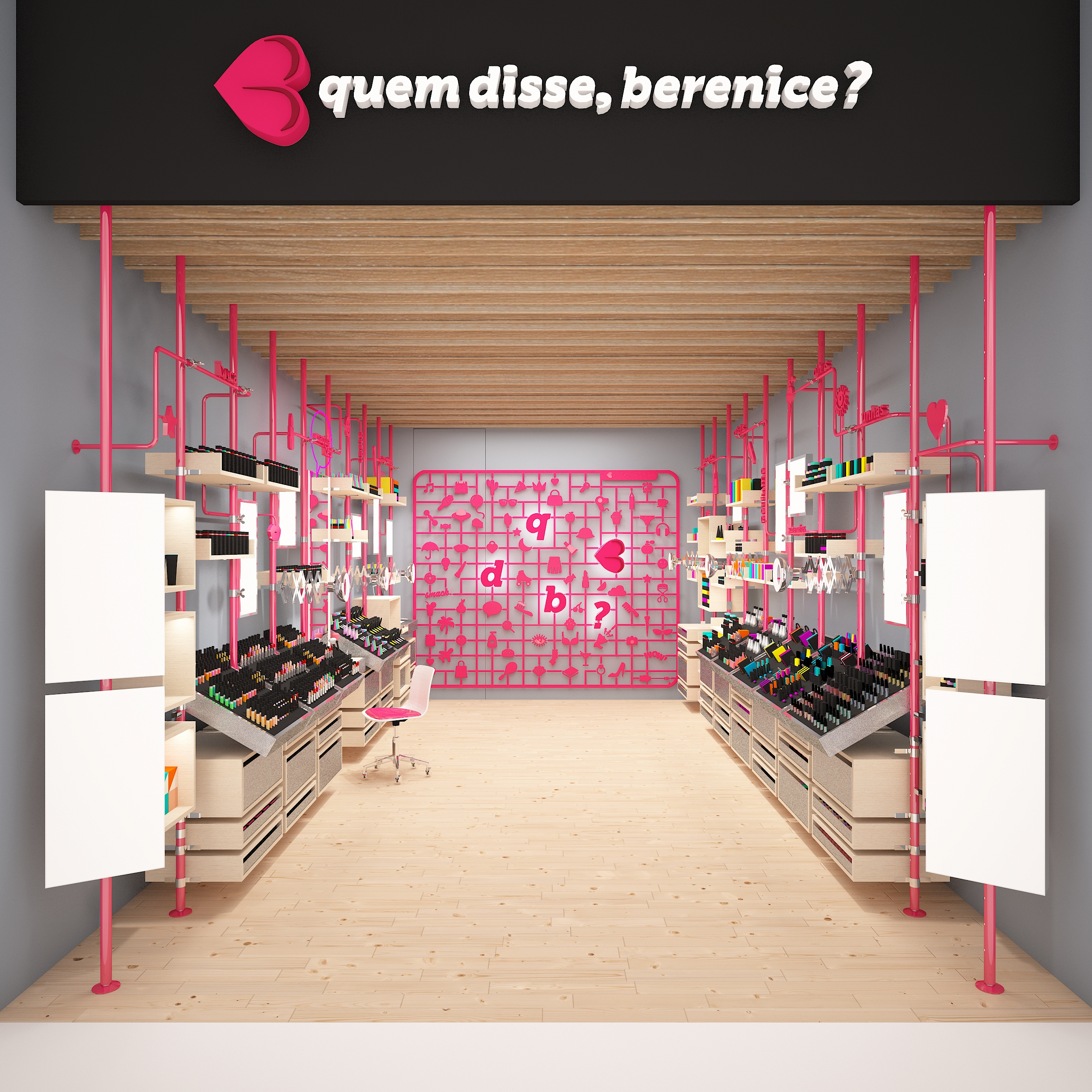 Brazil 2018In our interpretation, the idea of freedom for the new quem disse, berenice? store finds a perfect parallel in an increasingly widespread movement around the world: DIY – do it yourself. This movement points towards an autonomy of people not only in relation to traditional tasks, but also to the newest aesthetic experiences in the field of design. The DIY universe is our reference for the solution of the architectural, graphic, lighting, and communication elements, in order to make the concept of freedom tangible in the store. In short, the store is a large KIT of assembly parts, a reference that is recognizable and interpretable by anyone. The chosen materials and colors reflect the intended ambiances' dichotomies and are defined by contrast. On one hand, light-colored wooden furniture, flooring, and ceiling establish coziness for the space and express the brand's maturity; on the other hand, perforated metal mesh drawers; metallic structure and "Revell kit" type elements in the brand's color; a profusion of graphic elements, symbols, "emojis" and communication displays provide the new store with high spirits and attitude. We also consider that the display supports should always maintain neutrality and contrast in relation to the products, so that their colors and diversity of forms can stand out and, of course, contribute significantly to the overall store ambiance.