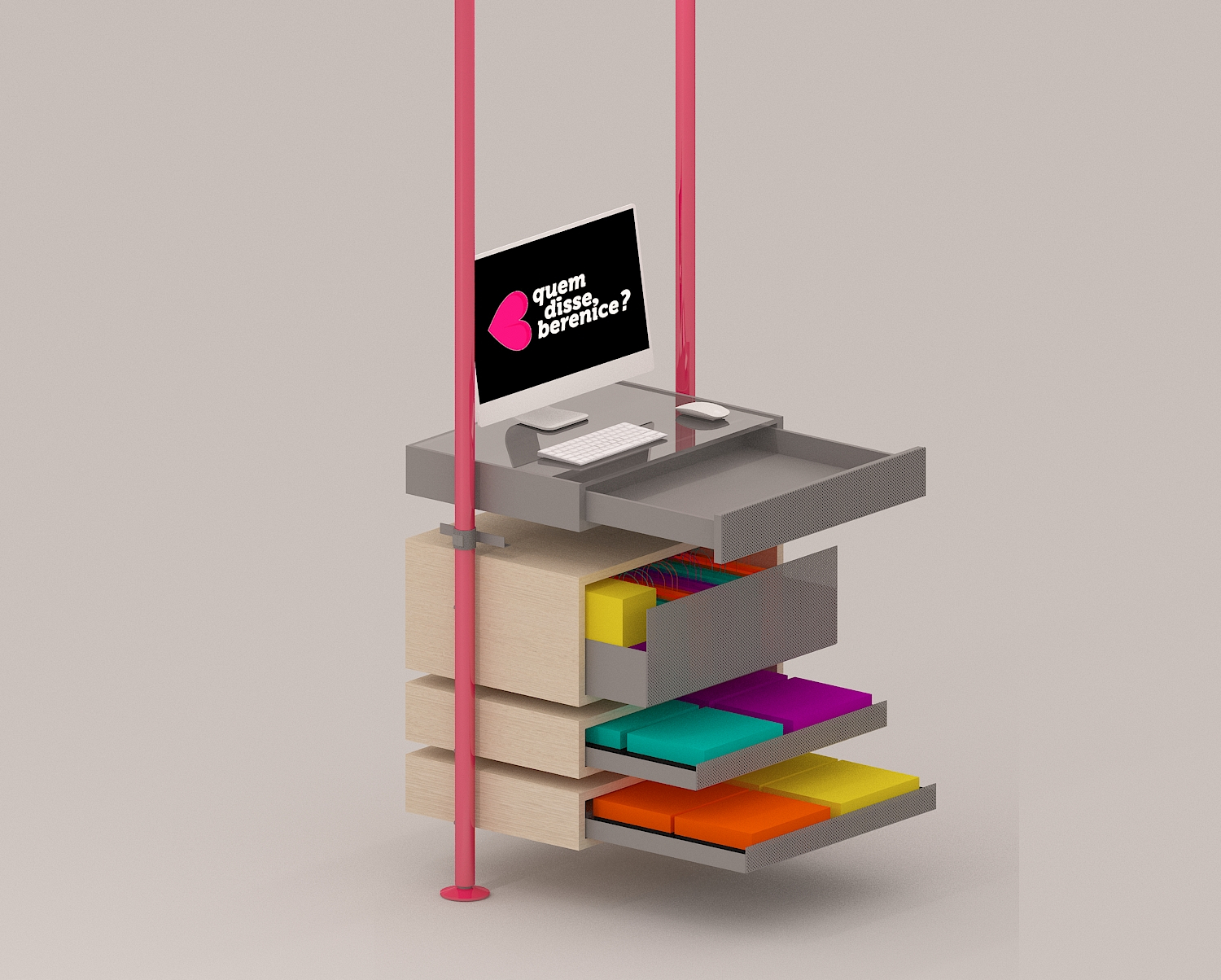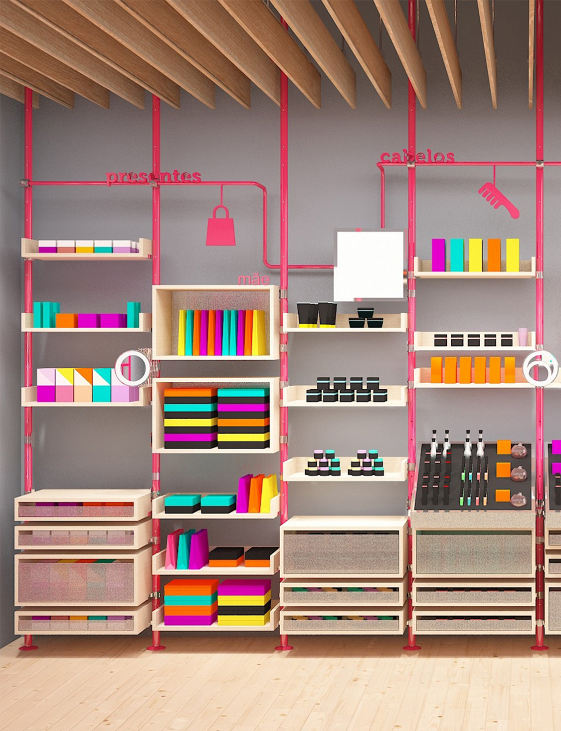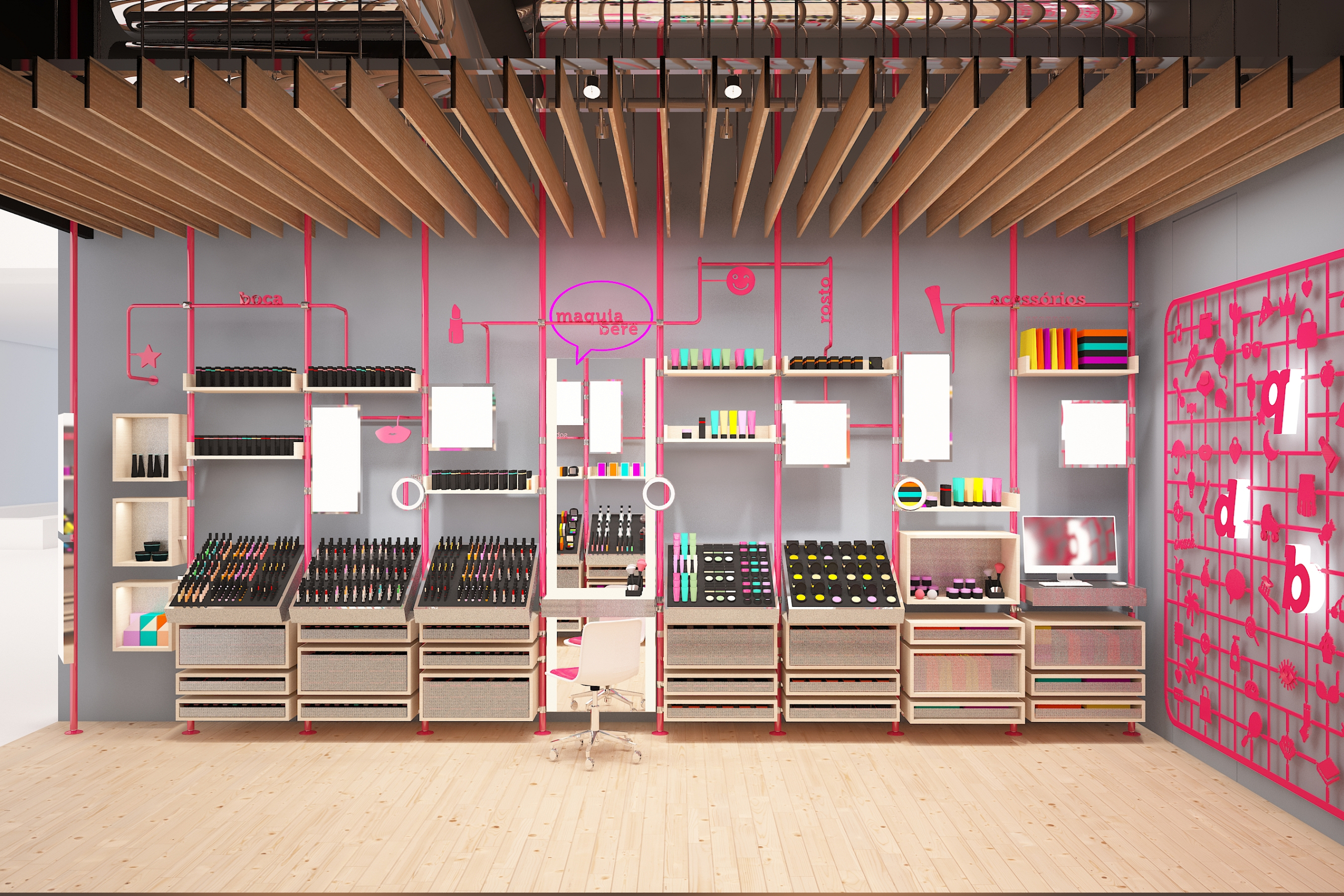 Brazil 2018In our interpretation, the idea of freedom for the new quem disse, berenice? store finds a perfect parallel in an increasingly widespread movement around the world: DIY – do it yourself. This movement points towards an autonomy of people not only in relation to traditional tasks, but also to the newest aesthetic experiences in the field of design. The DIY universe is our reference for the solution of the architectural, graphic, lighting, and communication elements, in order to make the concept of freedom tangible in the store. In short, the store is a large KIT of assembly parts, a reference that is recognizable and interpretable by anyone. The chosen materials and colors reflect the intended ambiances' dichotomies and are defined by contrast. On one hand, light-colored wooden furniture, flooring, and ceiling establish coziness for the space and express the brand's maturity; on the other hand, perforated metal mesh drawers; metallic structure and "Revell kit" type elements in the brand's color; a profusion of graphic elements, symbols, "emojis" and communication displays provide the new store with high spirits and attitude. We also consider that the display supports should always maintain neutrality and contrast in relation to the products, so that their colors and diversity of forms can stand out and, of course, contribute significantly to the overall store ambiance.
