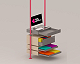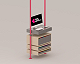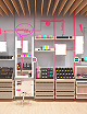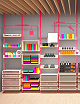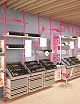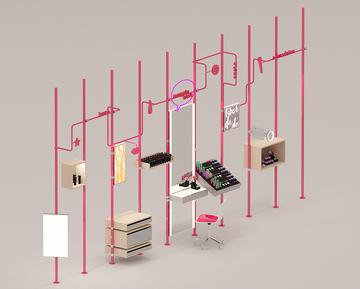 The product groups are easily identifiable and organized by the modulation of the tubular structure and the design solutions – typography and pictograms. The vertical elements in cherry color establish a vertical connection between the storage and display elements, guiding the eye and providing continuity in the reading.
