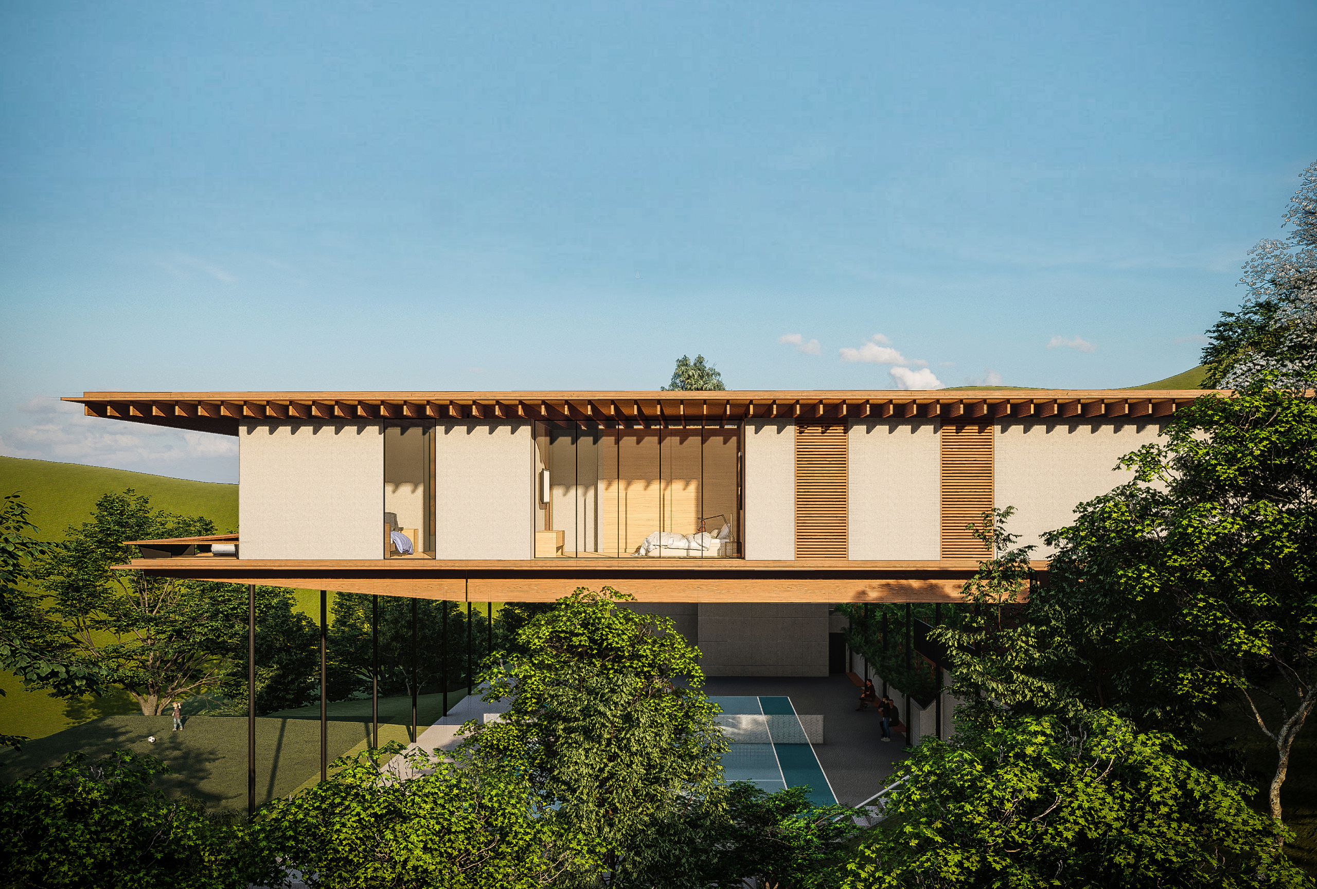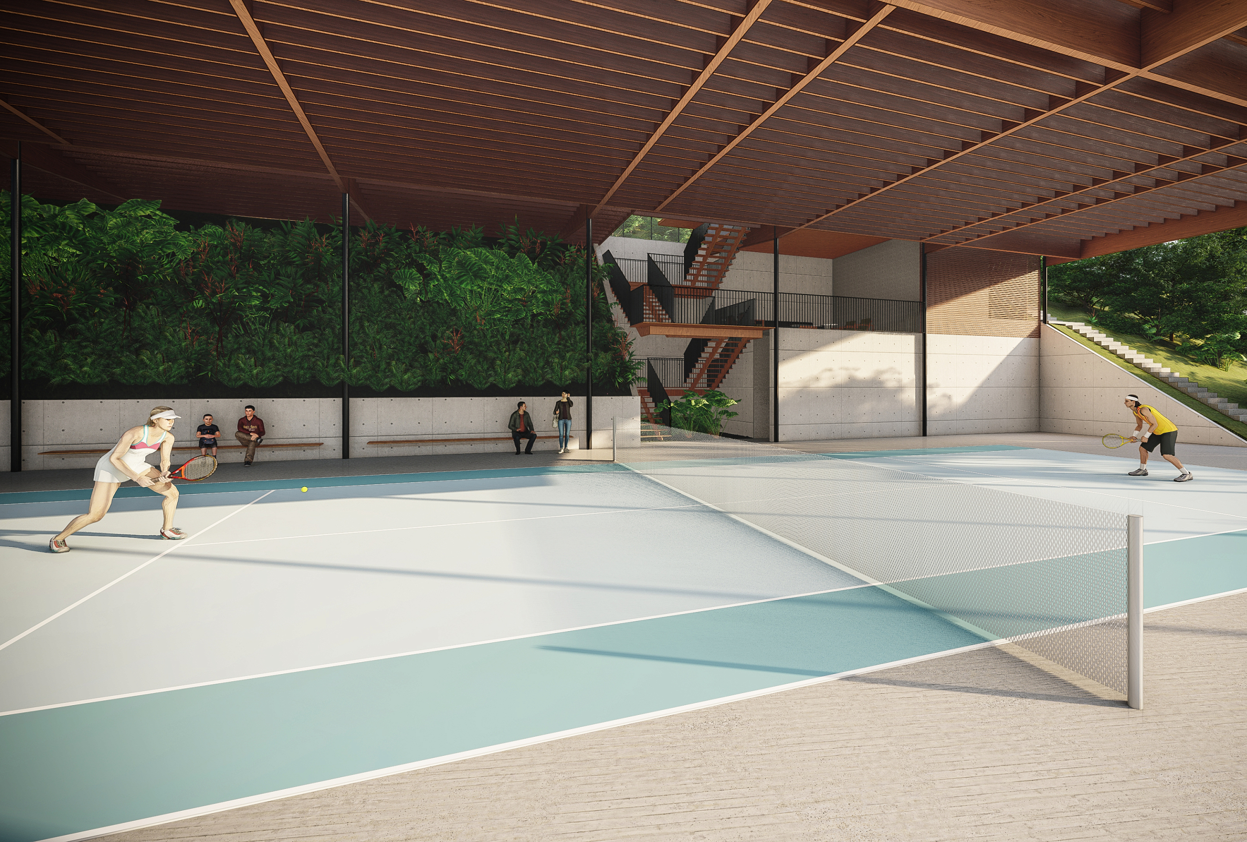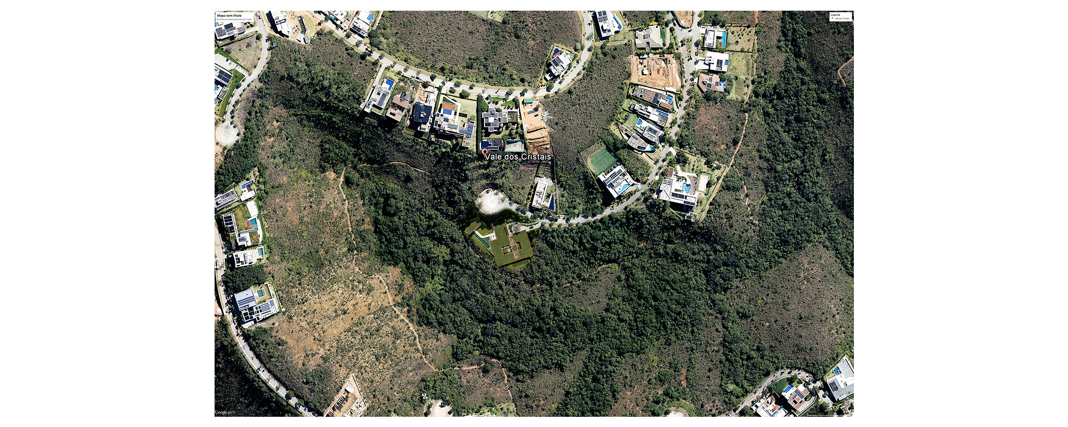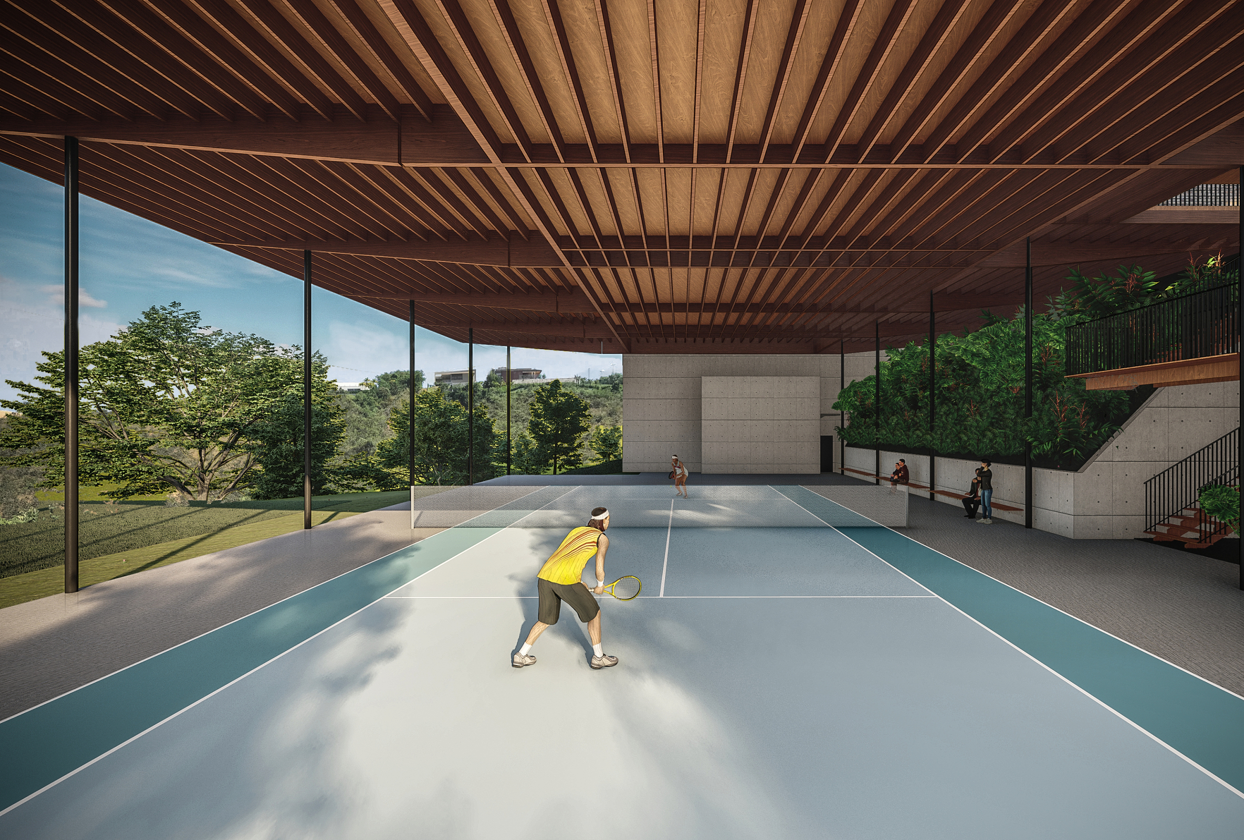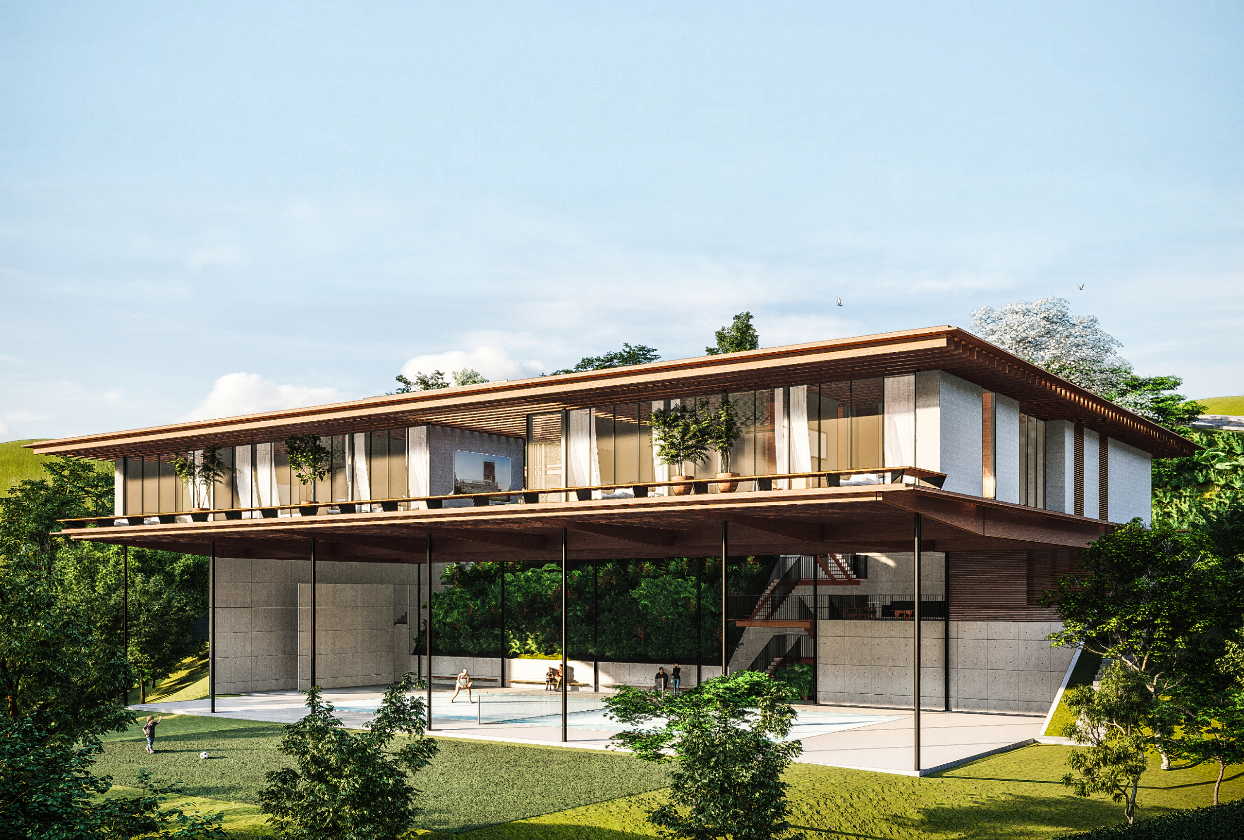 Nova Lima, MG, Brasil 2020A casa Vale dos Cristais foi projetada para uma família de aficionados por tênis, em um terreno com cerca de 4.800m² e forte declive, no final de uma rotatória no Vale dos Cristais. O programa com cerca de 800m² da casa se desenvolve em apenas um nível, e basicamente coincide com as dimensões da quadra (20 x 40m), funcionando também como sua cobertura (com pé-direito de 9m).