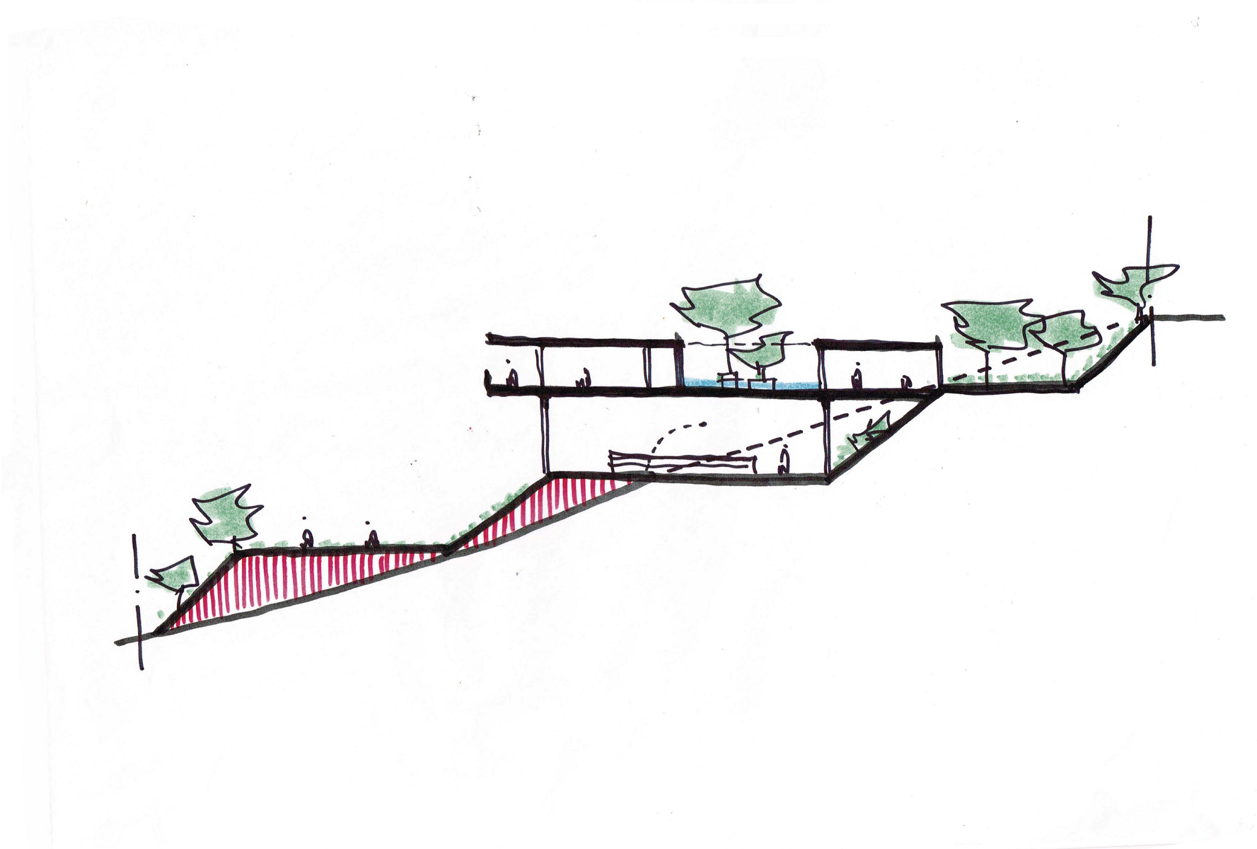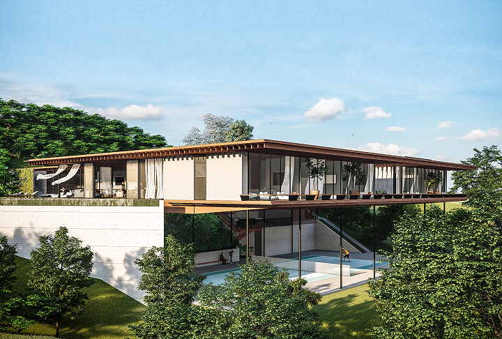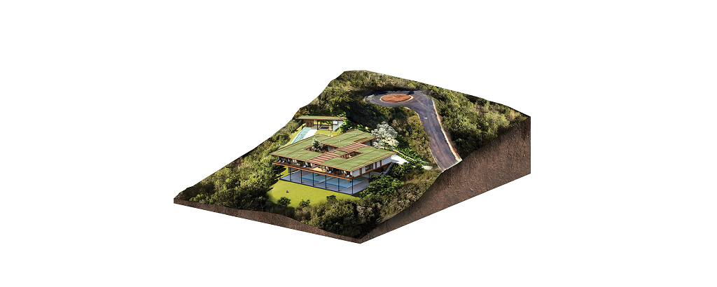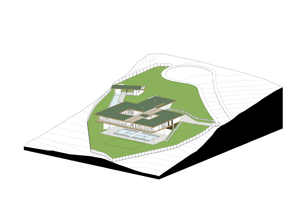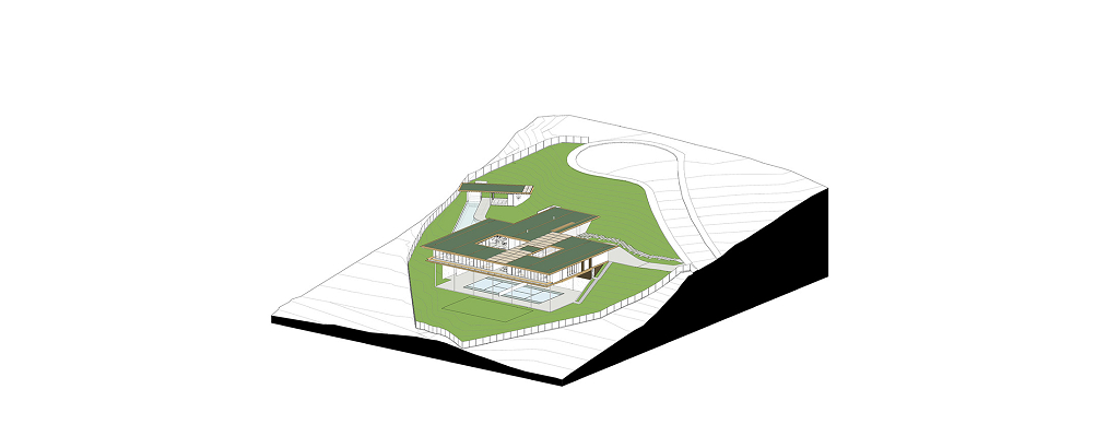 A casa se organiza em torno de um pátio central, orientada diagonalmente de acordo com as curvas de nível de Norte a Sul, aproveitando as vistas do Vale a partir do platô no nível médio do lote, sendo sua construção mal percebida a partir da rua. Uma piscina e uma edícula complementam o programa integrando a área externa do nível principal. No nível da quadra, áreas de apoio e de serviço permitem que ela seja usada também para festas e eventos maiores, com acesso independente.