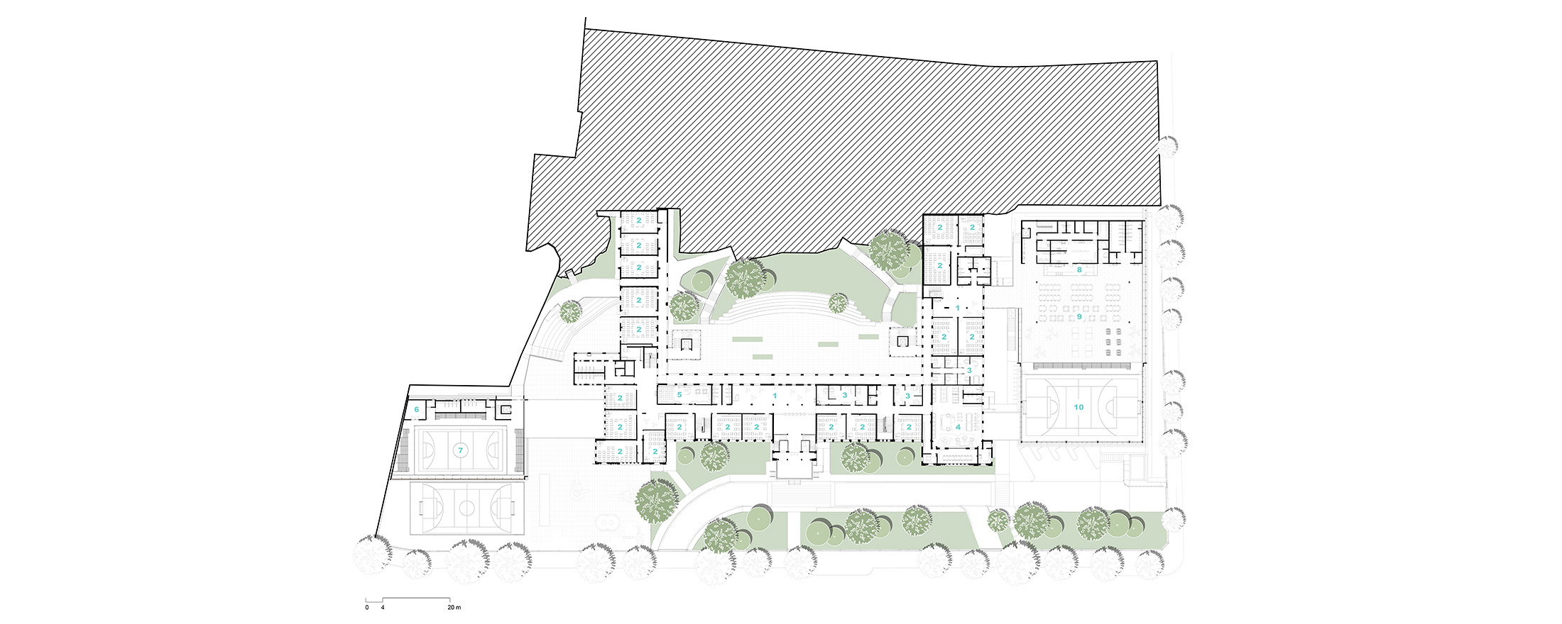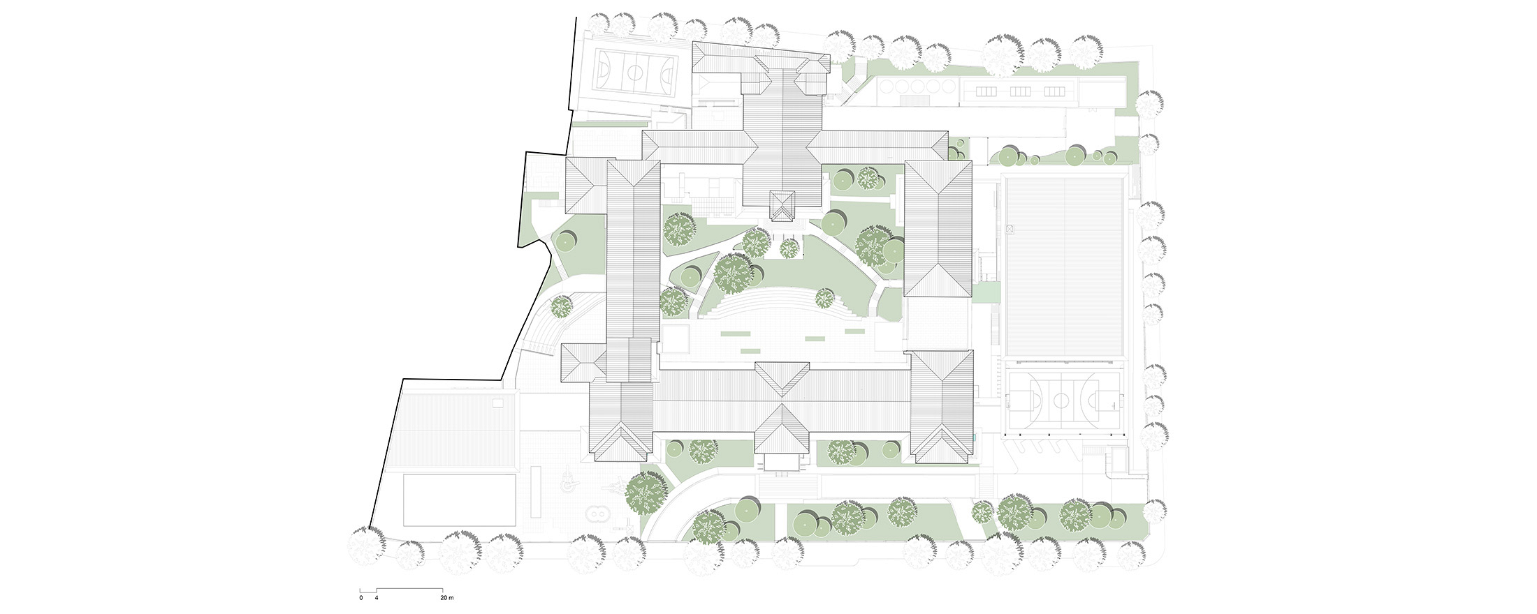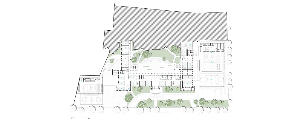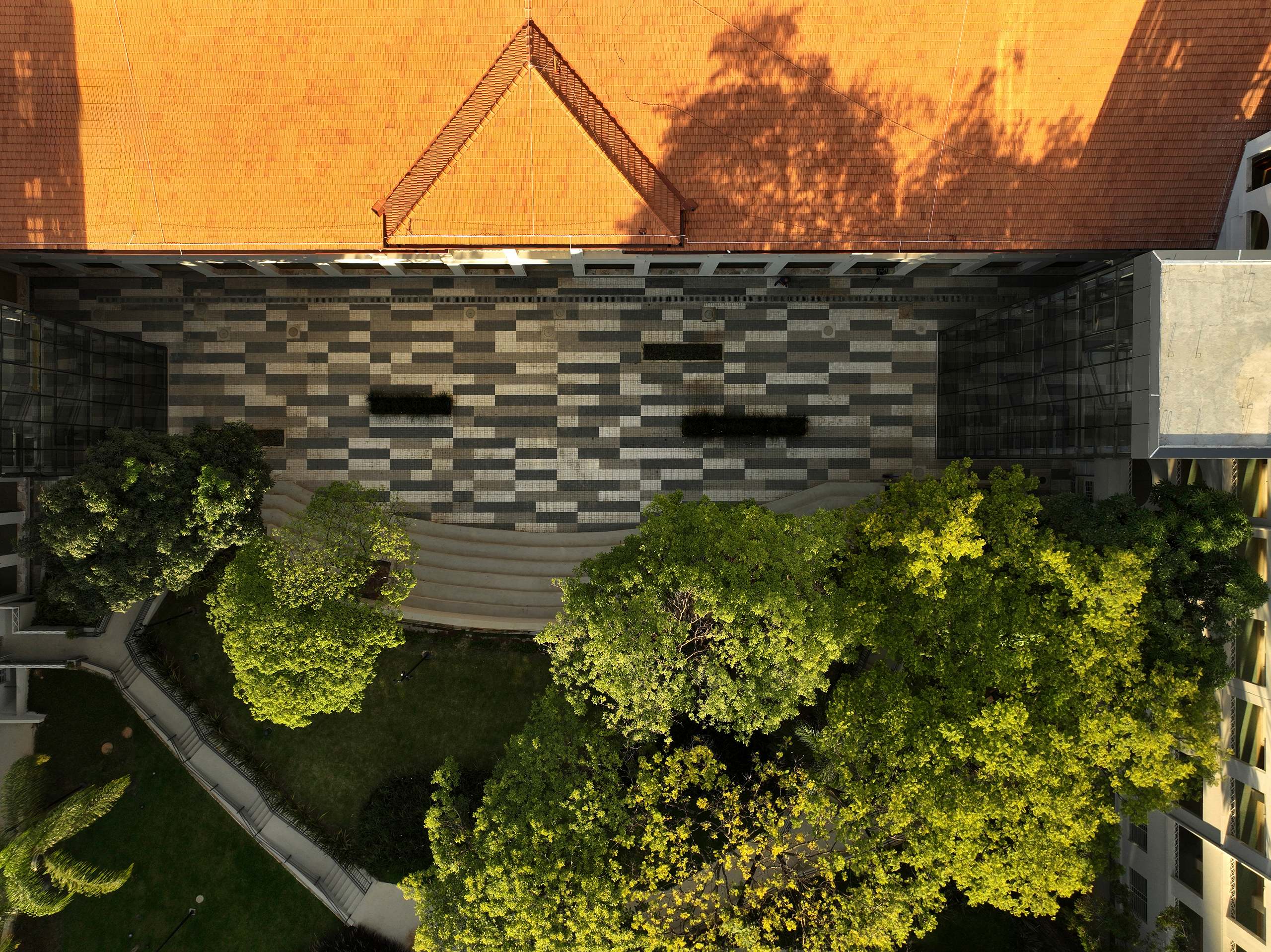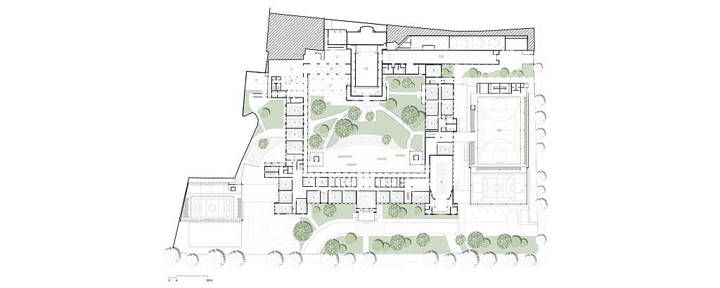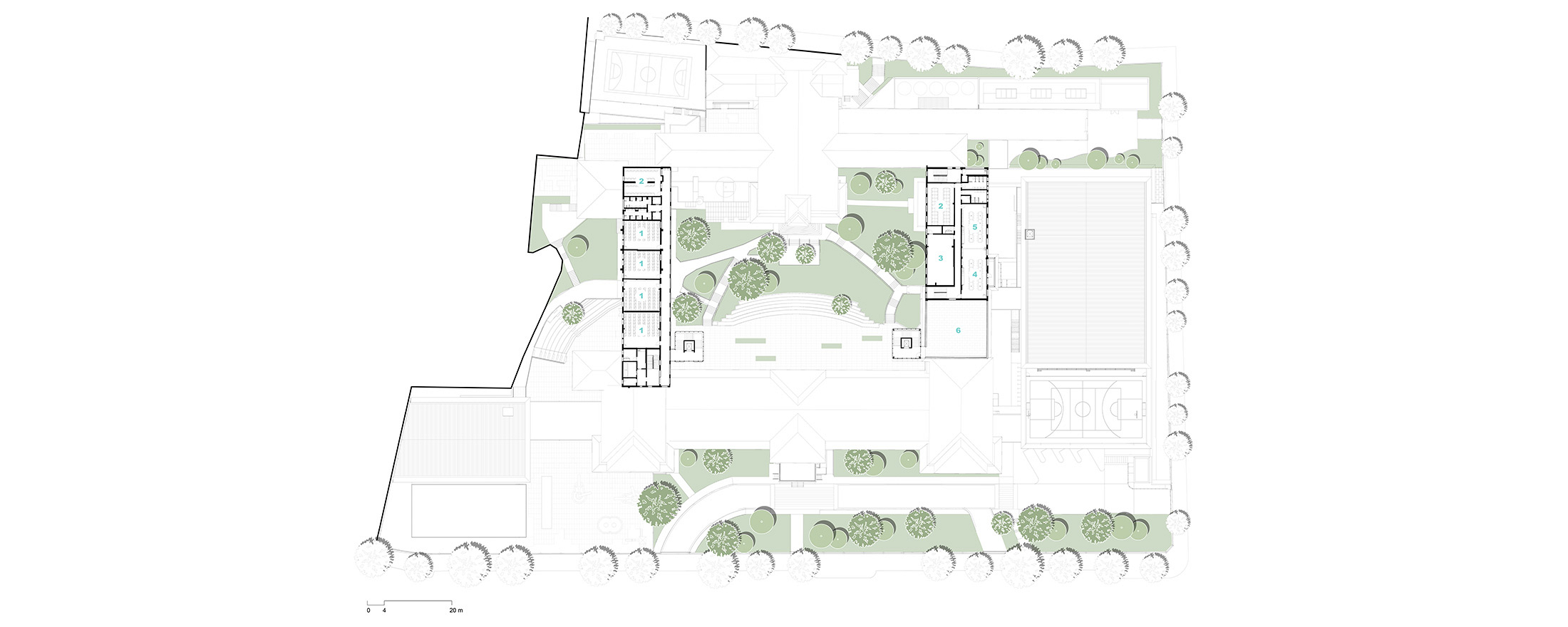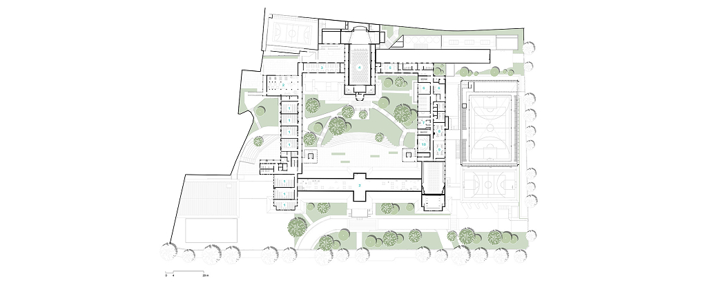 As diretrizes de intervenção foram divididas em três áreas distintas no terreno, que precisavam se integrar de forma harmoniosa para garantir o bom funcionamento da instituição. A primeira é a “Área de Preservação Permanente”, onde estão situadas as edificações tombadas. Essas estruturas passaram por restaurações e adaptações para atender às novas demandas institucionais, preservando suas características arquitetônicas originais. A segunda é a “Área Preservação Paisagística”, que valoriza suas características vegetativas e contemplativas, aprimorando a qualidade paisagística do ambiente. A terceira é a “Área de Expansão”, destinada à construção de novos anexos e equipamentos, que complementam as edificações tombadas e as áreas livres permeáveis e buscam uma integração harmoniosa de todo o conjunto.