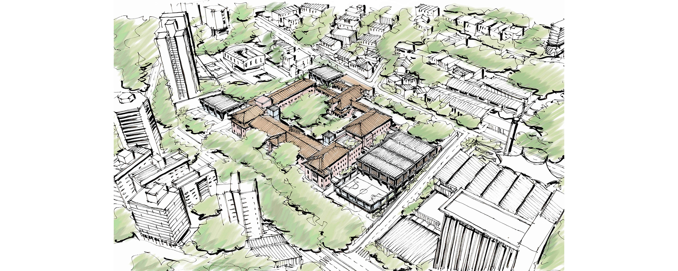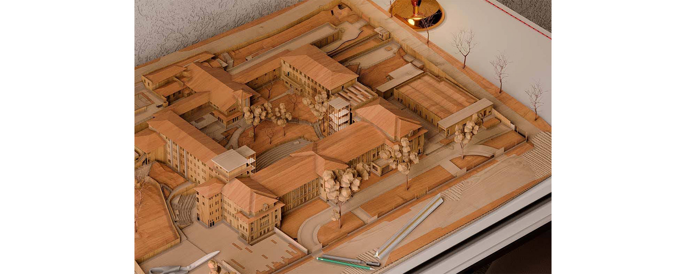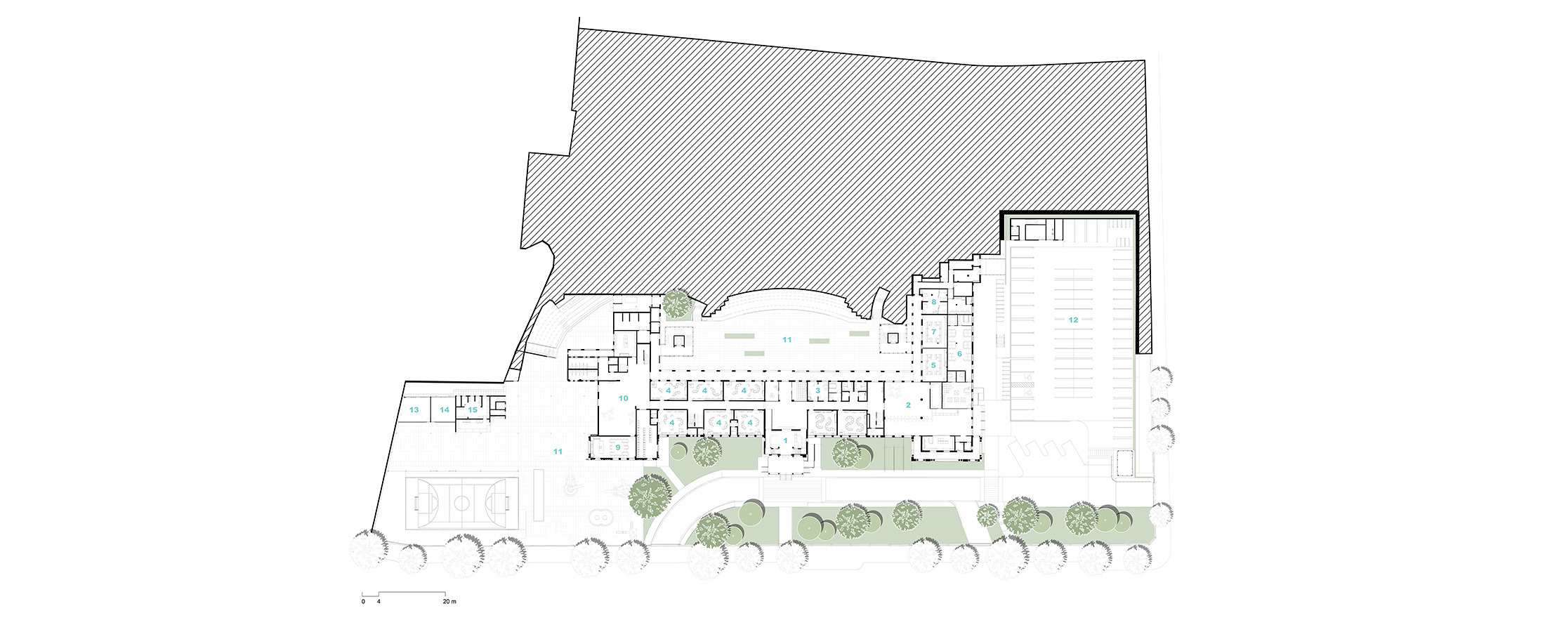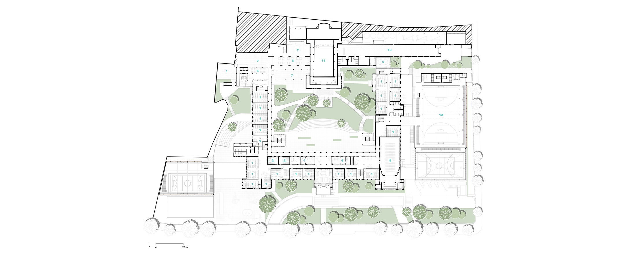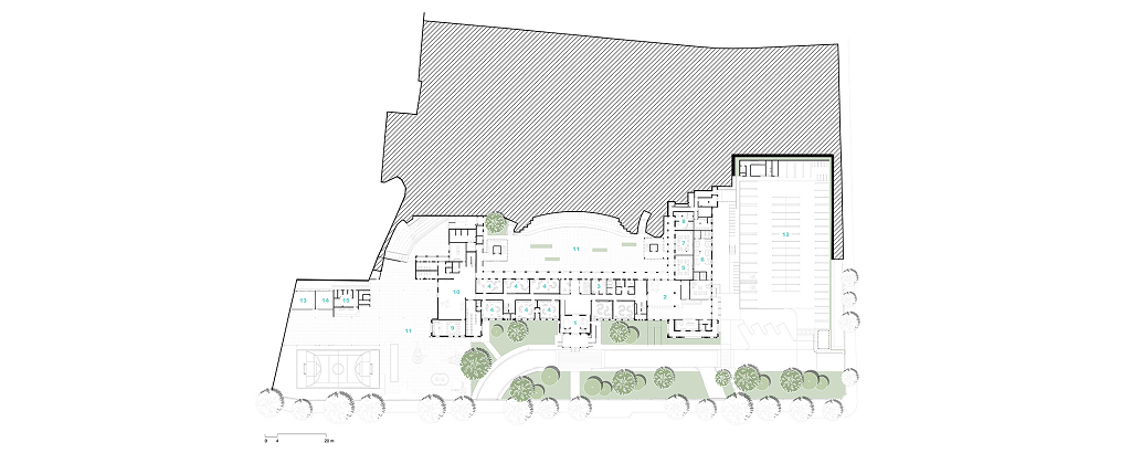 As diretrizes de intervenção foram divididas em três áreas distintas no terreno, que precisavam se integrar de forma harmoniosa para garantir o bom funcionamento da instituição. A primeira é a “Área de Preservação Permanente”, onde estão situadas as edificações tombadas. Essas estruturas passaram por restaurações e adaptações para atender às novas demandas institucionais, preservando suas características arquitetônicas originais. A segunda é a “Área Preservação Paisagística”, que valoriza suas características vegetativas e contemplativas, aprimorando a qualidade paisagística do ambiente. A terceira é a “Área de Expansão”, destinada à construção de novos anexos e equipamentos, que complementam as edificações tombadas e as áreas livres permeáveis e buscam uma integração harmoniosa de todo o conjunto.