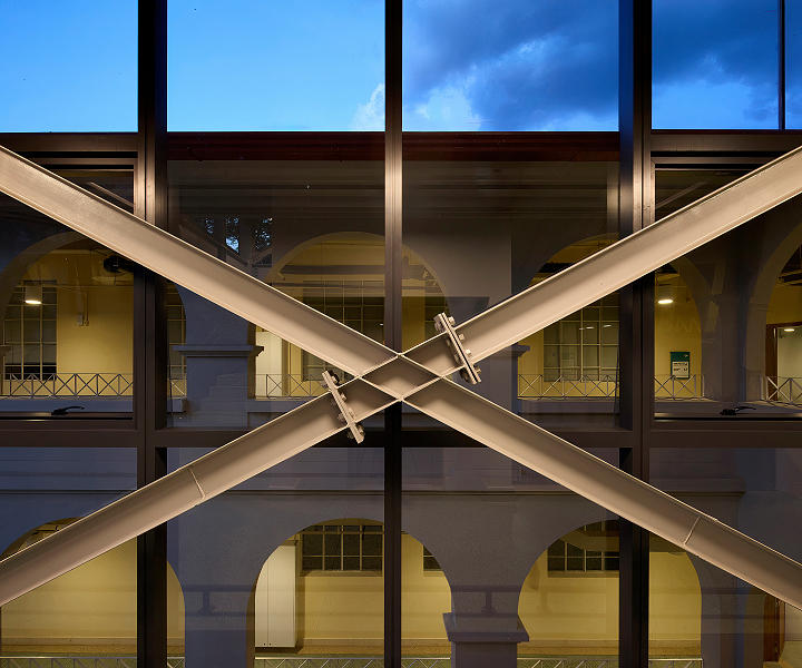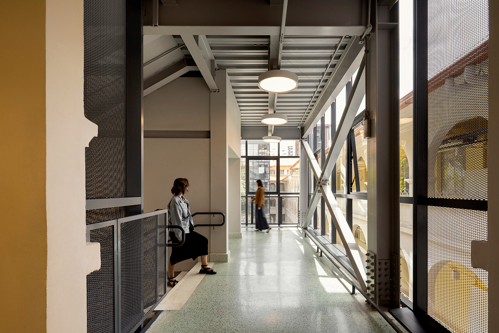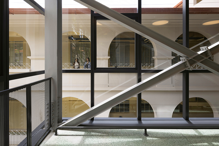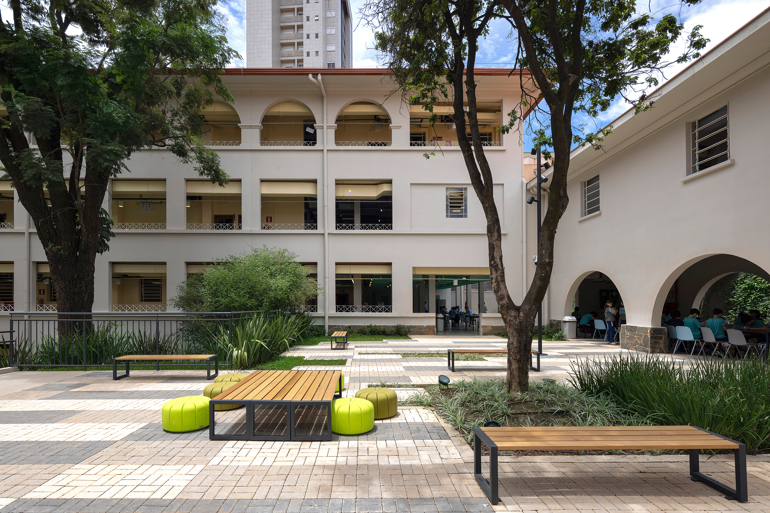 Durante a reforma, as potencialidades do edifício foram reforçadas. As esquadrias originais, em madeira e ferro, foram restauradas ou complementadas de acordo com os modelos originais. O pátio central, por exemplo, passou a atuar como um espaço aglutinador, com novo tratamento paisagístico, reforçando a presença da antiga capela, convertida em auditório, como um espaço simbólico e de referência visual no conjunto. Duas novas torres de circulação vertical, em estrutura metálica e vidro, reforçam a simetria do conjunto e garantem a acessibilidade necessária. As áreas internas com configurações e tratamentos estéticos diferenciados mereceram atenção especial, principalmente devido às demandas da preservação do patrimônio, sendo destinadas aos usos coletivos da escola, como Biblioteca, Auditório, Sala Multiuso e pátios.