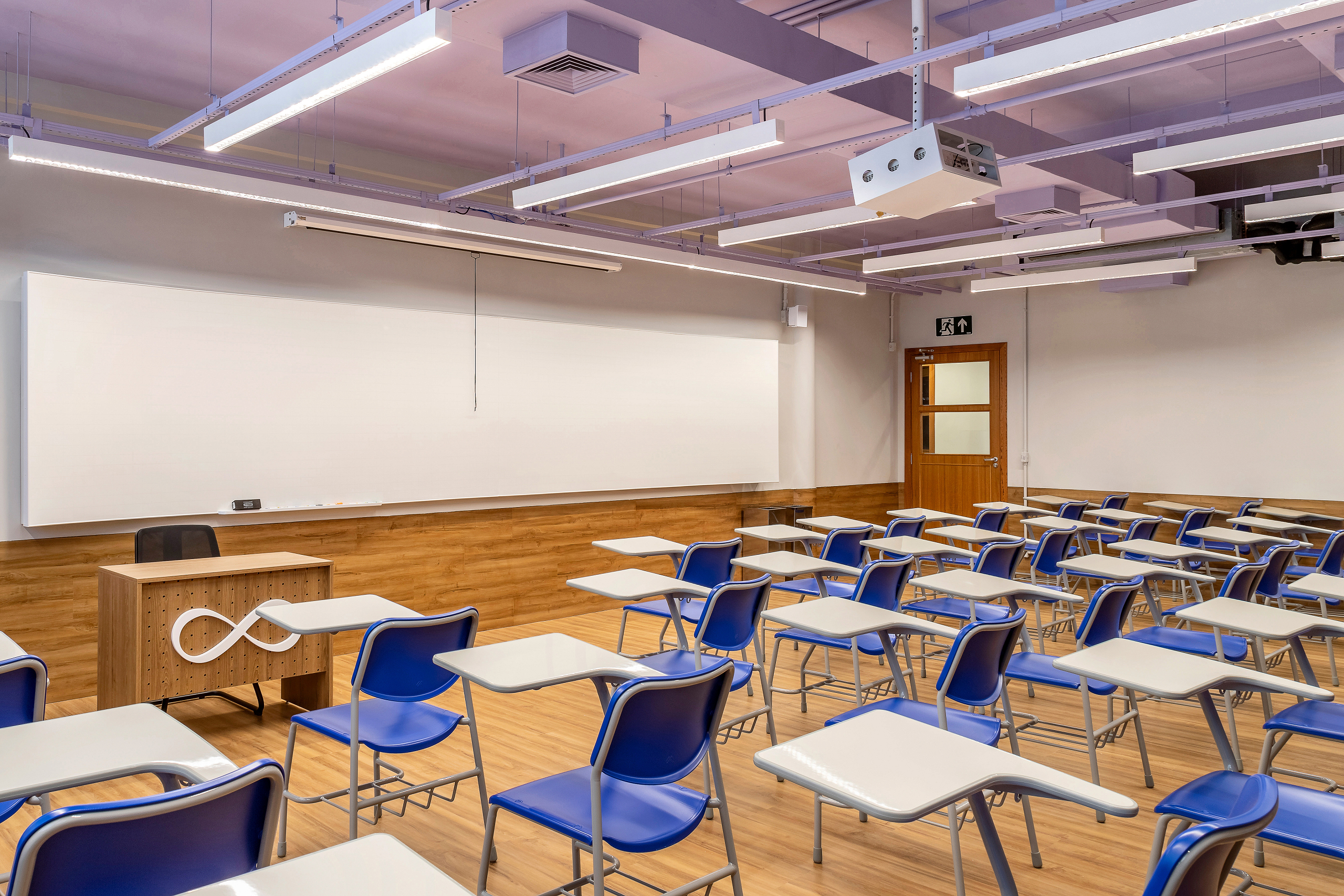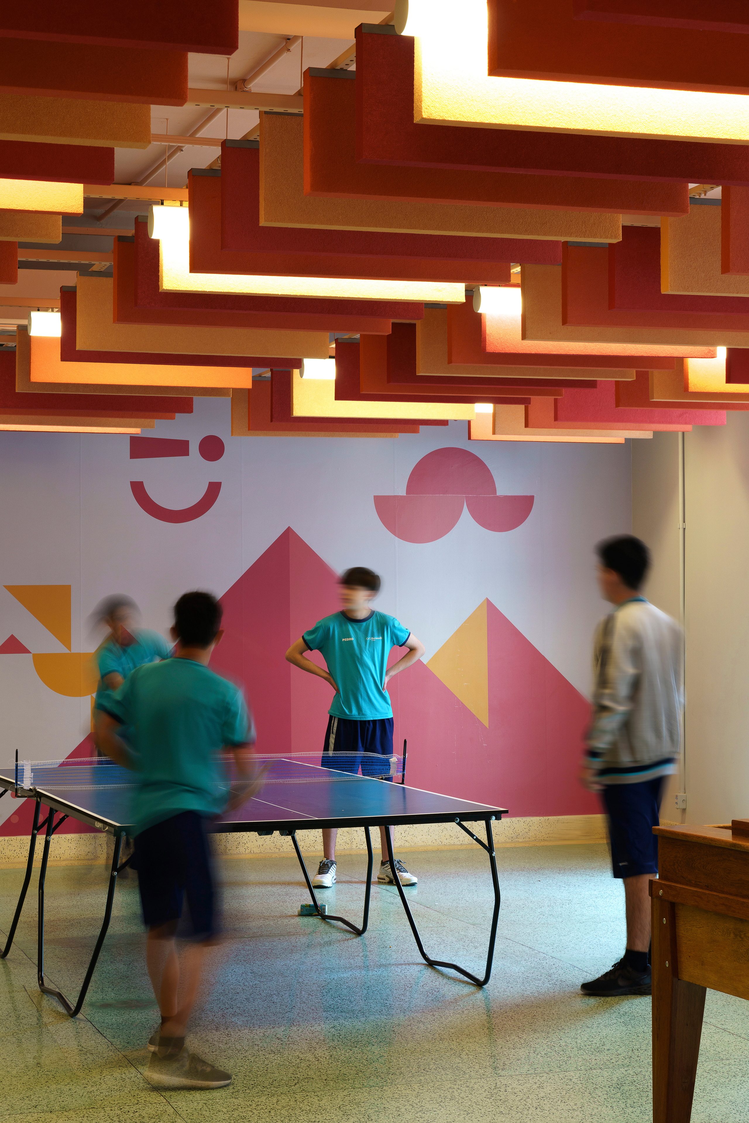 Internamente, os espaços foram reestruturados, mantendo as modulações e ritmos da estrutura existente. O design de interiores e a sinalização refletem o conceito criado para o grupo Bernoulli, evoluindo em paralelo ao crescimento acadêmico dos alunos. Cada andar é distinguido por uma cor única e painéis gráficos educacionais que destacam a cultura local com ícones e elementos da cidade. A infraestrutura do teto foi deixada exposta, facilitando a manutenção e futuras adaptações, enquanto se integra harmoniosamente ao esquema de cores da escola.