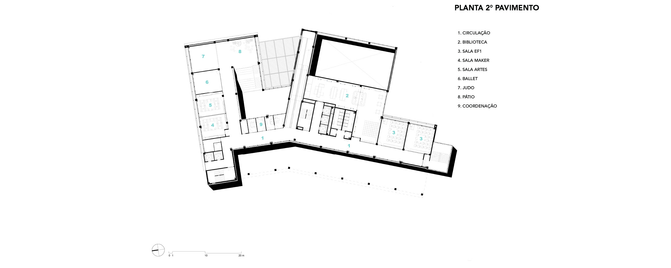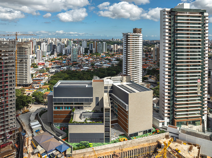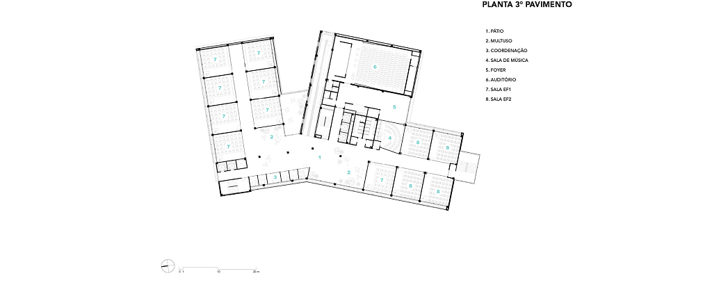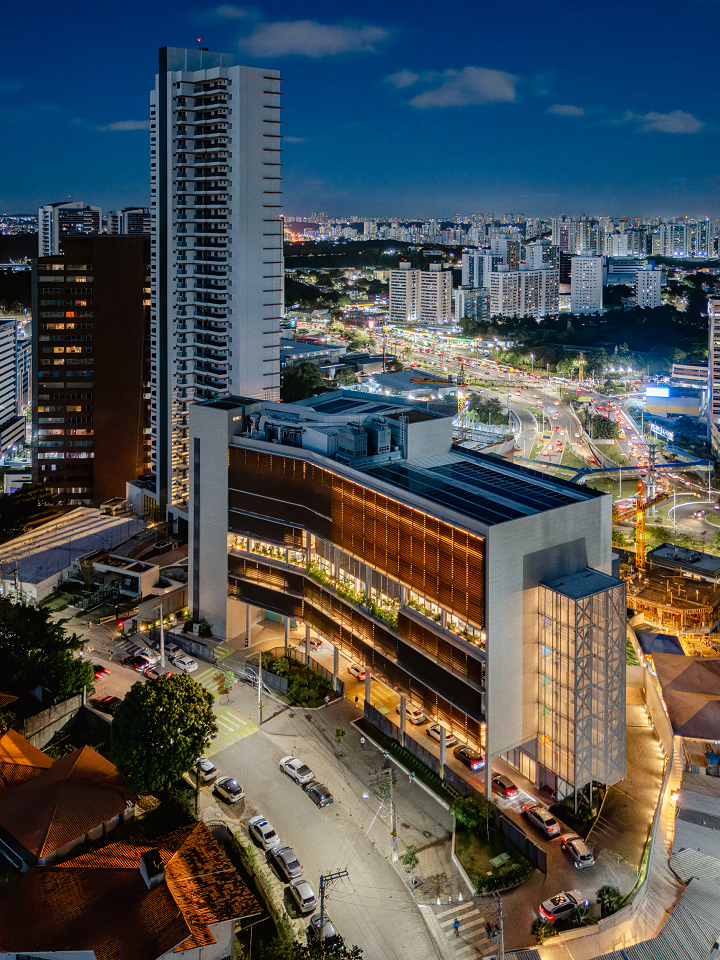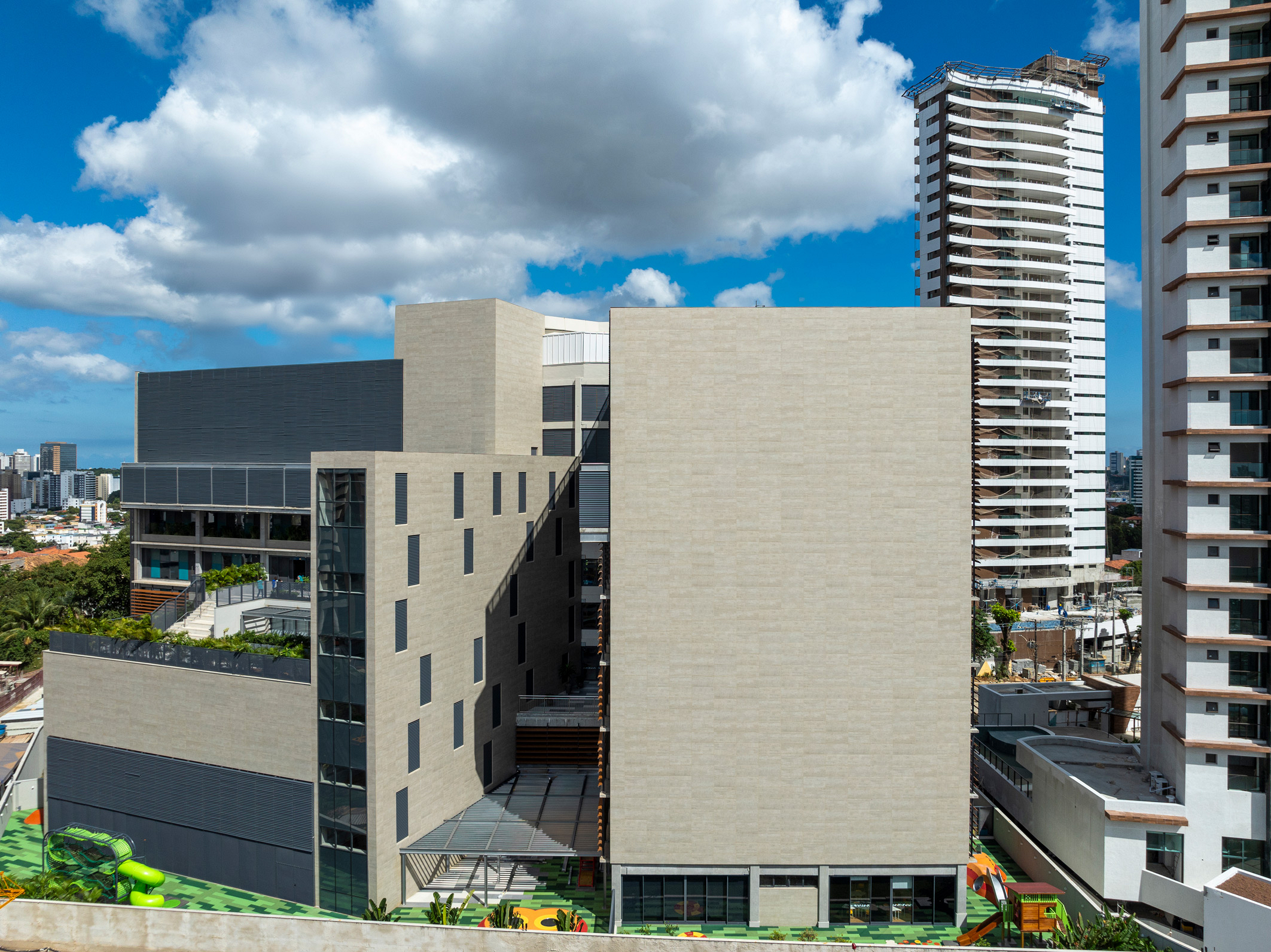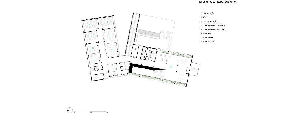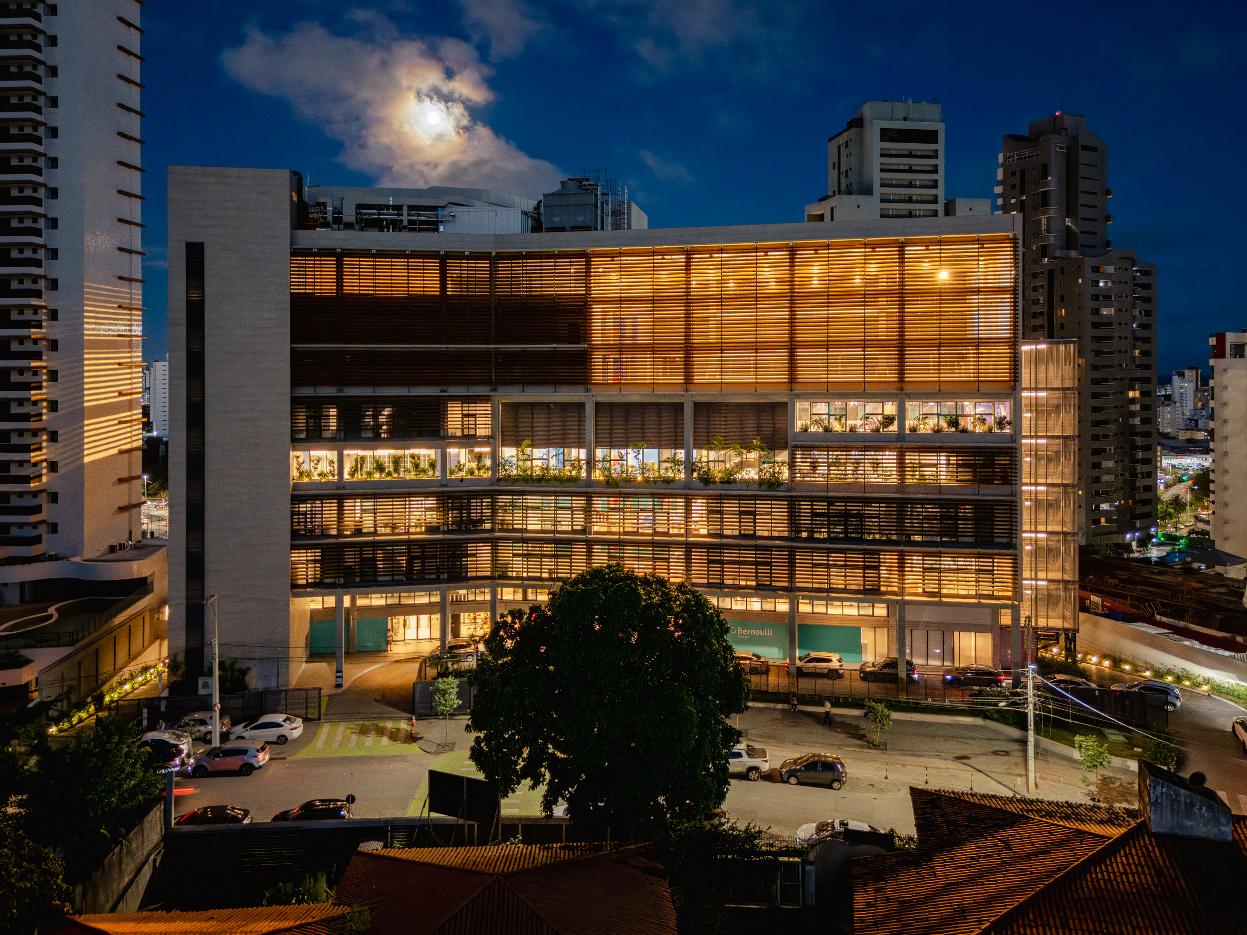 Salvador, BA, Brasil 2020-2024A modularidade e a flexibilidade como uma virtude essencial dos espaços de ensino O novo projeto do Colégio Bernoulli, assinado pela BCMF Arquitetos, está situado em Salvador, Bahia, uma região rica em tradição, história e cultura, com exuberante paisagem natural. A instituição já está em funcionamento, planejada para atender mais de 1.600 alunos, desde a Educação Infantil até o Ensino Médio, servindo tanto os moradores do bairro quanto estudantes de toda a capital e arredores. A infraestrutura do colégio é abrangente, contando com pátios, ginásios e salas para artes, música, espaços maker, teatro, cozinha e horta pedagógica, promovendo um maior engajamento dos alunos em seu aprendizado. A escola tem 16.000 m² e está localizada no bairro Caminho das Árvores, na Alameda das Catabas, uma área nobre da cidade. Com aproximadamente 4.200 m², o terreno é praticamente plano e está em um ponto elevado, oferecendo amplas vistas para o leste, de onde se pode apreciar o skyline de Salvador. A geometria irregular do lote, em formato trapezoidal, induziu fortemente a implantação do projeto. A composição volumétrica é formada por dois blocos principais ortogonais de sete andares, um ao norte e outro ao sul, dispostos em um ângulo de 20 graus para acompanhar a curva da Alameda, abrindo-se para a paisagem a leste. O Bloco Norte, com cerca de 20 m de frente por 40 m de profundidade, abriga salas de aula e atividades para os Ensinos Infantil, Fundamental 1 e 2, além de áreas de apoio e recreação. O Bloco Sul é subdividido em dois blocos escalonados, contendo salas de aula, quadra coberta, espaços administrativos, biblioteca, auditório e áreas recreativas, sendo os conectados por rampas que integram todos os pavimentos.