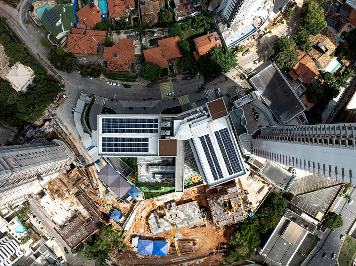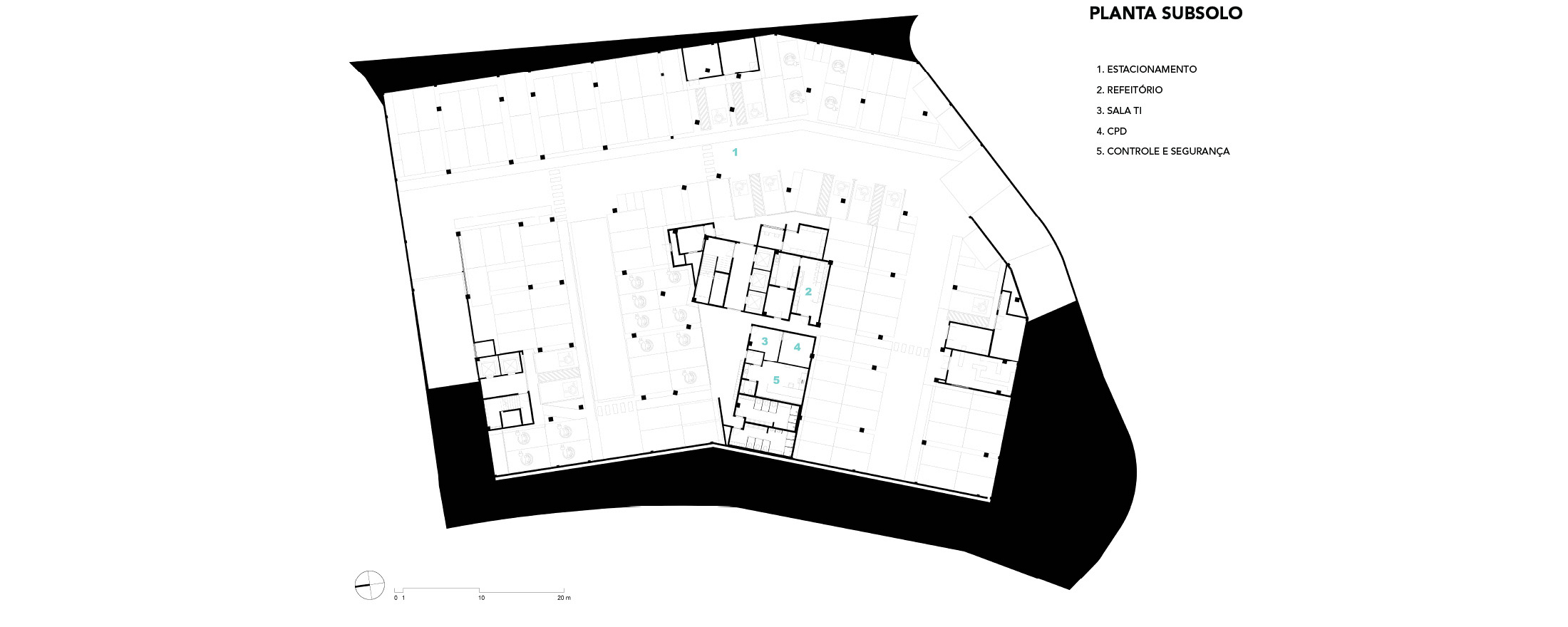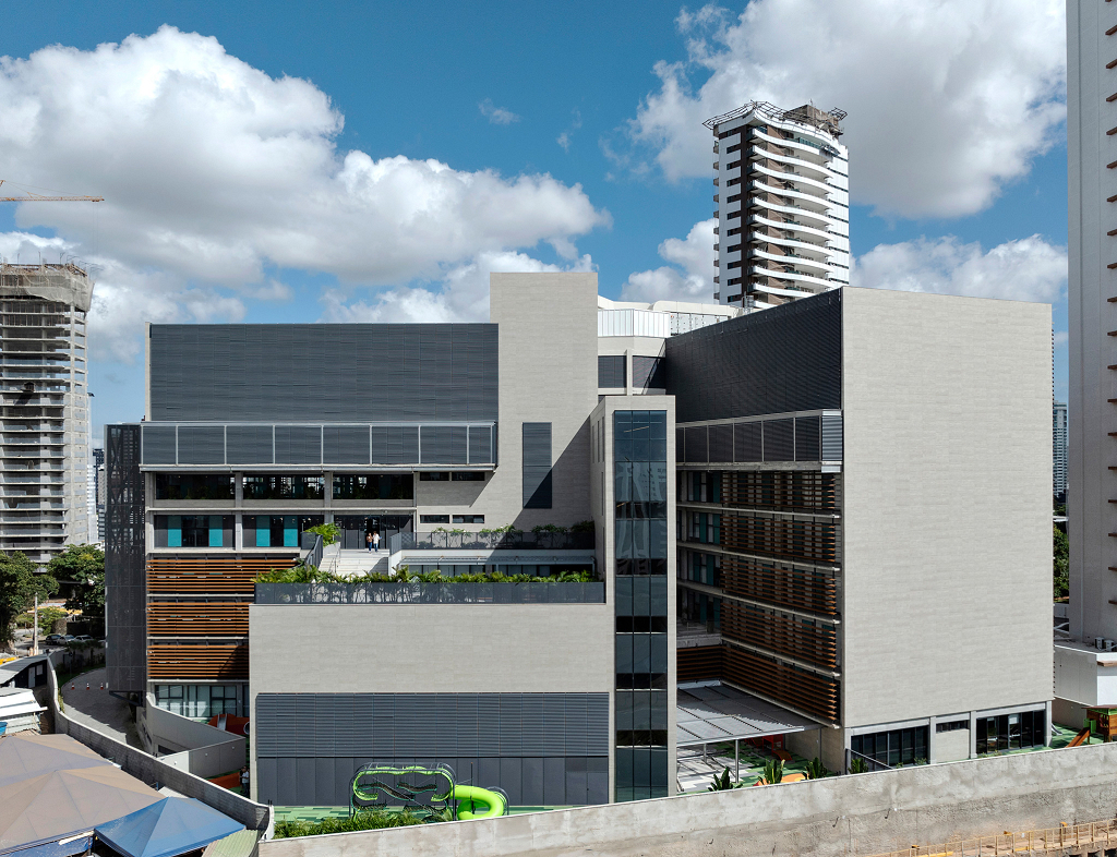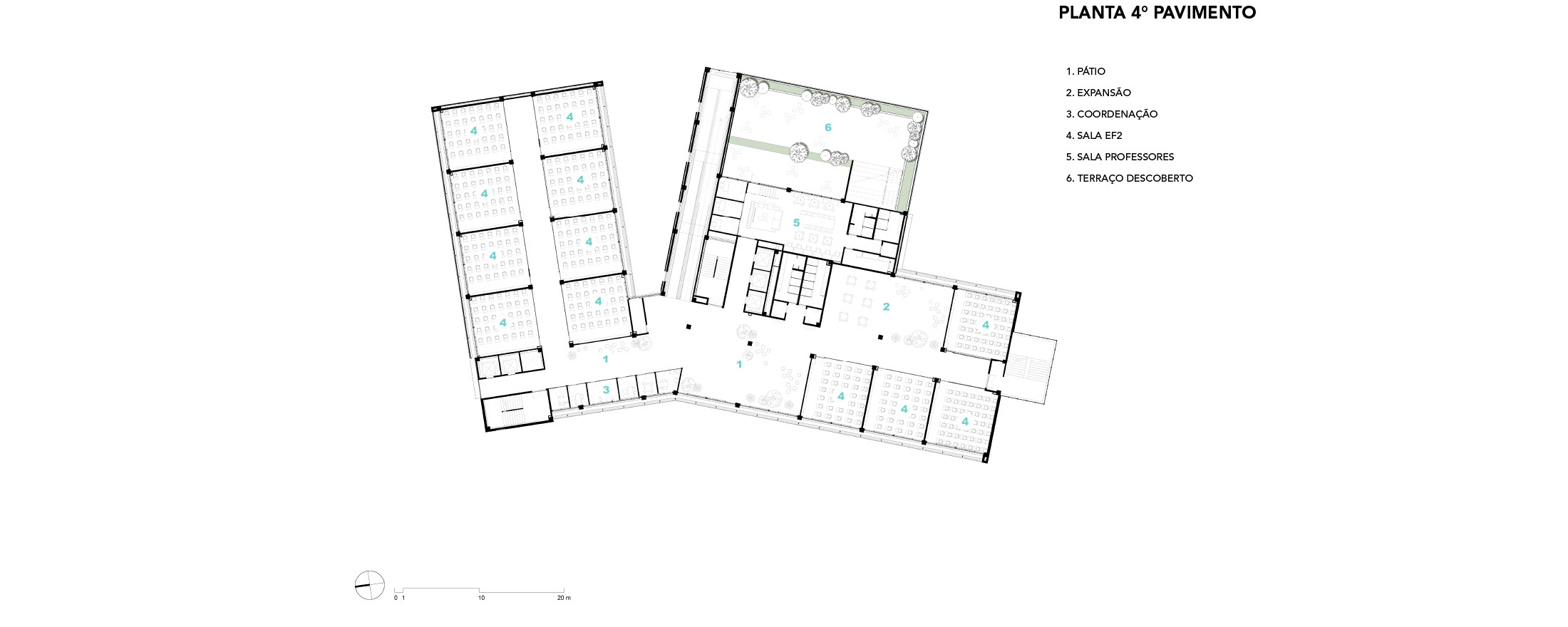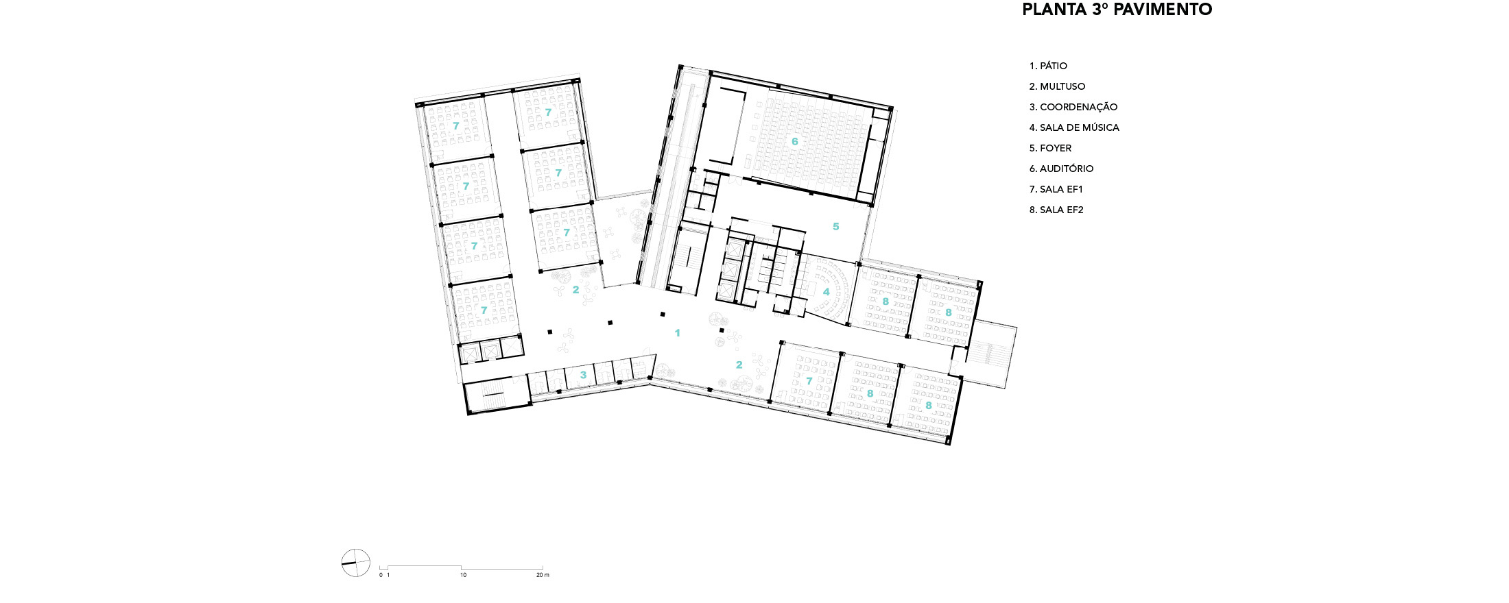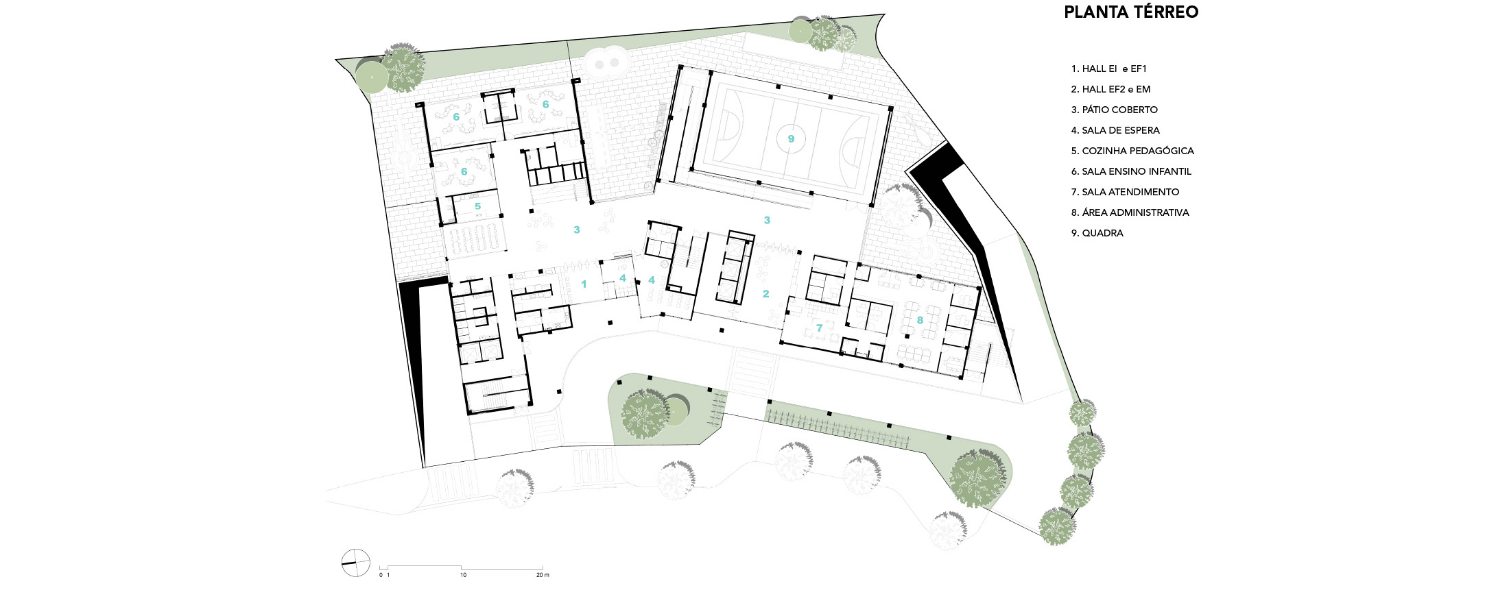 Salvador, BA, Brasil 2020-2024A modularidade e a flexibilidade como uma virtude essencial dos espaços de ensino O novo projeto do Colégio Bernoulli, assinado pela BCMF Arquitetos, está situado em Salvador, Bahia, uma região rica em tradição, história e cultura, com exuberante paisagem natural. A instituição já está em funcionamento, planejada para atender mais de 1.600 alunos, desde a Educação Infantil até o Ensino Médio, servindo tanto os moradores do bairro quanto estudantes de toda a capital e arredores. A infraestrutura do colégio é abrangente, contando com pátios, ginásios e salas para artes, música, espaços maker, teatro, cozinha e horta pedagógica, promovendo um maior engajamento dos alunos em seu aprendizado. A escola tem 16.000 m² e está localizada no bairro Caminho das Árvores, na Alameda das Catabas, uma área nobre da cidade. Com aproximadamente 4.200 m², o terreno é praticamente plano e está em um ponto elevado, oferecendo amplas vistas para o leste, de onde se pode apreciar o skyline de Salvador. A geometria irregular do lote, em formato trapezoidal, induziu fortemente a implantação do projeto. A composição volumétrica é formada por dois blocos principais ortogonais de sete andares, um ao norte e outro ao sul, dispostos em um ângulo de 20 graus para acompanhar a curva da Alameda, abrindo-se para a paisagem a leste. O Bloco Norte, com cerca de 20 m de frente por 40 m de profundidade, abriga salas de aula e atividades para os Ensinos Infantil, Fundamental 1 e 2, além de áreas de apoio e recreação. O Bloco Sul é subdividido em dois blocos escalonados, contendo salas de aula, quadra coberta, espaços administrativos, biblioteca, auditório e áreas recreativas, sendo os conectados por rampas que integram todos os pavimentos.