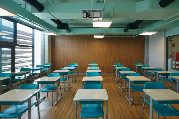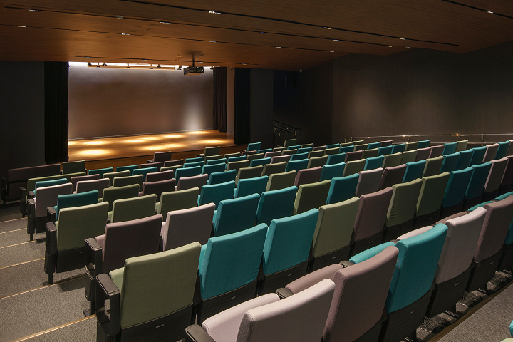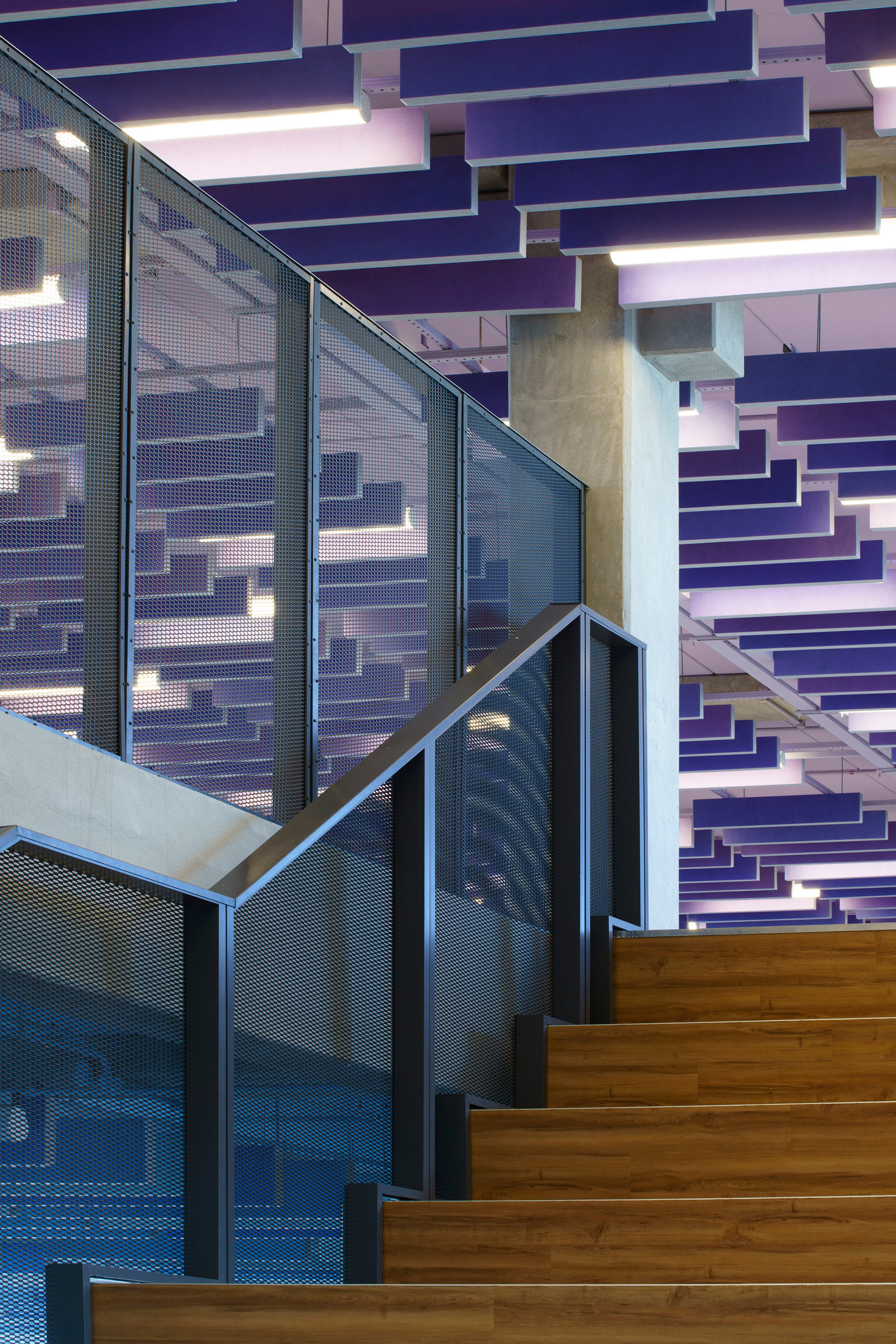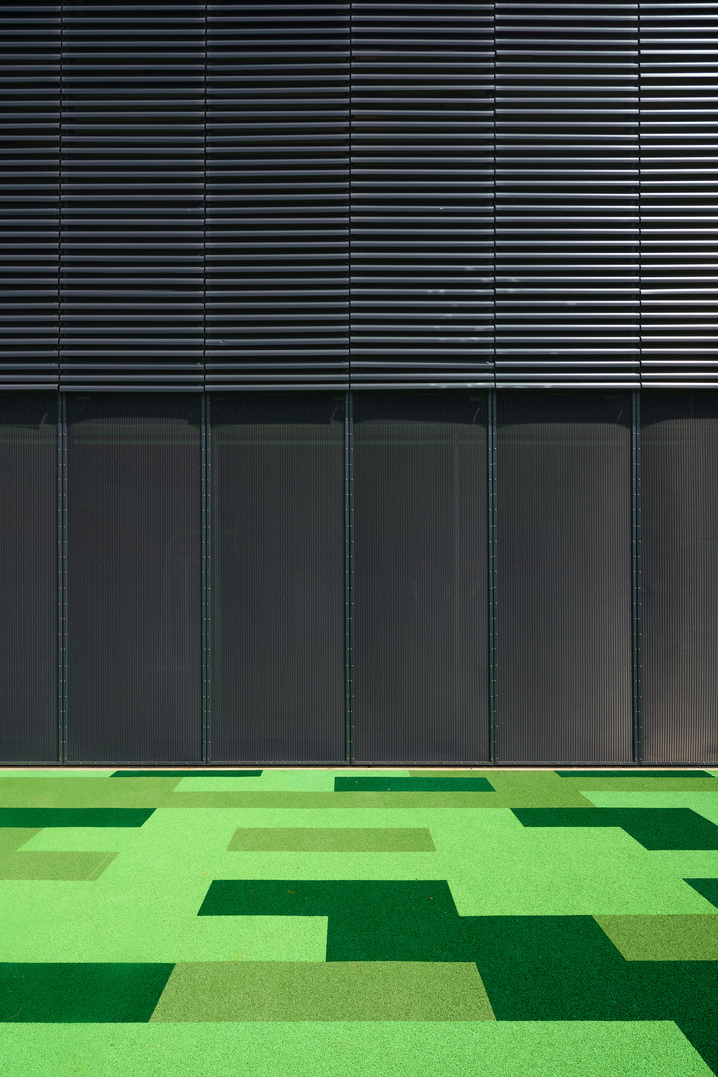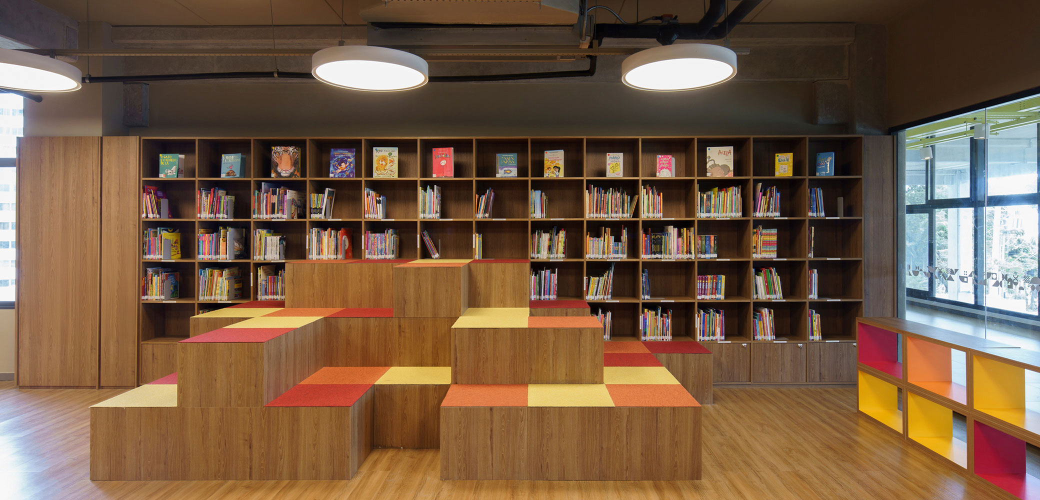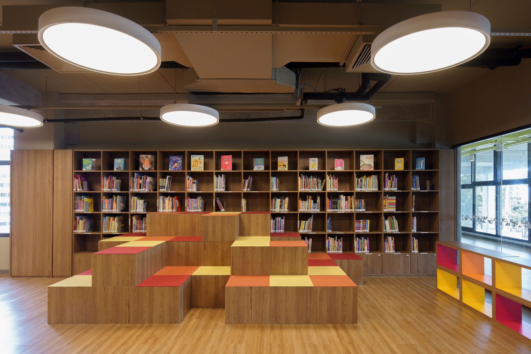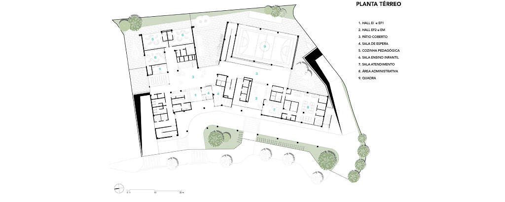 Quanto à materialidade, os volumes apresentam tratamentos equivalentes de acordo com suas funções, utilizando concreto aparente, vidro, tela metálica expandida e brises, que regulam a transparência entre interior e exterior. Terraços e espaços externos resultam da articulação dos volumes e da topografia. Os demais acabamentos de superfícies verticais e horizontais seguem a mesma paleta cromática da comunicação visual, que transita entre cores frias e quentes, refletindo a evolução dos alunos ao longo dos anos.