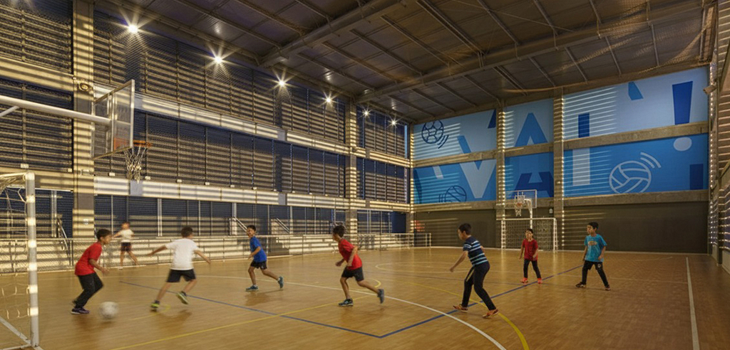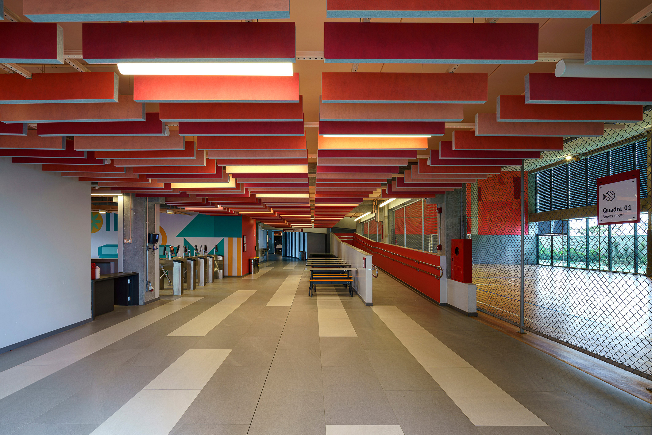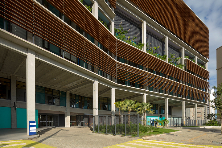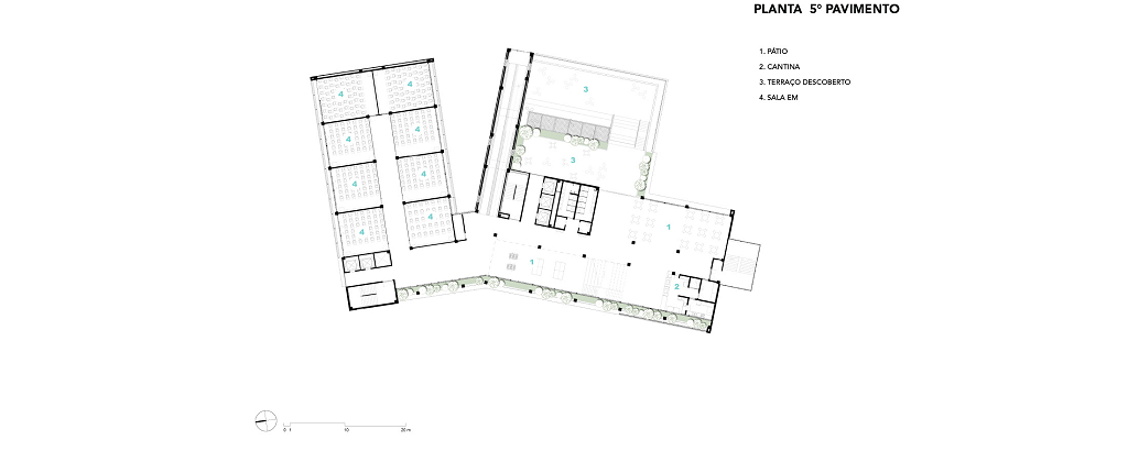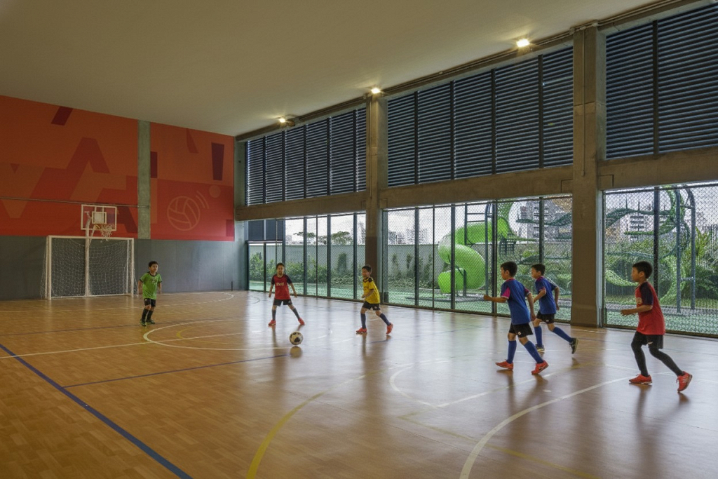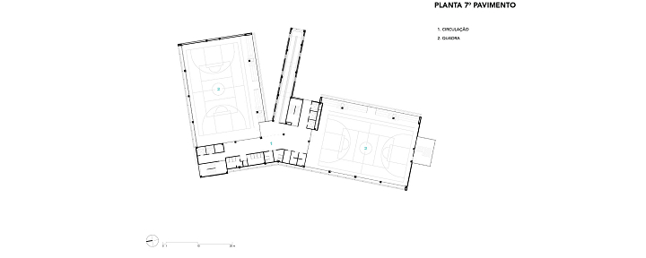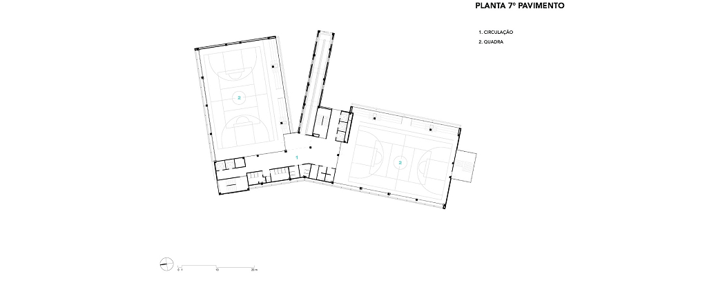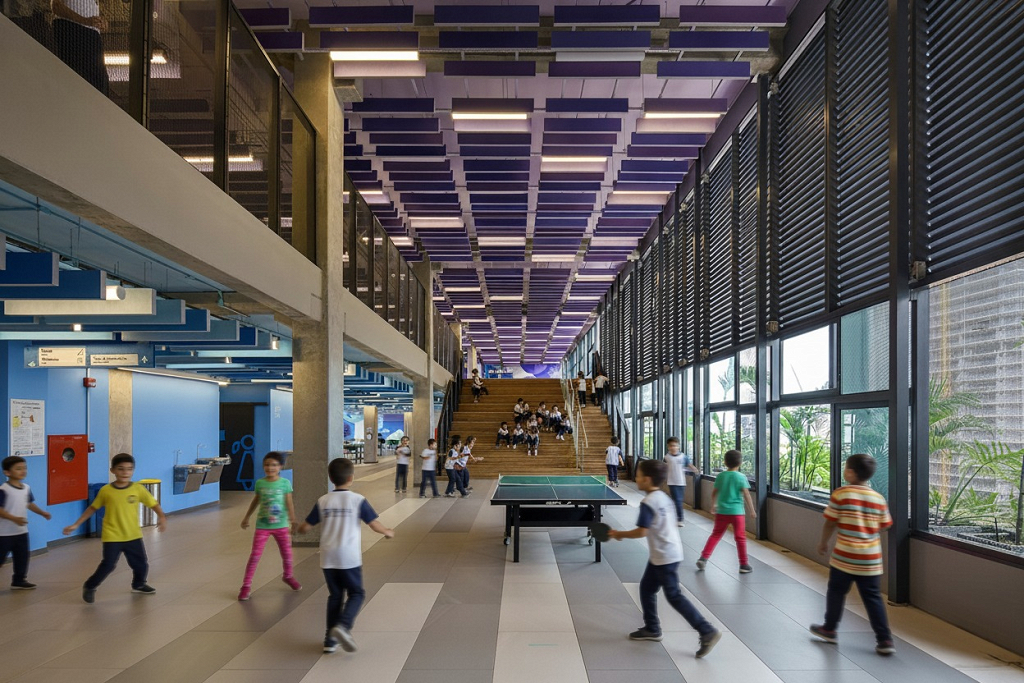 A modularidade é uma característica essencial que permite flexibilidade no uso dos espaços ao longo do tempo. A estrutura pré-fabricada em concreto possui módulos de 7,5 m, estendendo-se ao subsolo para comportar 127 vagas de garagem. No sétimo pavimento de ambos os blocos, há quadras poliesportivas cobertas, com pé-direito generoso, completando a infraestrutura. Vazios estratégicos nas fachadas enriquecem a experiência espacial e conectam os andares por meio de "escadas-arquibancadas", que também servem como áreas de descompressão e recreação. Espaços de circulação e áreas "residuais" entre blocos funcionais são projetados para usos diversos e encontros imprevistos, permitindo uma apropriação flexível do espaço.