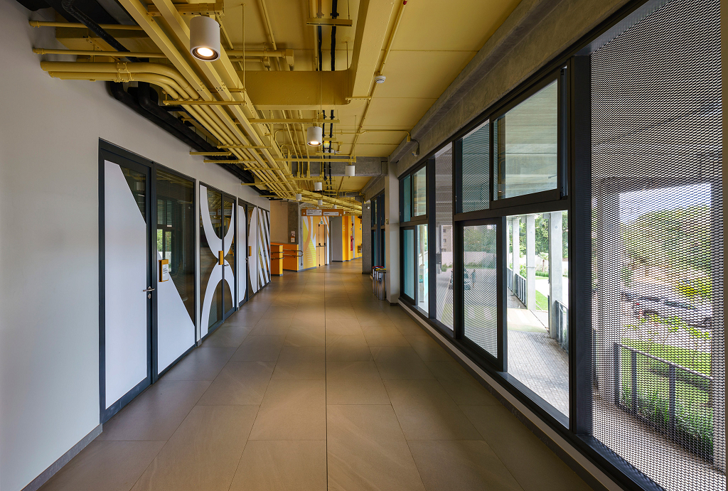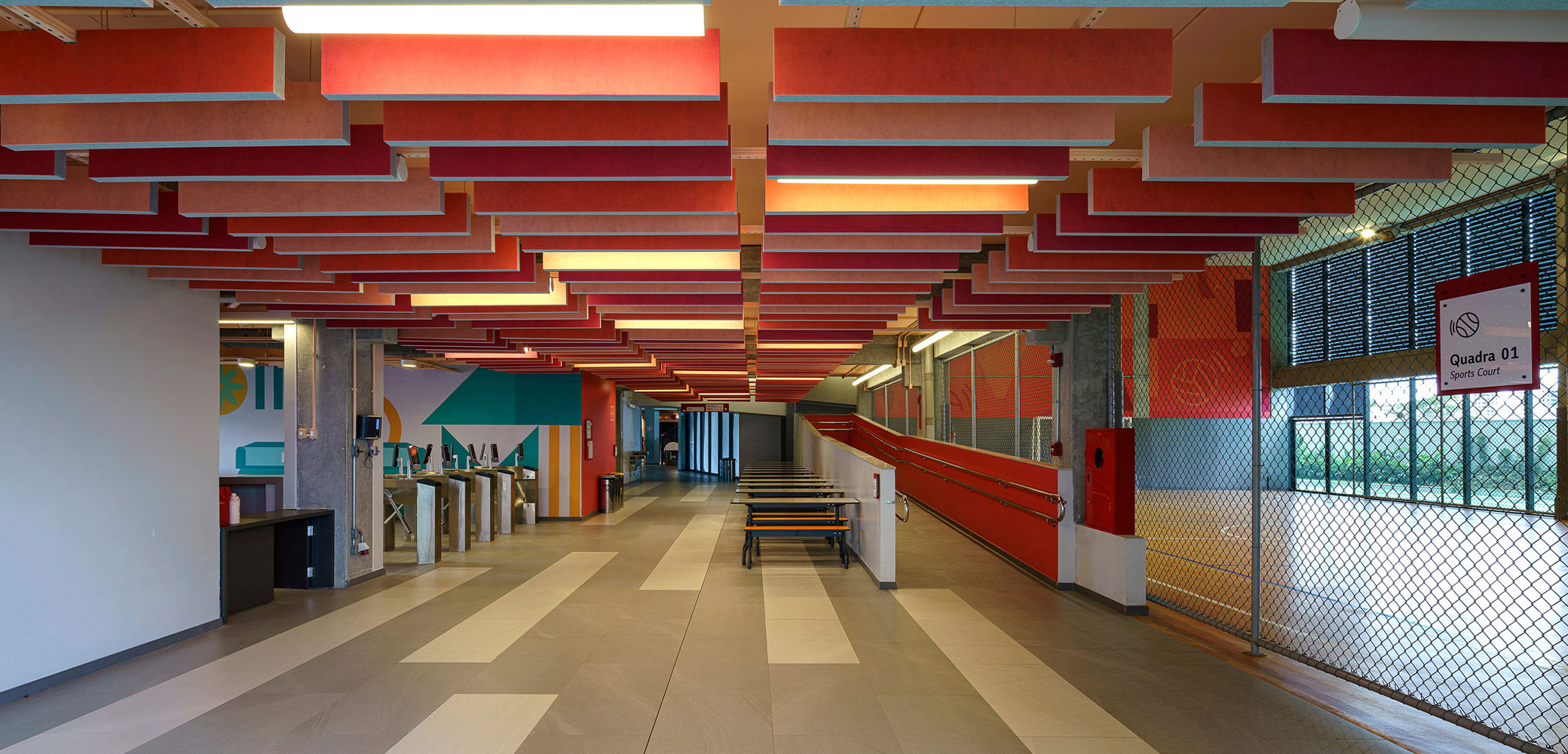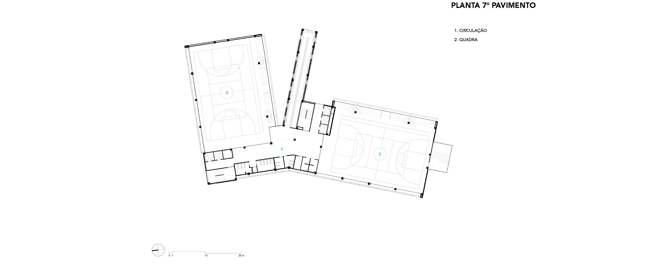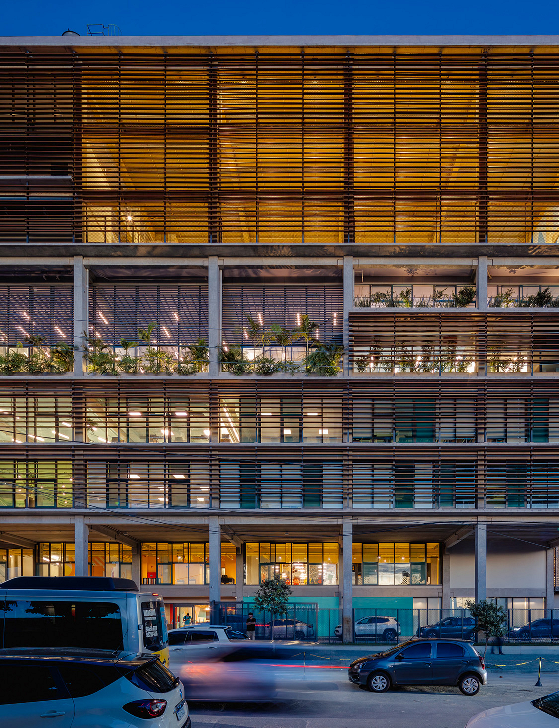 A modularidade é uma característica essencial que permite flexibilidade no uso dos espaços ao longo do tempo. A estrutura pré-fabricada em concreto possui módulos de 7,5 m, estendendo-se ao subsolo para comportar 127 vagas de garagem. No sétimo pavimento de ambos os blocos, há quadras poliesportivas cobertas, com pé-direito generoso, completando a infraestrutura. Vazios estratégicos nas fachadas enriquecem a experiência espacial e conectam os andares por meio de "escadas-arquibancadas", que também servem como áreas de descompressão e recreação. Espaços de circulação e áreas "residuais" entre blocos funcionais são projetados para usos diversos e encontros imprevistos, permitindo uma apropriação flexível do espaço.