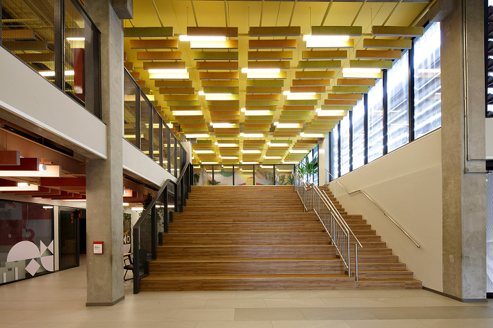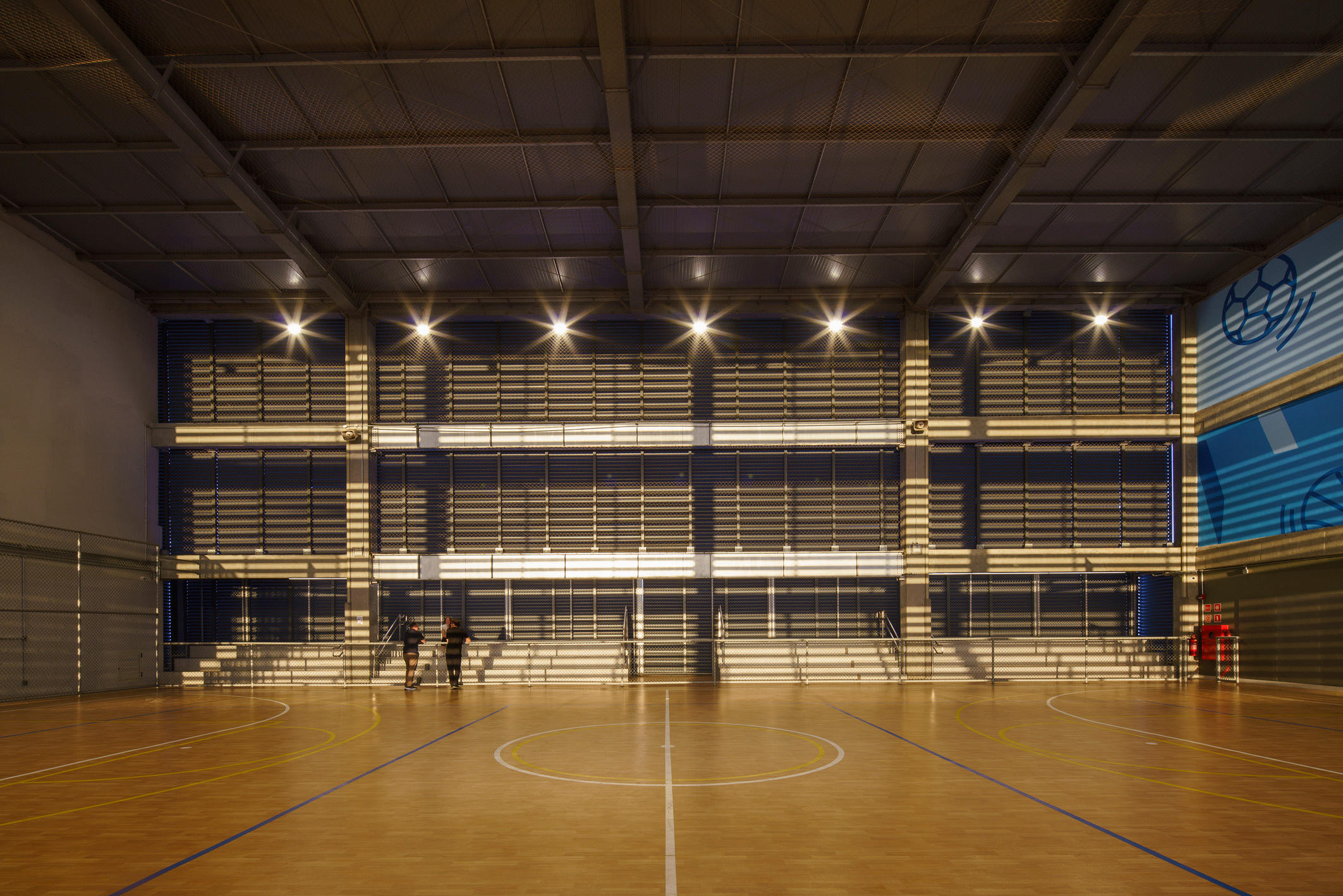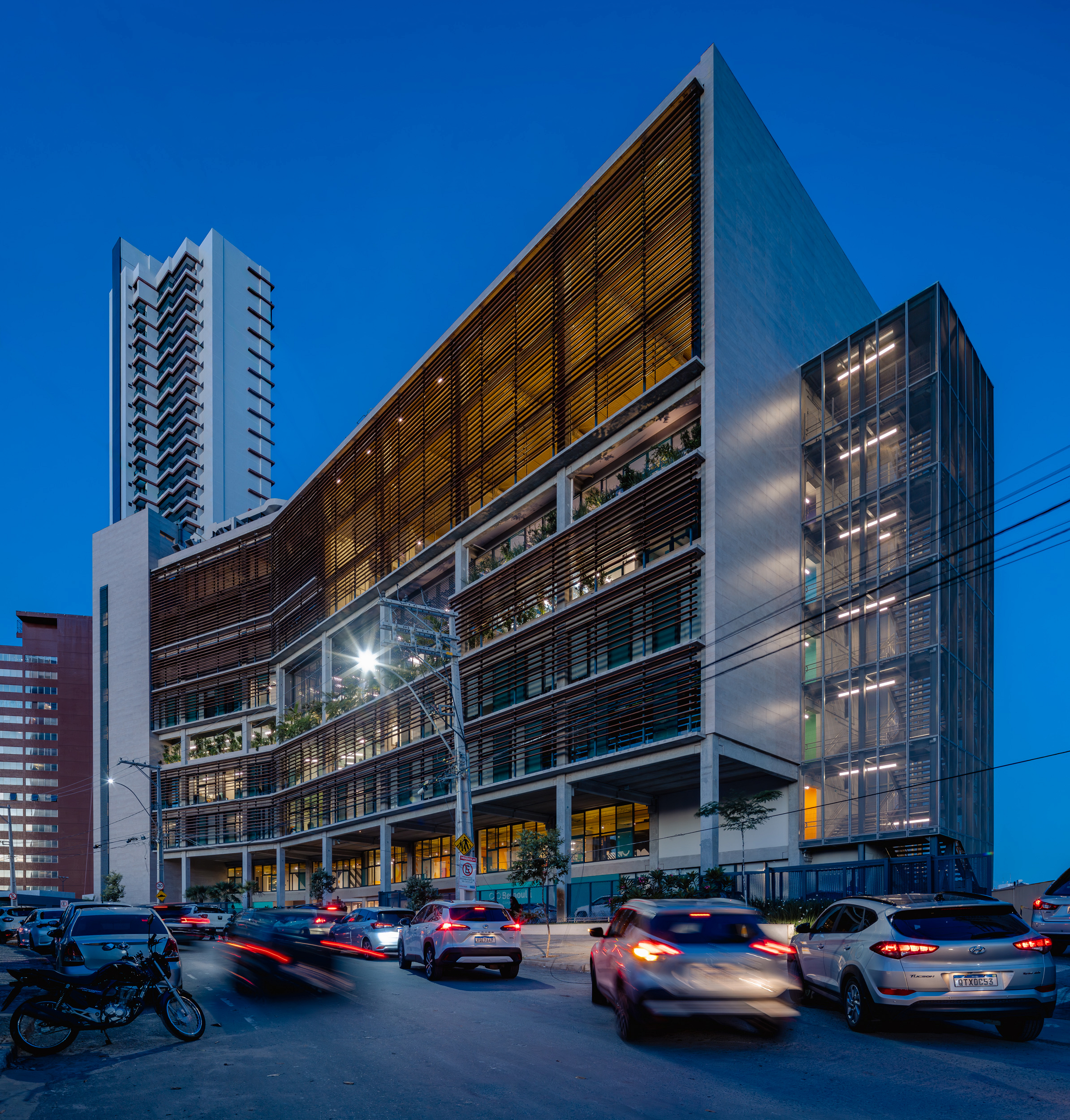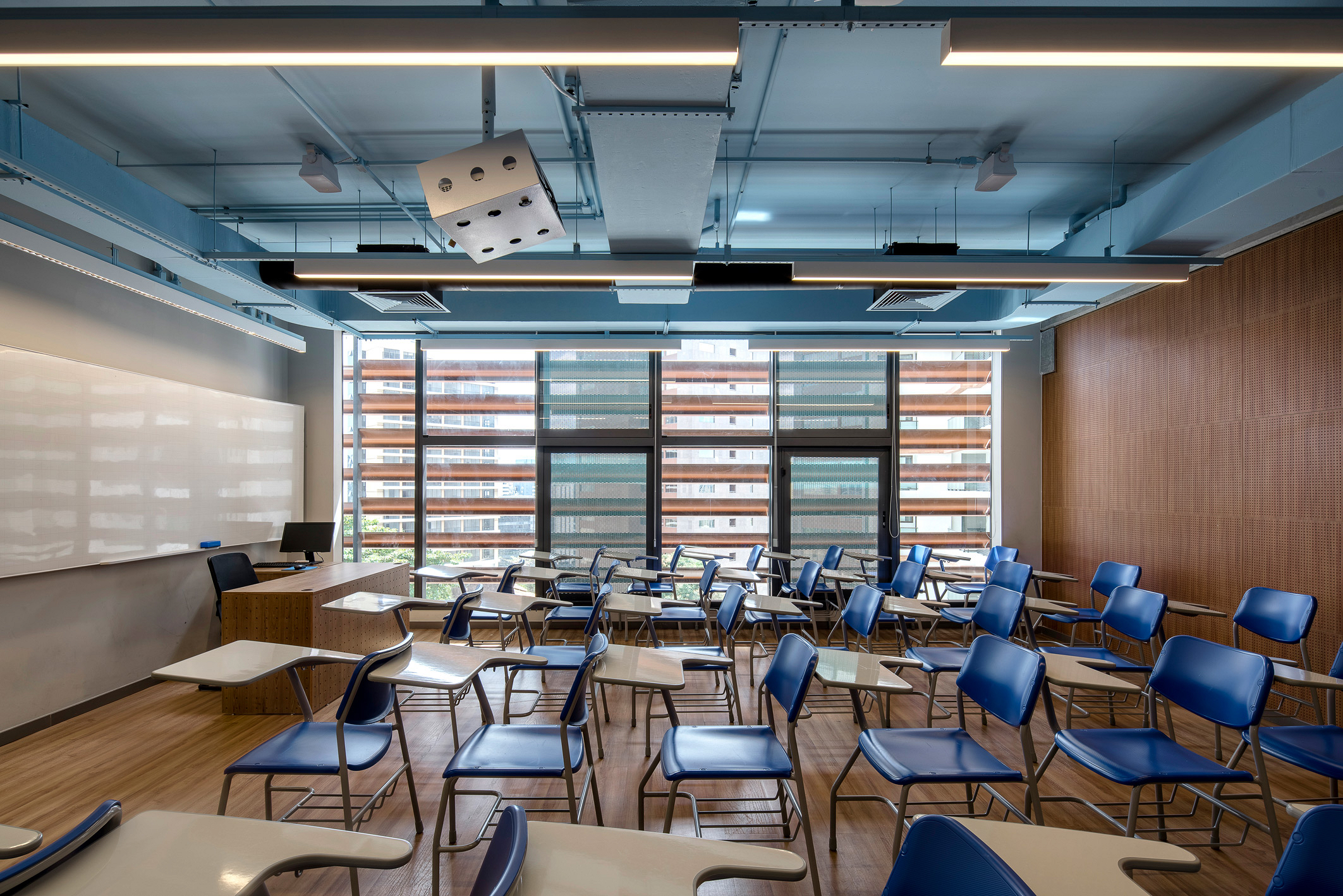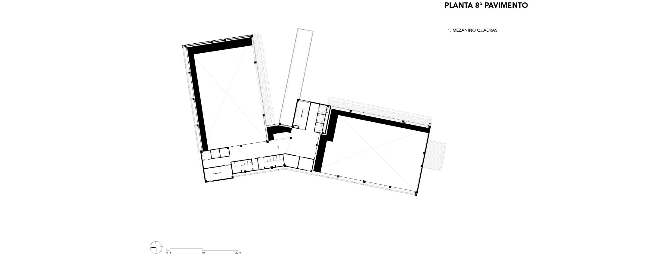 A modularidade é uma característica essencial que permite flexibilidade no uso dos espaços ao longo do tempo. A estrutura pré-fabricada em concreto possui módulos de 7,5 m, estendendo-se ao subsolo para comportar 127 vagas de garagem. No sétimo pavimento de ambos os blocos, há quadras poliesportivas cobertas, com pé-direito generoso, completando a infraestrutura. Vazios estratégicos nas fachadas enriquecem a experiência espacial e conectam os andares por meio de "escadas-arquibancadas", que também servem como áreas de descompressão e recreação. Espaços de circulação e áreas "residuais" entre blocos funcionais são projetados para usos diversos e encontros imprevistos, permitindo uma apropriação flexível do espaço.