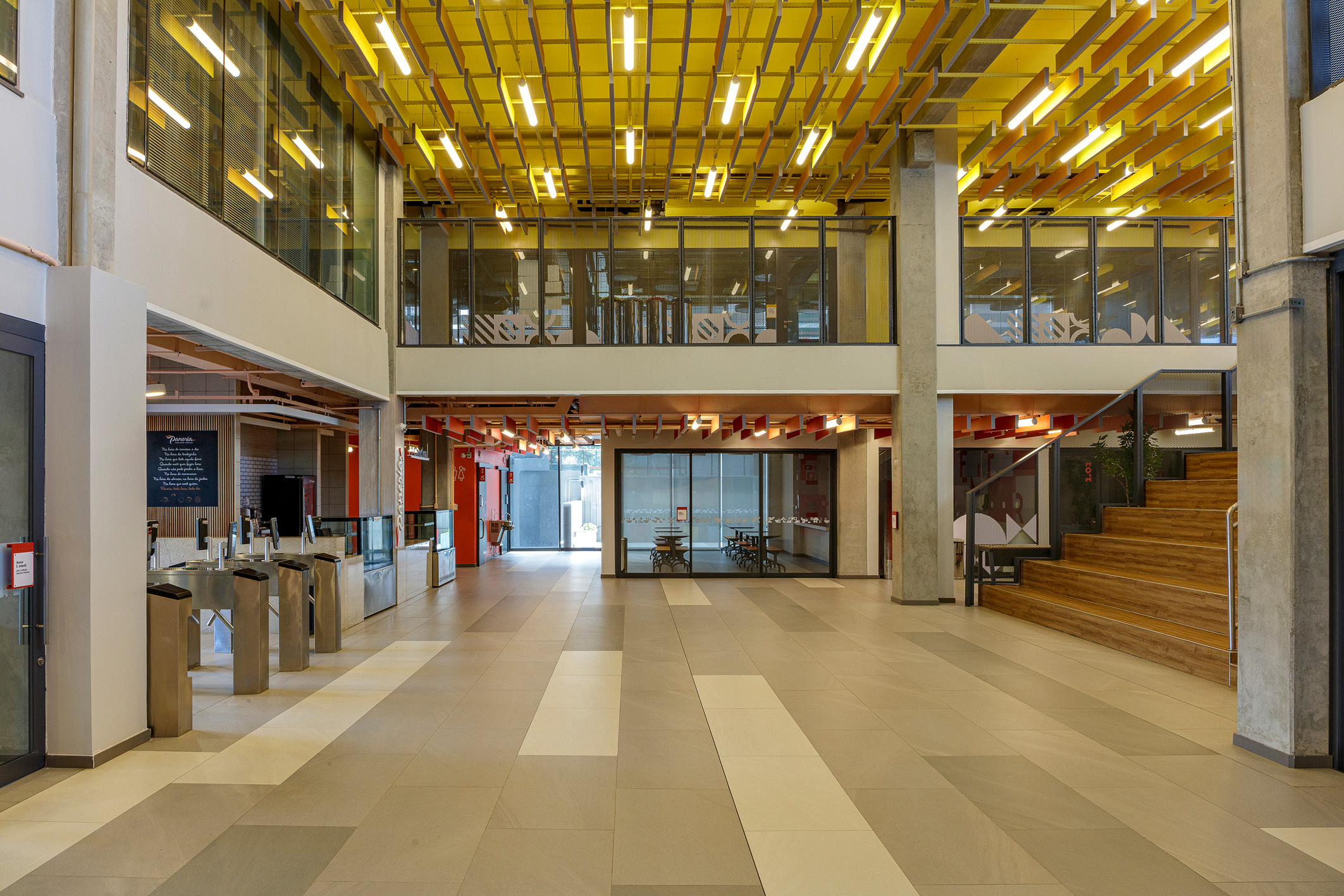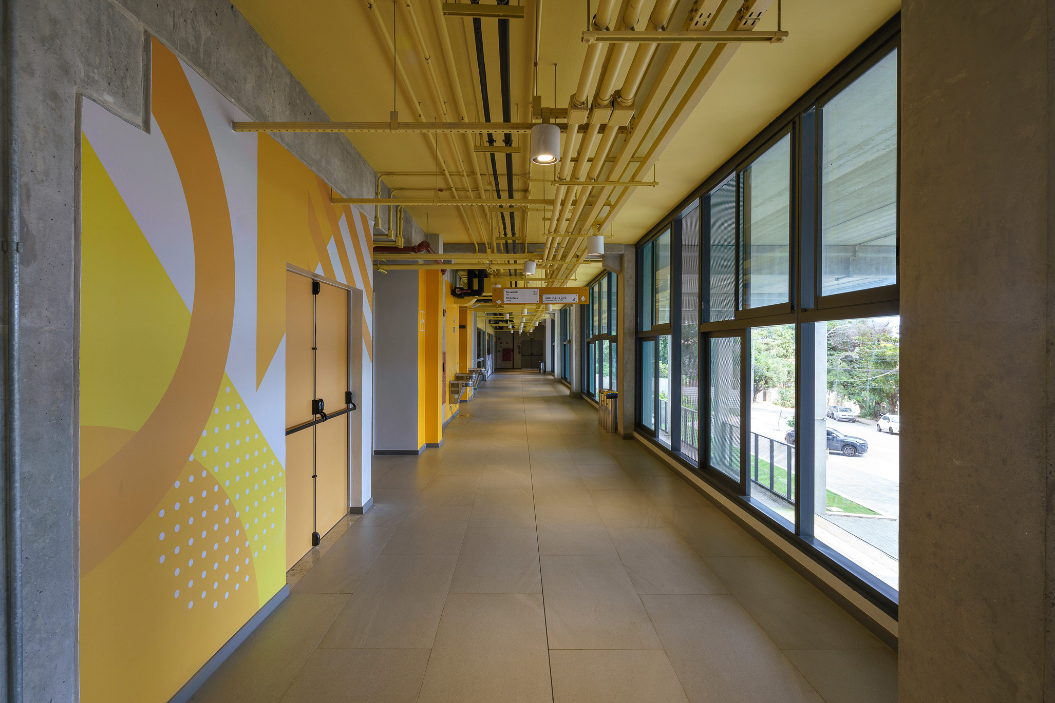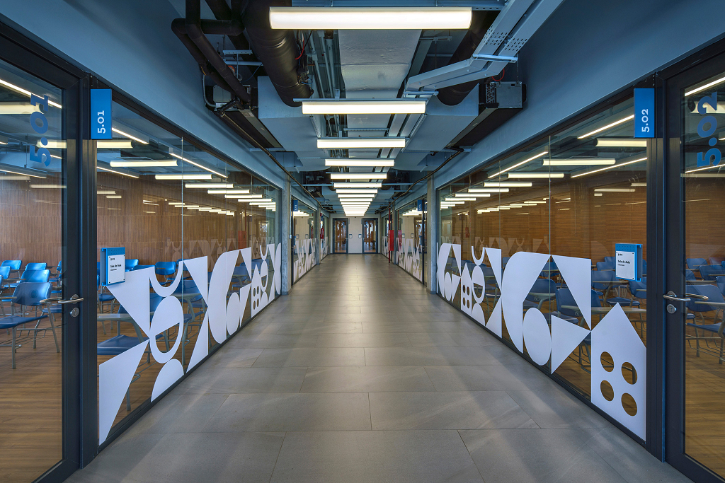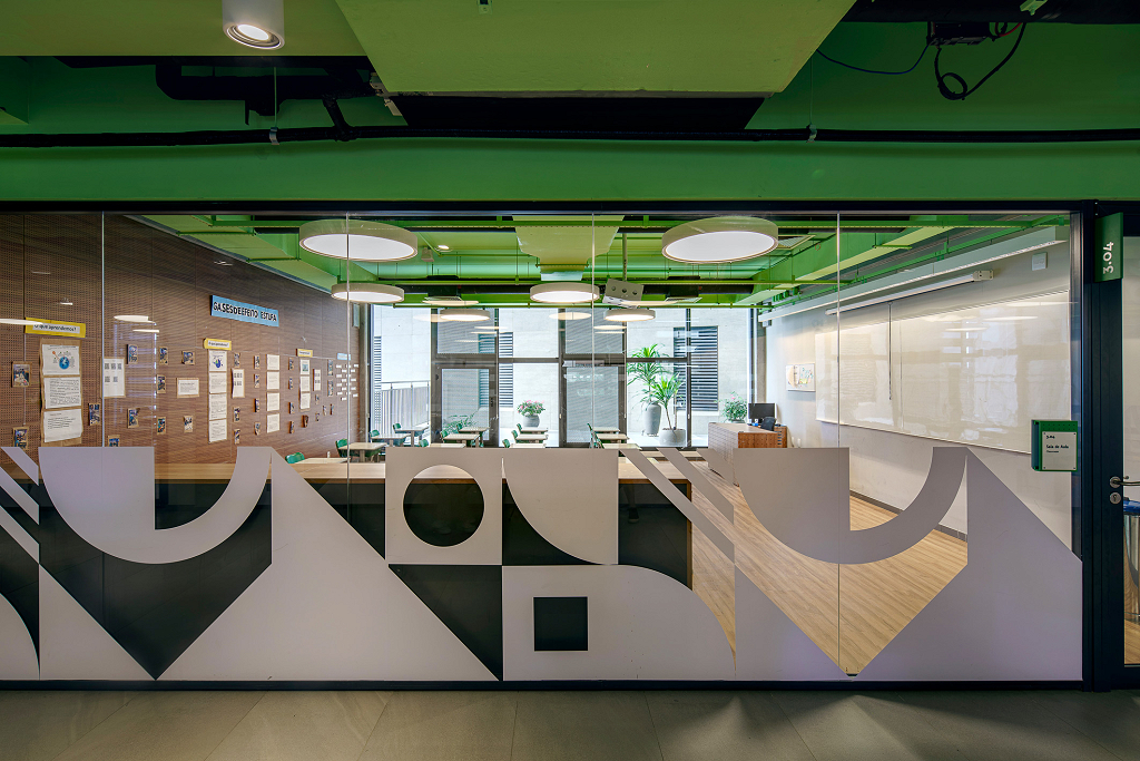 Para traduzir os valores do colégio de forma visual e criar espaços que estimulem o aprendizado, o projeto de ambientação e sinalização utiliza cores, padrões gráficos e soluções modulares que representam a transformação e evolução contínua do aluno: a cada troca de ano, corresponde uma troca de cor e de sistema de painéis, que não são apenas decorativos, mas também educativos. Cada andar é identificado por uma cor específica, acompanhada por padrões gráficos que exploram o potencial técnico, humano e abstrato da educação, compostos por grafismos geométricos, ícones simbólicos e elementos tipográficos. Os grafismos geométricos são utilizados nos corredores e serviços pedagógicos, adaptáveis a diversos tamanhos. Cada andar tem seu próprio padrão de grafismos, que, por serem modulares, permitem múltiplas composições. O sistema visual inclui ícones simbólicos e tipográficos, especialmente nas áreas esportivas. A cultura local também ganha destaque no sistema visual, trazendo símbolos da cidade de Salvador. A sinalização foi projetada para ser facilmente atualizada, potencializando a flexibilidade no ambiente escolar, traduzindo os valores do Colégio e celebrando a identidade local.