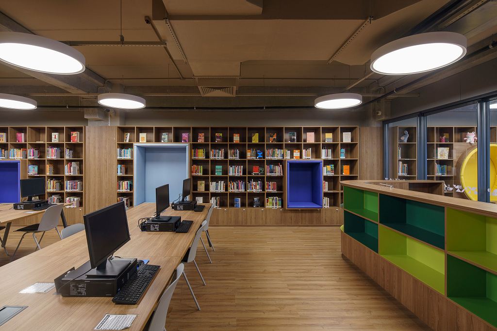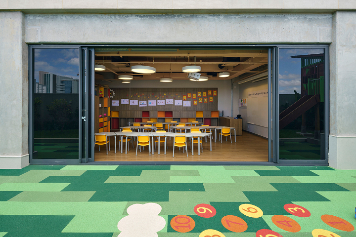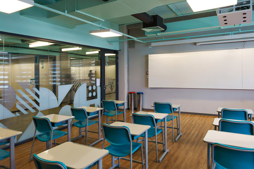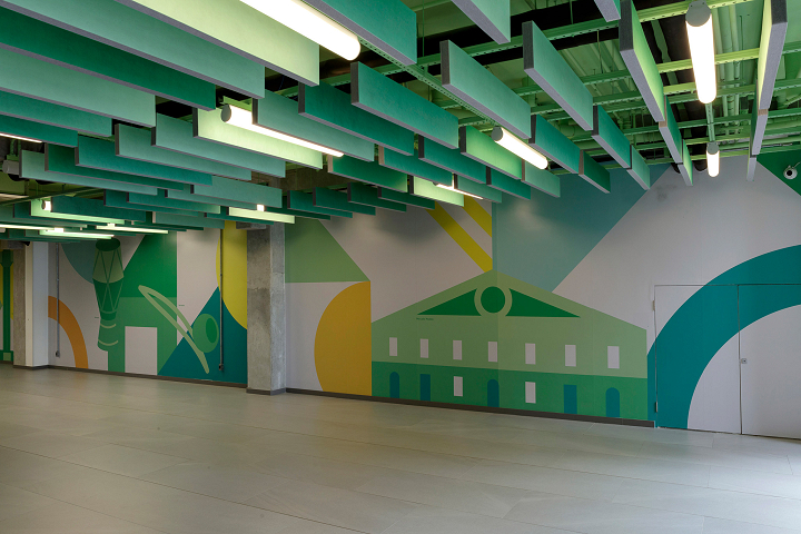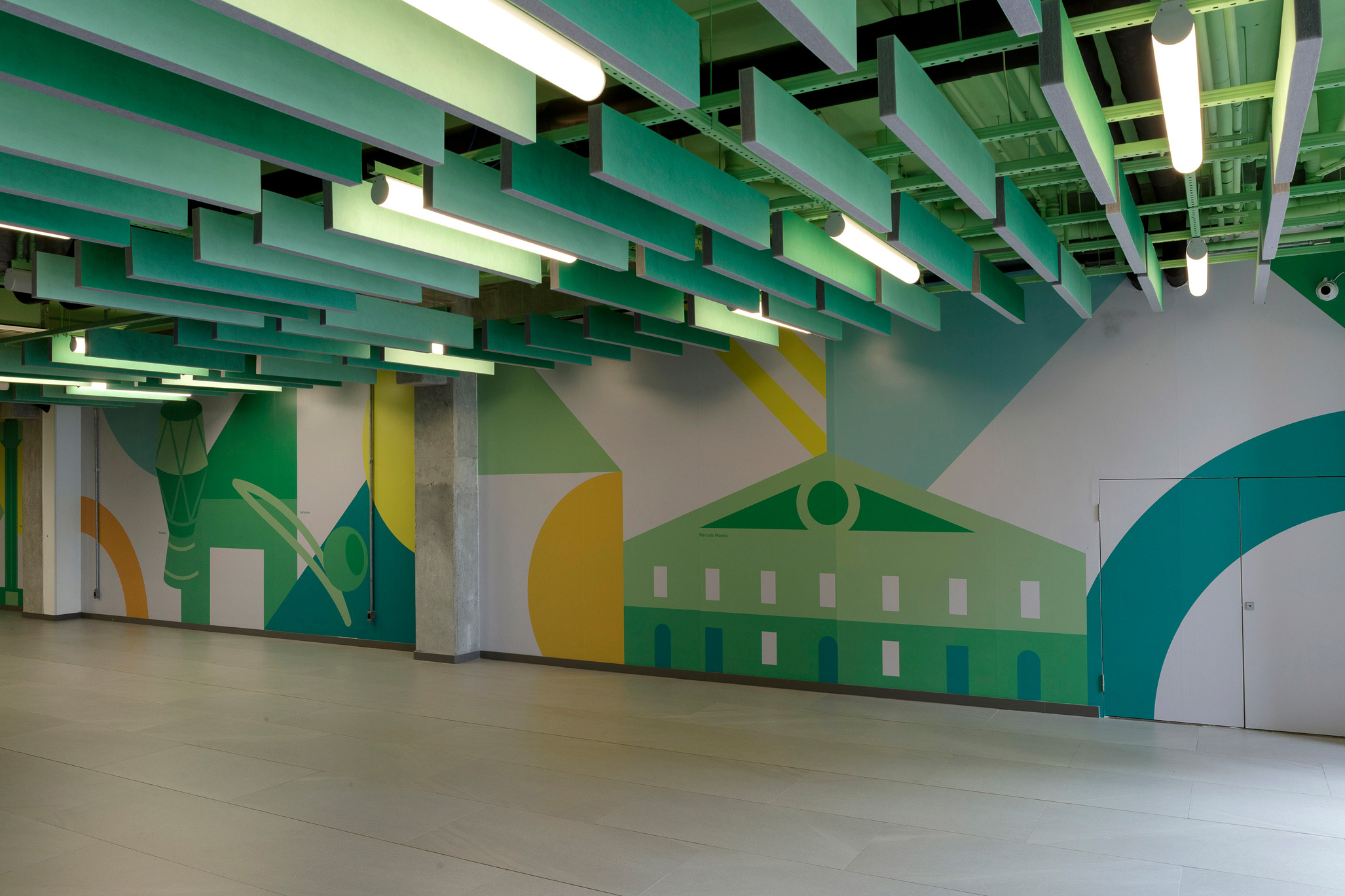Para traduzir os valores do colégio de forma visual e criar espaços que estimulem o aprendizado, o projeto de ambientação e sinalização utiliza cores, padrões gráficos e soluções modulares que representam a transformação e evolução contínua do aluno: a cada troca de ano, corresponde uma troca de cor e de sistema de painéis, que não são apenas decorativos, mas também educativos. Cada andar é identificado por uma cor específica, acompanhada por padrões gráficos que exploram o potencial técnico, humano e abstrato da educação, compostos por grafismos geométricos, ícones simbólicos e elementos tipográficos. Os grafismos geométricos são utilizados nos corredores e serviços pedagógicos, adaptáveis a diversos tamanhos. Cada andar tem seu próprio padrão de grafismos, que, por serem modulares, permitem múltiplas composições. O sistema visual inclui ícones simbólicos e tipográficos, especialmente nas áreas esportivas. A cultura local também ganha destaque no sistema visual, trazendo símbolos da cidade de Salvador. A sinalização foi projetada para ser facilmente atualizada, potencializando a flexibilidade no ambiente escolar, traduzindo os valores do Colégio e celebrando a identidade local.