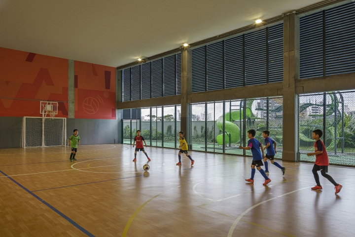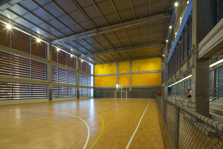 A sustentabilidade é uma premissa essencial em projetos contemporâneos. A boa arquitetura sempre se preocupou com eficiência energética, conforto ambiental e uso adequado de materiais. Neste caso, a vista deslumbrante exige permeabilidade visual, mas também requer brises, cuja orientação foi calculada para minimizar a incidência solar e o ofuscamento em espaços como salas de aula e ginásios, contribuindo para a economia de energia (luz artificial e climatização). As instalações elétricas, hidráulicas, de ar-condicionado e acústicas são expostas, como em uma indústria, facilitando manutenção e adaptação a futuros usos, além de integrarem a ambientação e sinalização da escola, variando em paleta cromática conforme os andares.