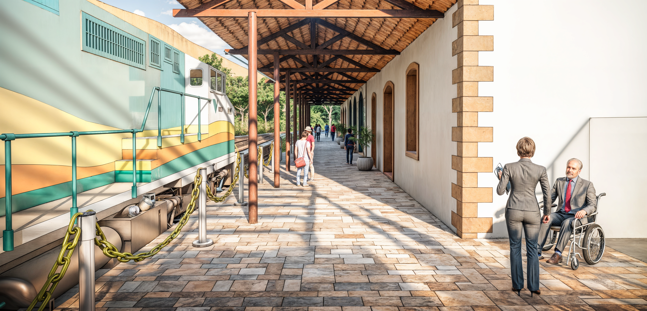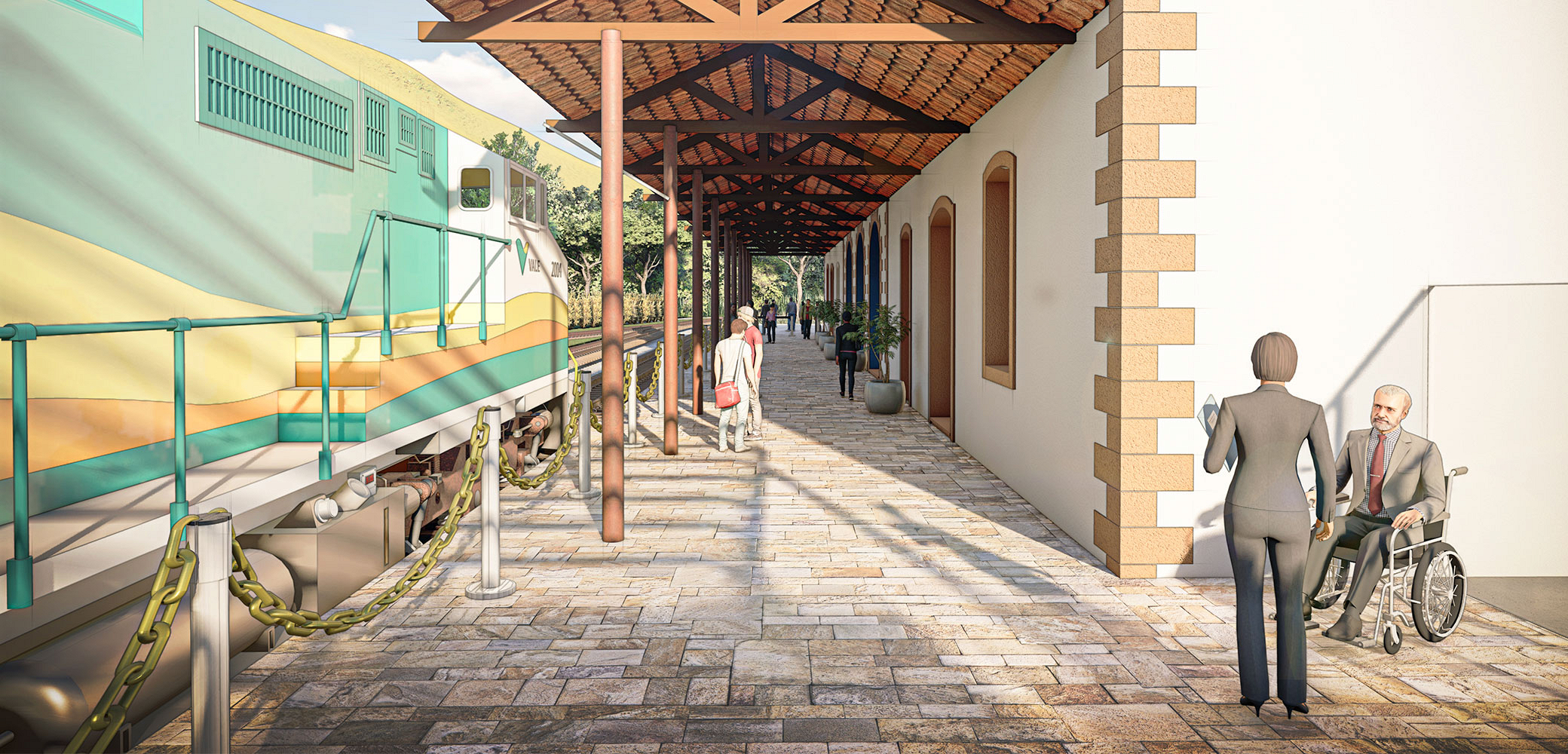 A plataforma de embarque e desembarque, alinhada com a edificação, permanecerá com a cobertura original de “telhas francesas”, sendo restaurada para preservar o material e aumentar a sua durabilidade. Os forros de madeira que estiverem em bom estado de conservação serão mantidos e, quando for necessário, será prevista a reabilitação conforme orientação dos órgãos competentes. Onde não há forro, as vigas treliçadas, tanto de madeira, quanto metálicas, serão mantidas, passando, caso necessário, apenas por processos de restauração, como lixamento e impermeabilização.