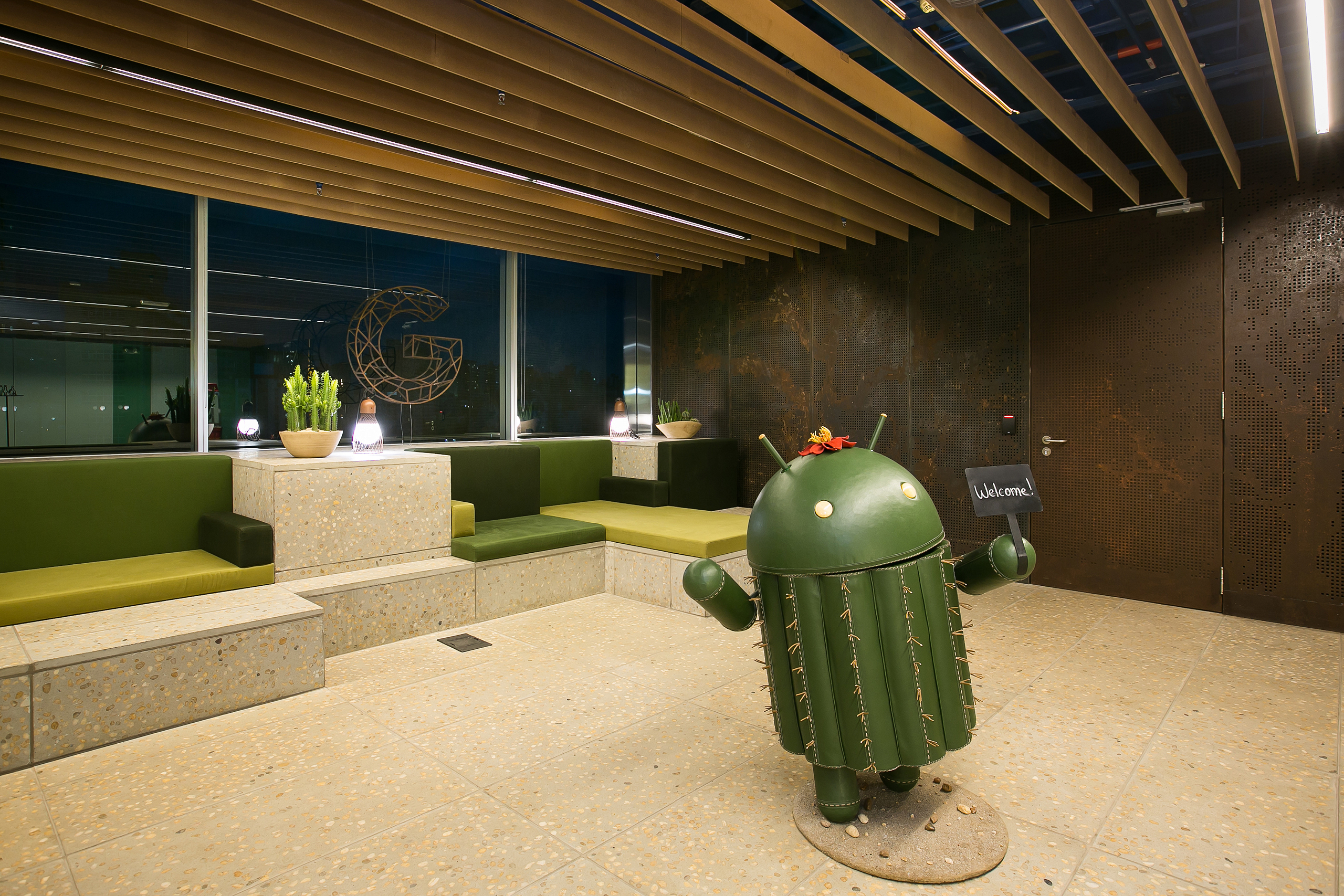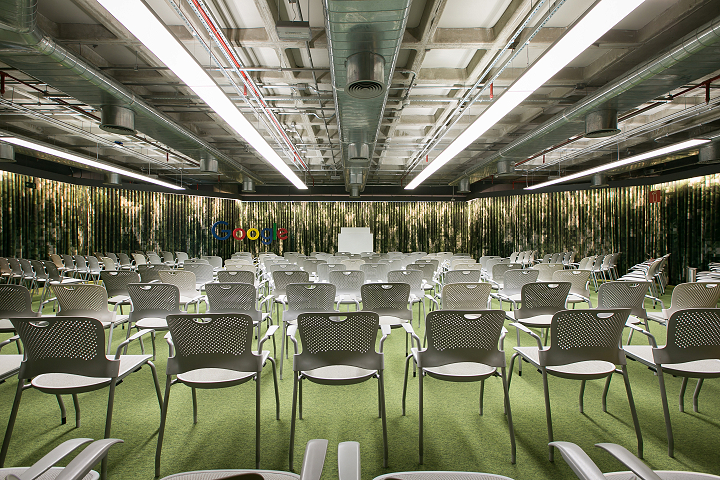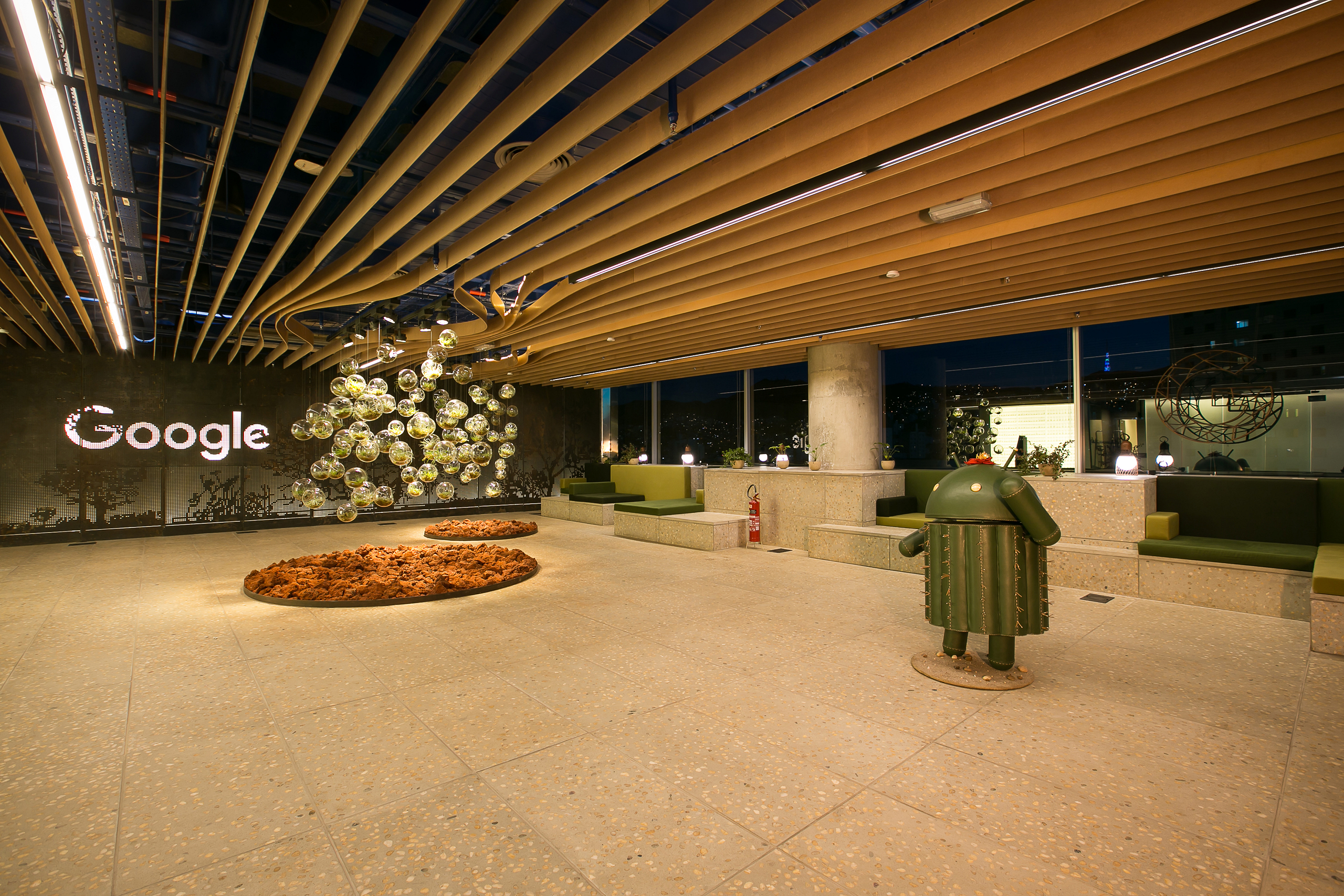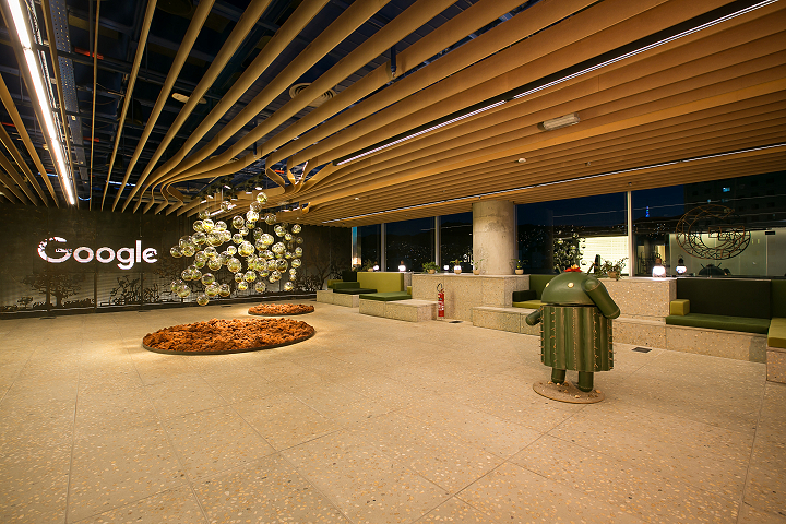 Neste primeiro projeto para o Google (2016), integramos soluções que exploram a tensão entre a cultura local e a cultura Google numa abordagem sutil e sofisticada. O contexto digital e intangível do serviço da empresa ficou registrado nos espaços de trabalho, onde elementos como vidros, telas e superfícies brilhantes proporcionam o máximo de imersão possível. Já nos espaços comuns, a paisagem e a cultura de Minas Gerais são representados por materiais táteis, texturas, tons terrosos, tramas e treliças.