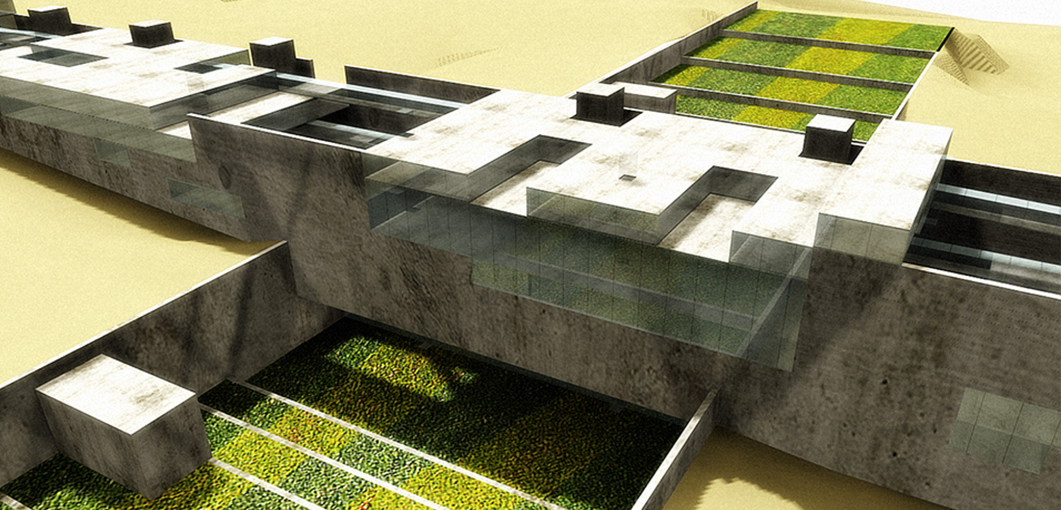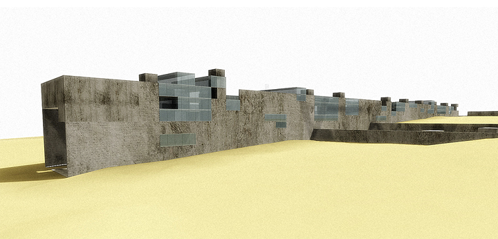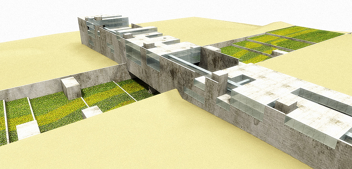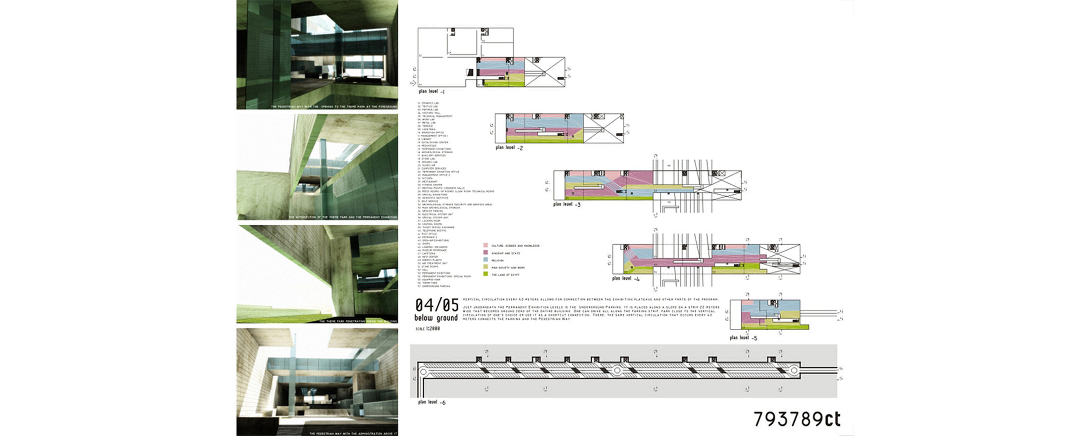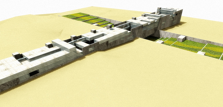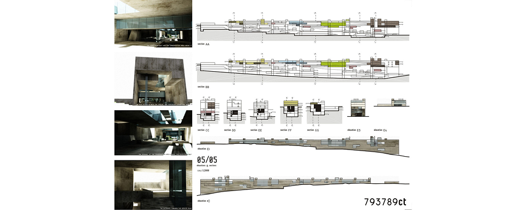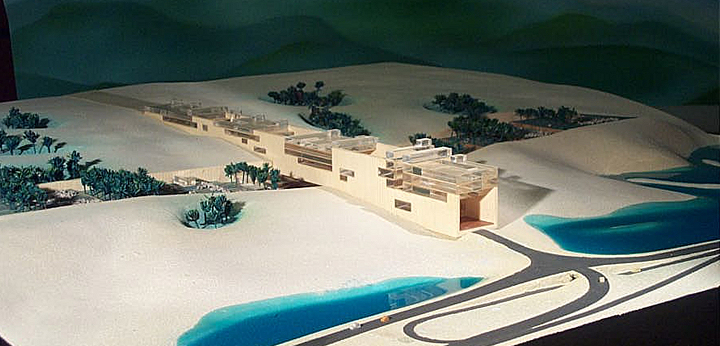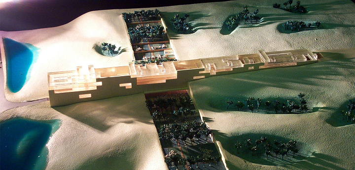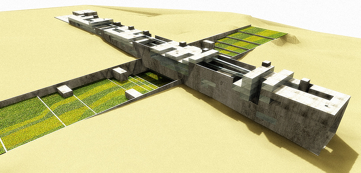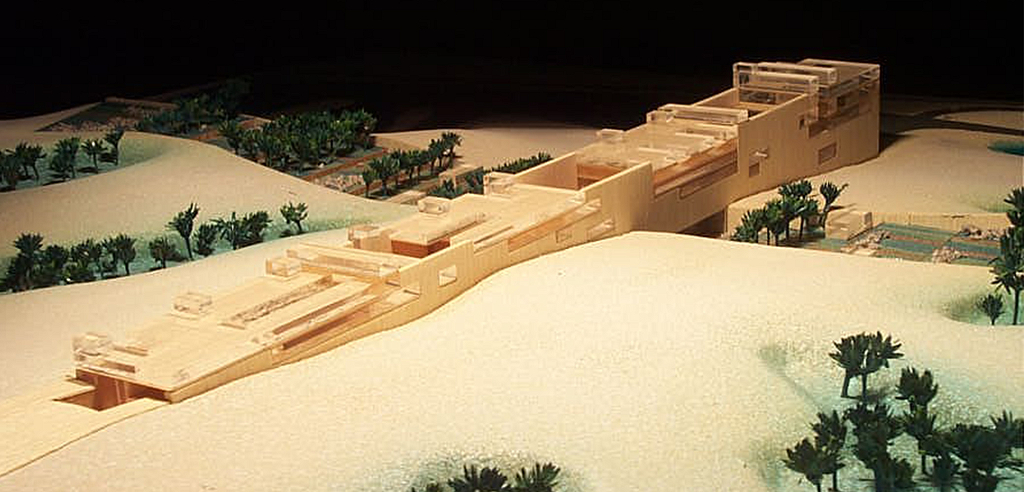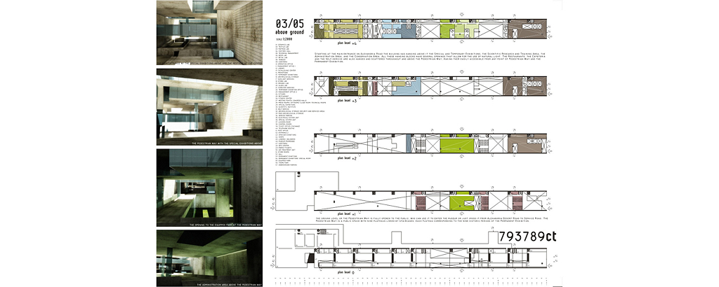 Cairo, Egito 2002Proposta para o concurso internacional patrocinado pela Unesco e governo do Egito. O prédio funciona como uma grande rua de circulação de pedestres que une duas avenidas na planície da Giza, onde estão as três maiores pirâmides do Egito. Sob essa rua pública estará a exposição permanente documentando os nove períodos da história egípcia. A rua é a materialização dos nove períodos da civilização egípcia: quanto mais alto o nível da rua, mais recente será o período da exposição sob a rua. Um parque atravessa o prédio e o conecta, por uma linha imaginária, à diagonal da pirâmide de Quéops.
