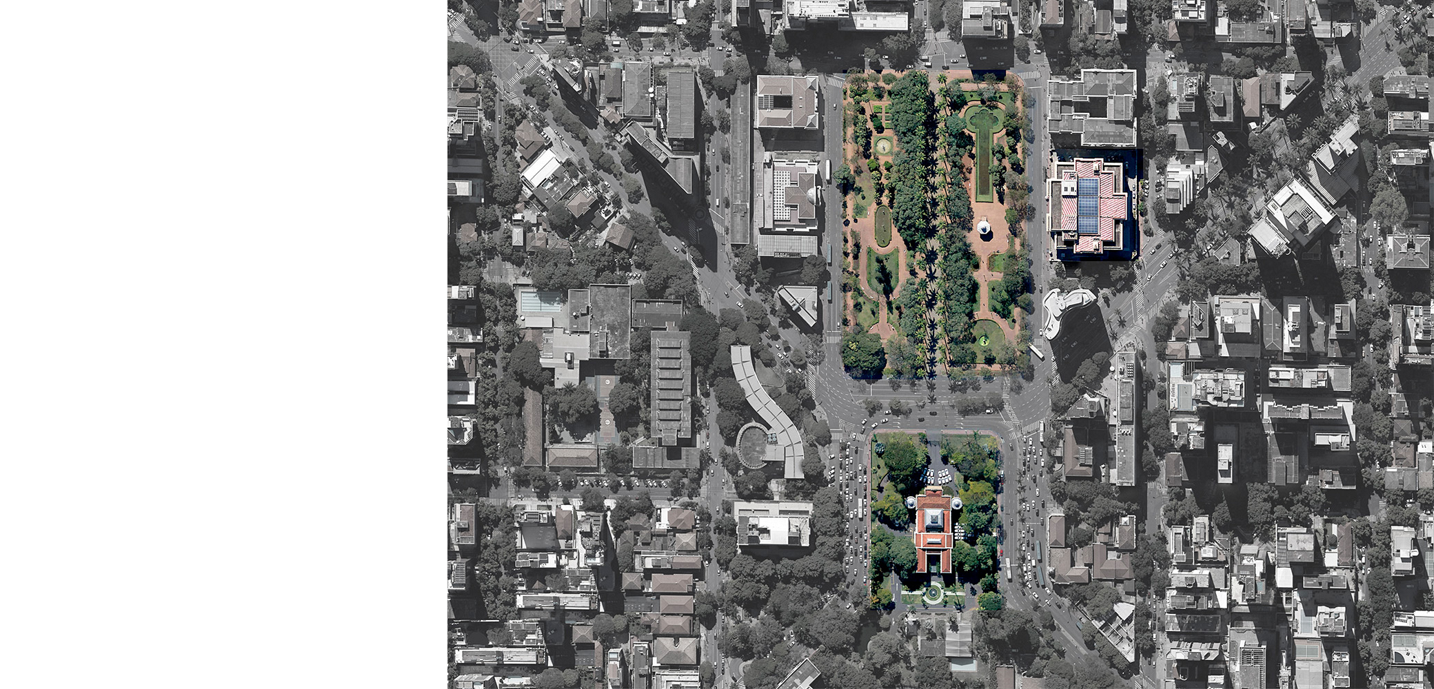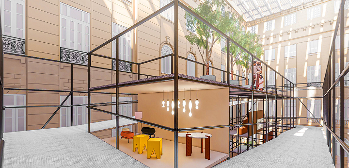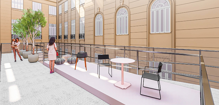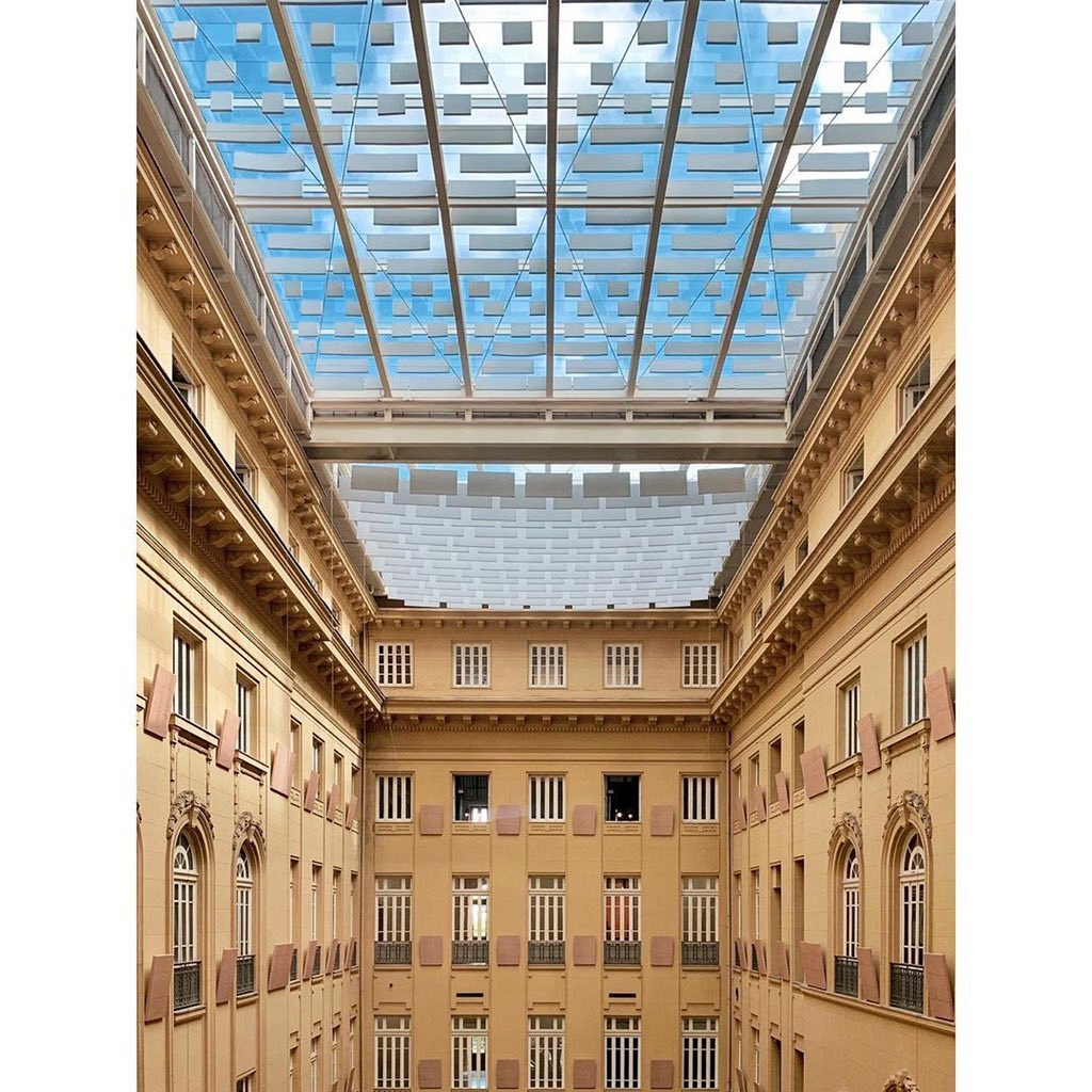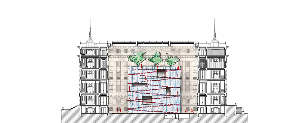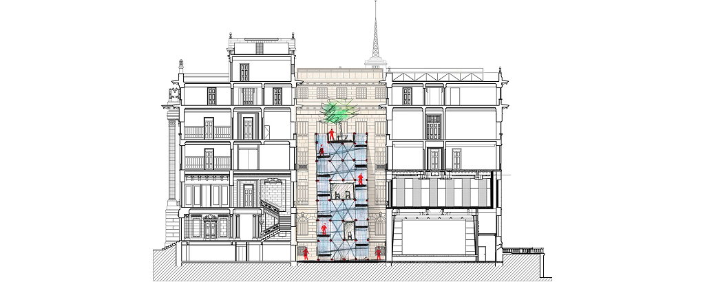 Esse pavilhão (um prisma de 7m de largura, 20m de comprimento e 18m de altura) pretende criar uma experiência espacial dinâmica no vazio do edifício histórico, possibilitando usos incomuns e visadas surpreendentes do pátio interno do CCBB. Ao ascender até uma praça suspensa próxima à cobertura zenital, o pavilhão se abre totalmente ao ar livre, trazendo o céu para dentro do pátio.