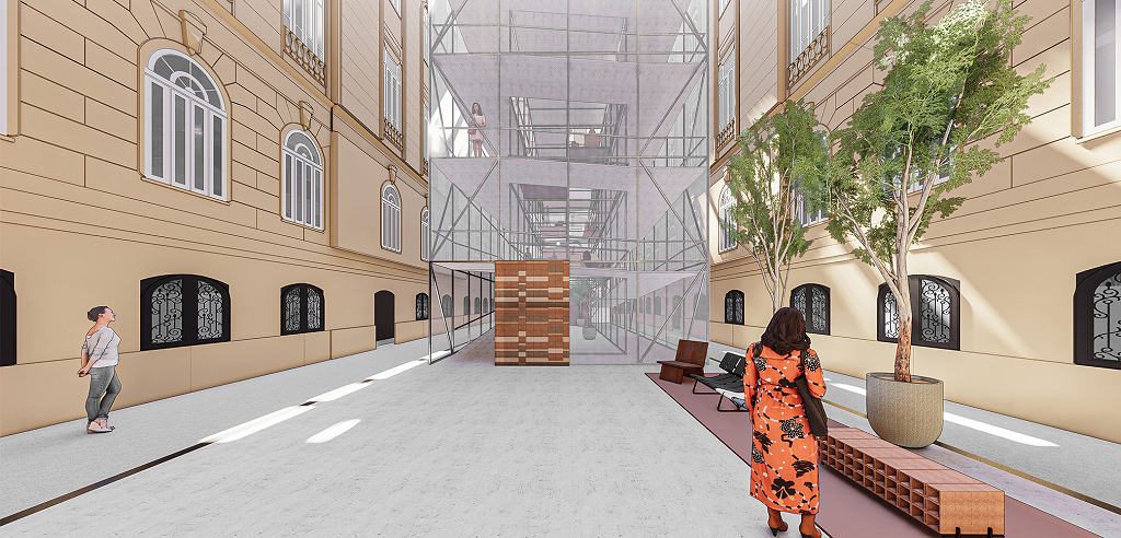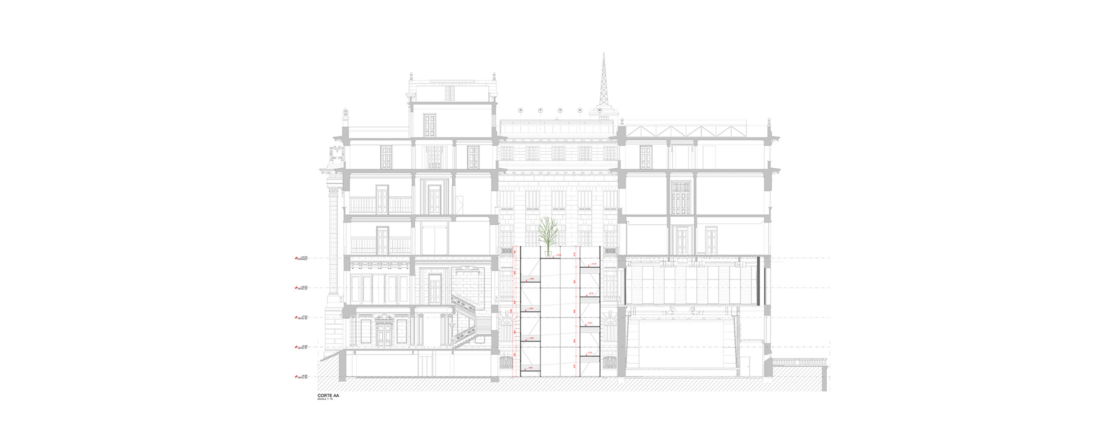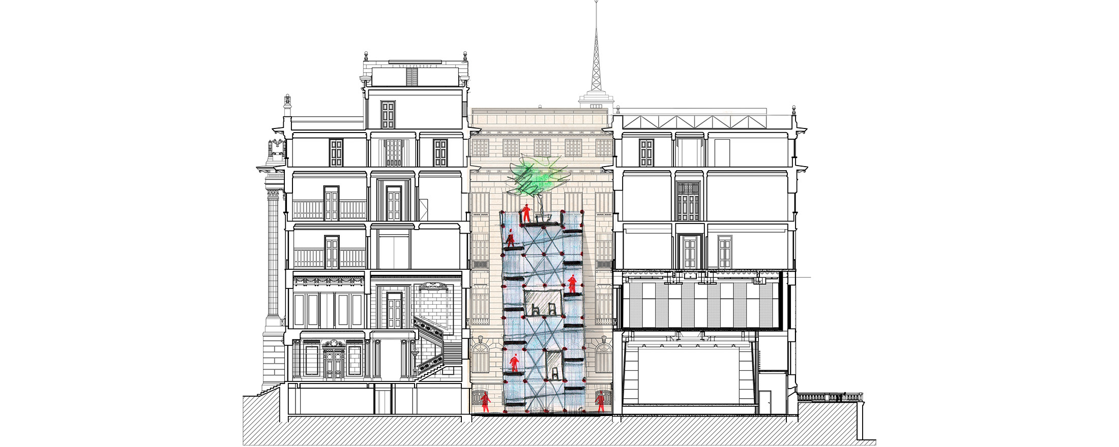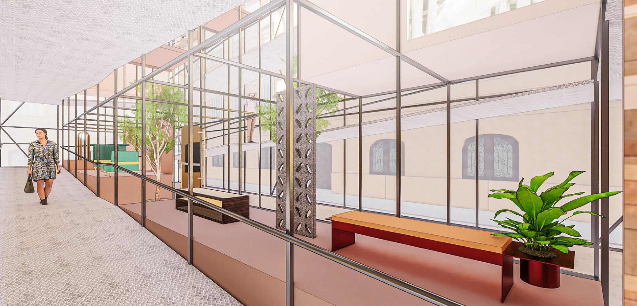 Belo Horizonte, MG, Brasil 2020O projeto se fundamenta nas propostas radicais de arquitetura de vanguarda das décadas de 1950 e 1960 — notadamente as visões de Yona Friedman, Cedric Price e Buckminster Fuller — que idealizavam soluções de velocidade, leveza e flexibilidade como resposta aos desafios urbanos e sociais. Em um cenário global cada vez mais volátil, esses conceitos se mostram cruciais para a arquitetura contemporânea. Neste contexto, propomos a inserção de um pavilhão no vazio central do edifício histórico do CCBB. A estrutura atua como um dispositivo espacial dinâmico, concebido para gerar experiências inesperadas e visadas surpreendentes do pátio interno. O ponto culminante da ascensão é uma praça suspensa que se abre totalmente, integrando a cobertura zenital e, metaforicamente, trazendo o céu para dentro do coração do CCBB.