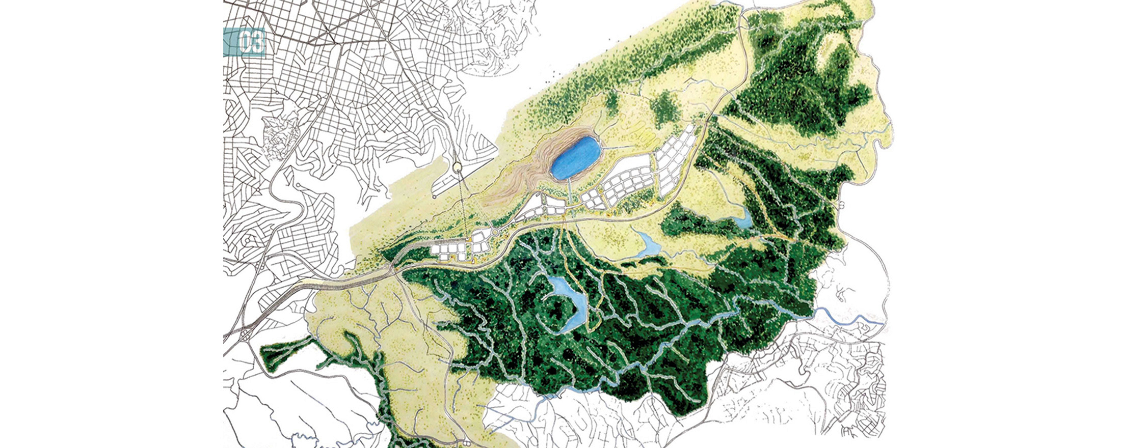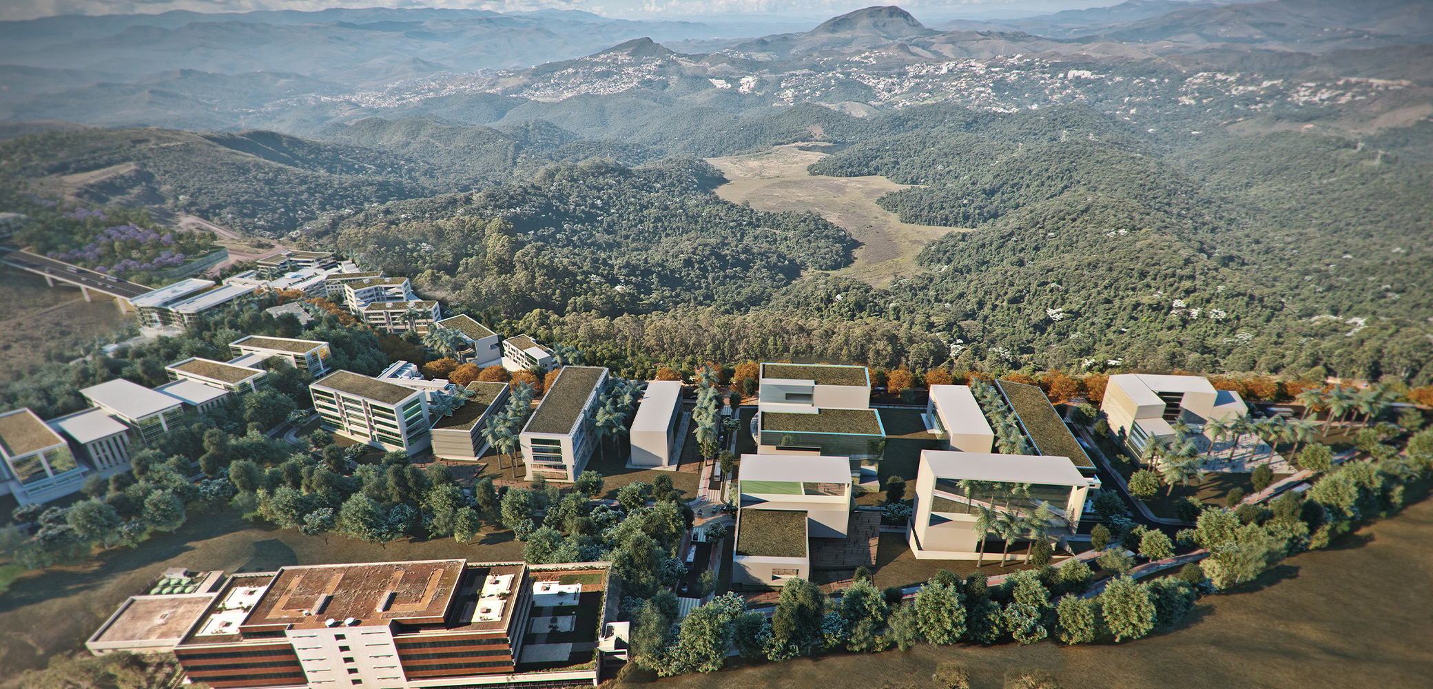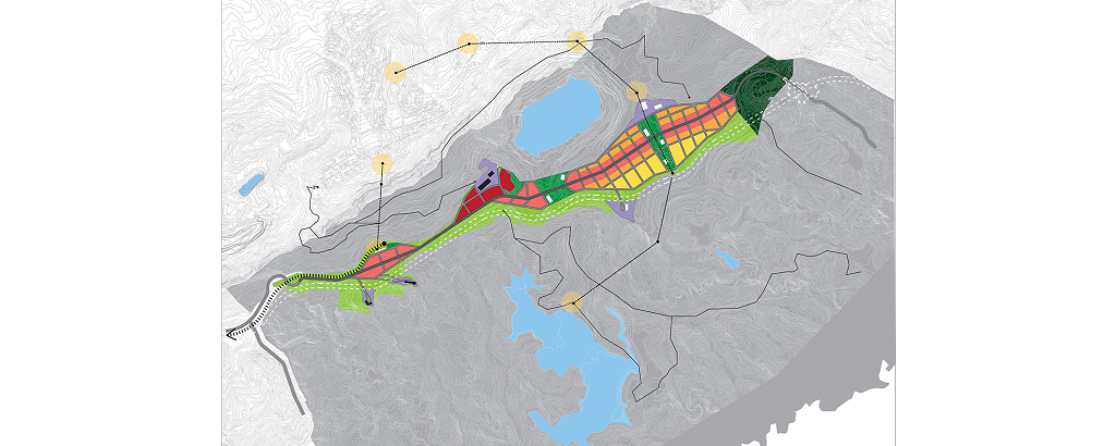 Trata-se, portanto, de pensar uma ocupação urbana a partir da cava, das montanhas, do solo estéril e do legado de edifícios industriais, além de levar em consideração a Mata do Jambreiro e o grande contraste entre mineração e natureza presente em toda a região.