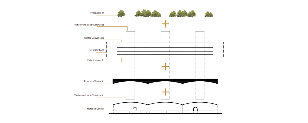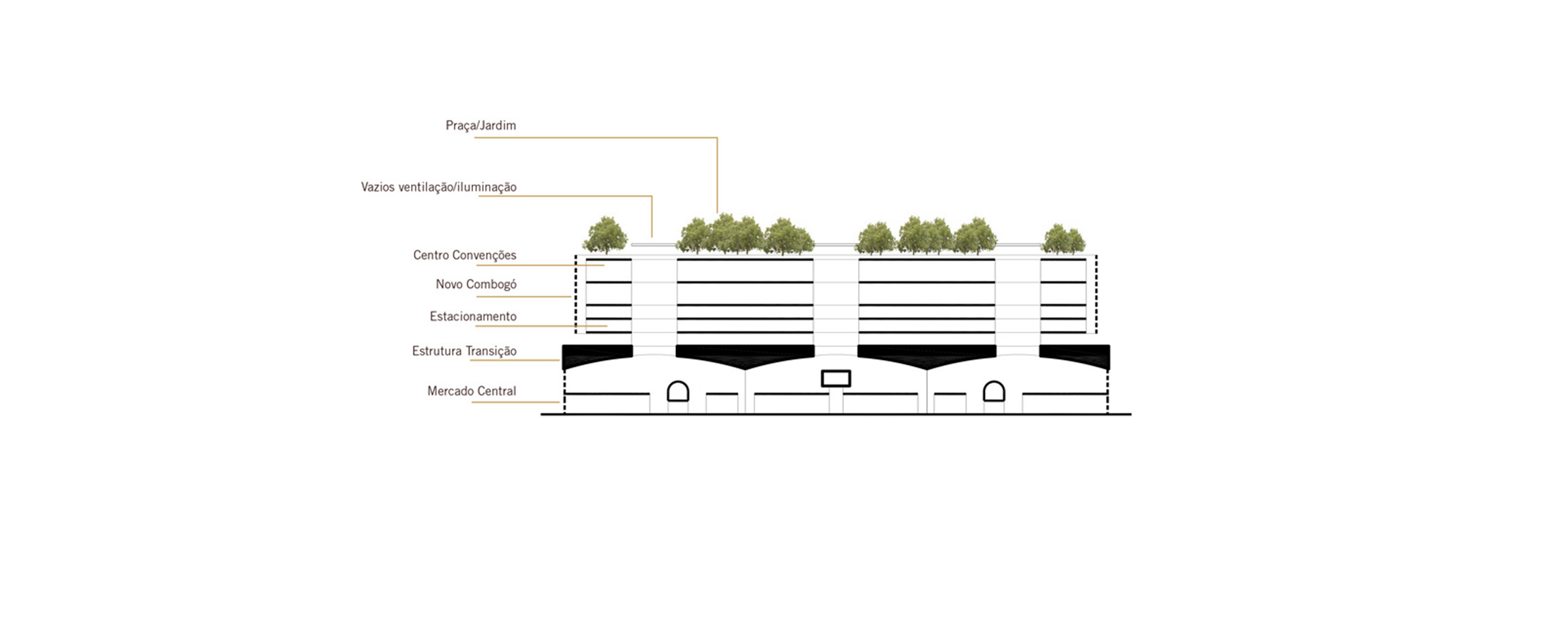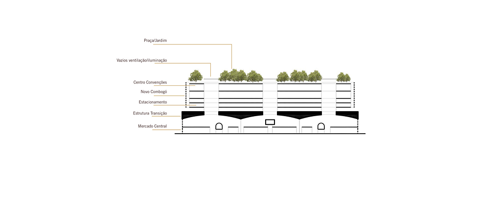 O projeto prevê, por um lado, a manutenção integral da volumetria externa e da espacialidade interna ao edifício e, por outro, recria no terraço a configuração dos tempos primordiais do Mercado, quando as circulações se faziam a céu aberto.