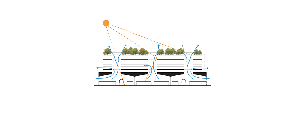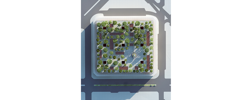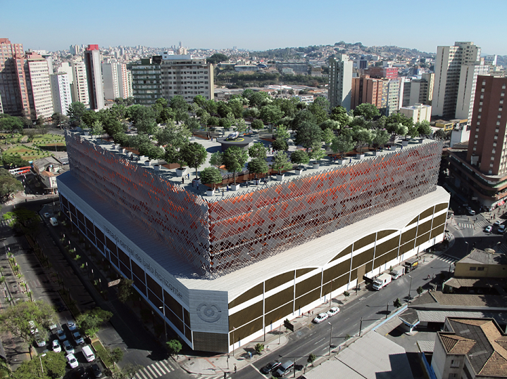 A partir da análise do histórico das transformações urbanas de Belo Horizonte, em especial de sua área central, percebe-se a contínua supressão de espaços verdes, com destaque para o Parque Municipal, cuja área representa hoje apenas um terço da original. Em vista disso, propusemos a criação de uma grande praça sobre a nova edificação, com área total que supera 1 hectare, ou seja, mais de 10.000 metros quadrados destinados ao plantio de aproximadamente 400 árvores. Como se cada lojista associado doasse uma árvore para a cidade – fato simbólico de um compromisso do Mercado com Belo Horizonte.
