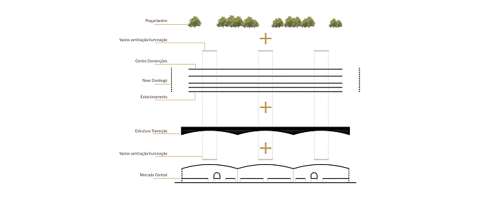 A intervenção arquitetônica é proposta de modo a consolidar o conjunto arquitetônico como mercado central, a partir de sua iconografia própria. Para isso são adotados elementos característicos da arquitetura existente, a qual será integralmente preservada.