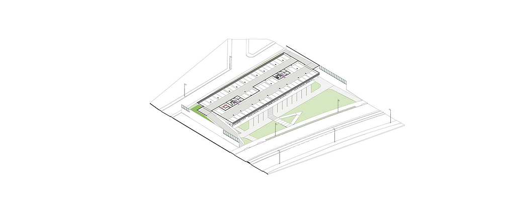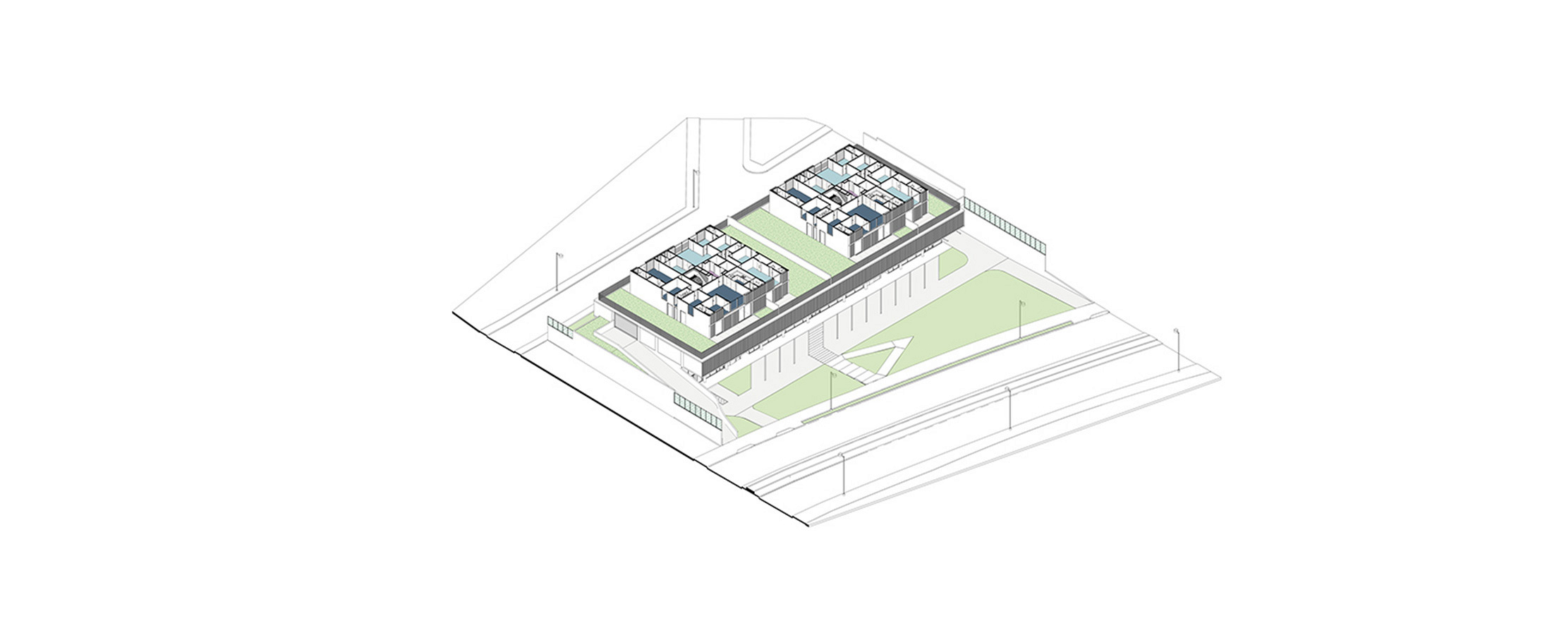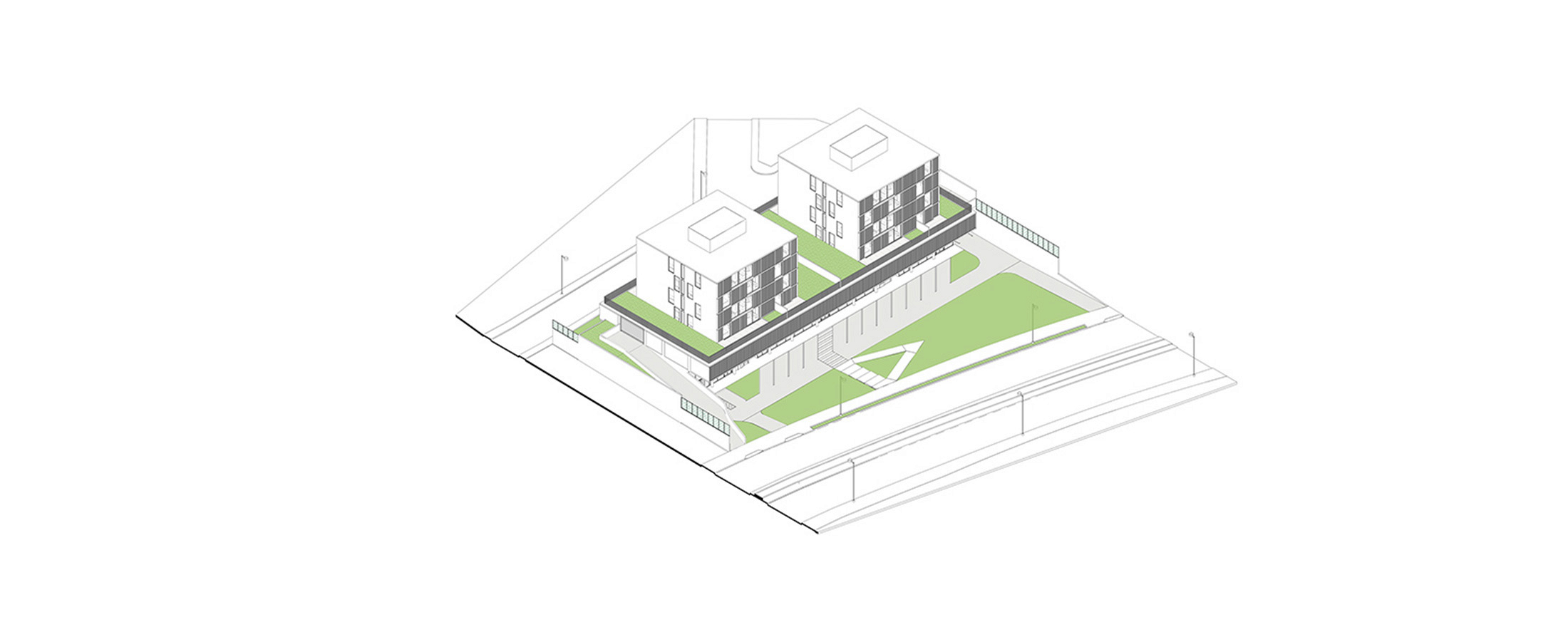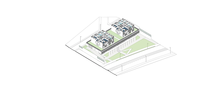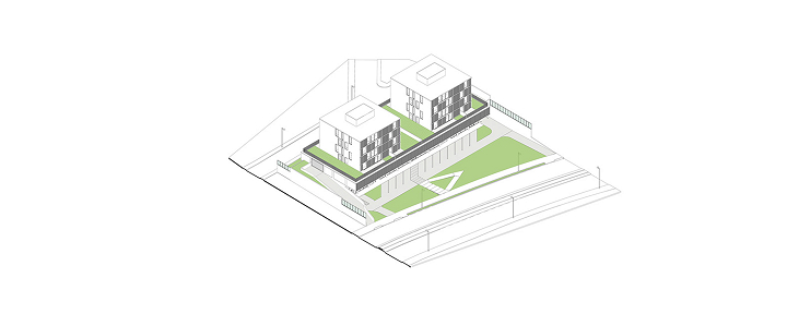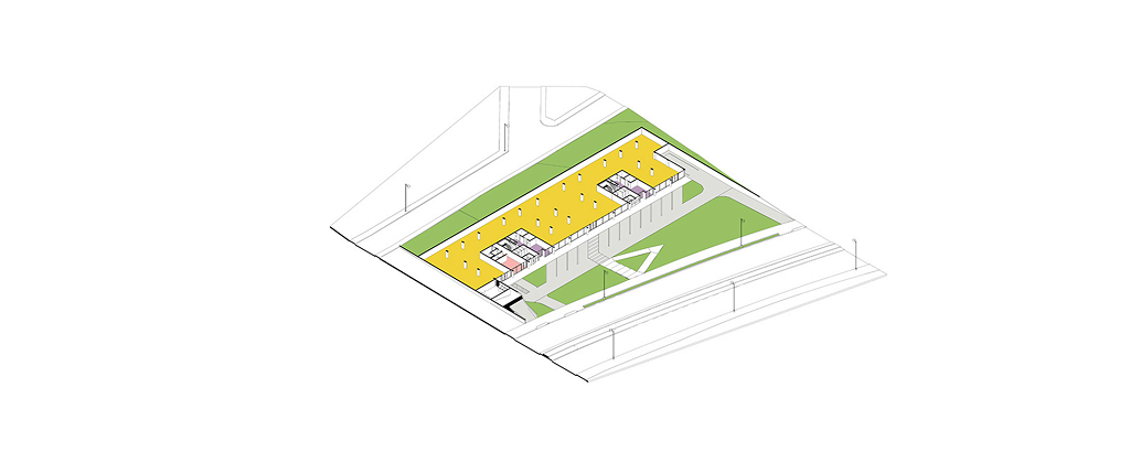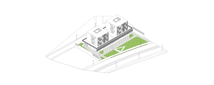 O edifício de uso misto foi projetado de forma modular, com a estrutura coincidindo de cima a baixo, desde o bloco comercial, no térreo, atravessando o pavimento de estacionamentos até as duas torres residenciais. As torres possuem 16 apartamentos, sendo dois por andar e que foram desenhados em forma de “L”, rotacionados ao redor do núcleo de circulação vertical, ao invés da usual planta simétrica. Shafts hidráulicos foram posicionados estrategicamente para garantir a liberdade de opções de layout. No nível da garagem temos algumas áreas comuns (academia, pets, kids, festas) no rooftop uma piscina e área gourmet.