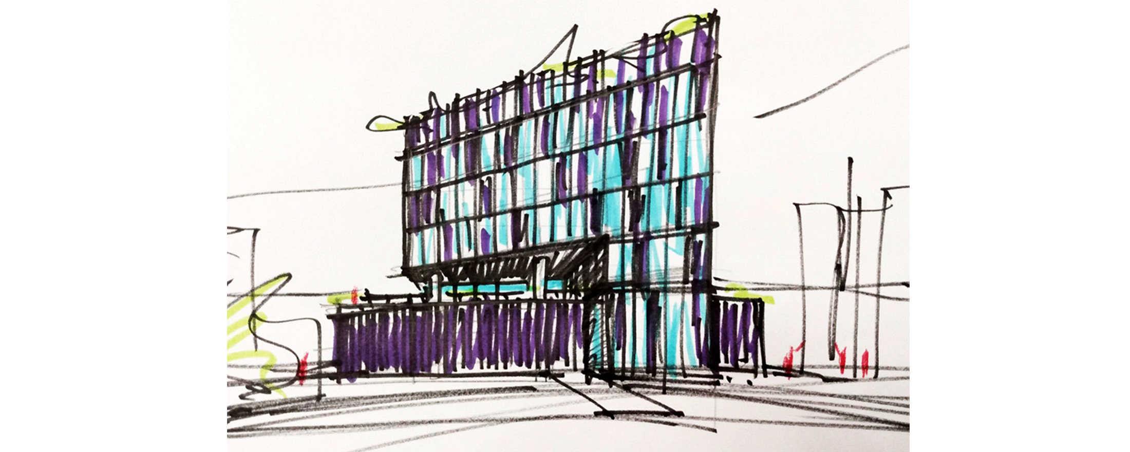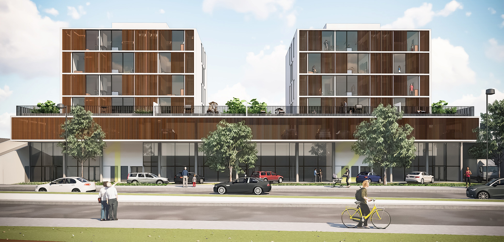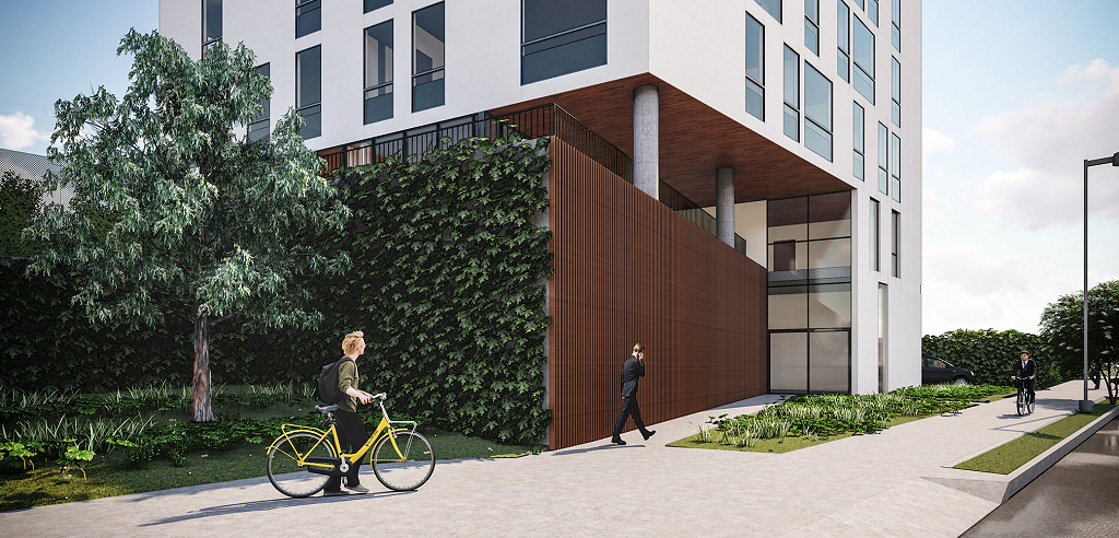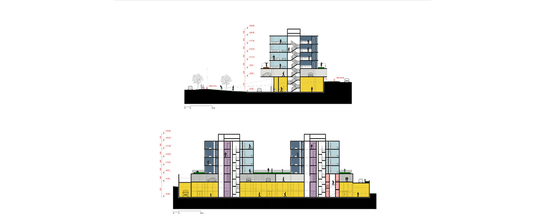 O edifício de uso misto foi projetado de forma modular, com a estrutura coincidindo de cima a baixo, desde o bloco comercial, no térreo, atravessando o pavimento de estacionamentos até as duas torres residenciais. As torres possuem 16 apartamentos, sendo dois por andar e que foram desenhados em forma de “L”, rotacionados ao redor do núcleo de circulação vertical, ao invés da usual planta simétrica. Shafts hidráulicos foram posicionados estrategicamente para garantir a liberdade de opções de layout. No nível da garagem temos algumas áreas comuns (academia, pets, kids, festas) no rooftop uma piscina e área gourmet.