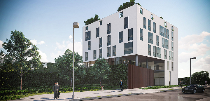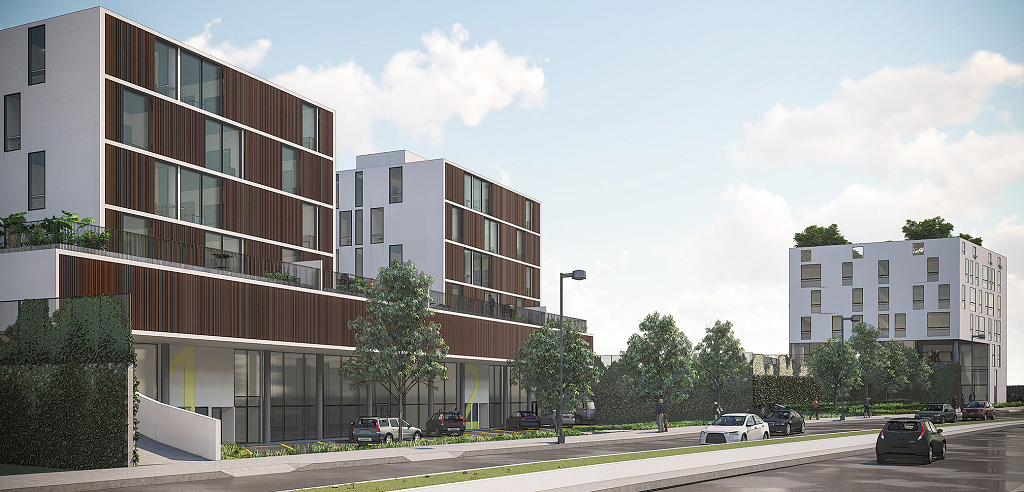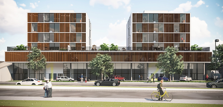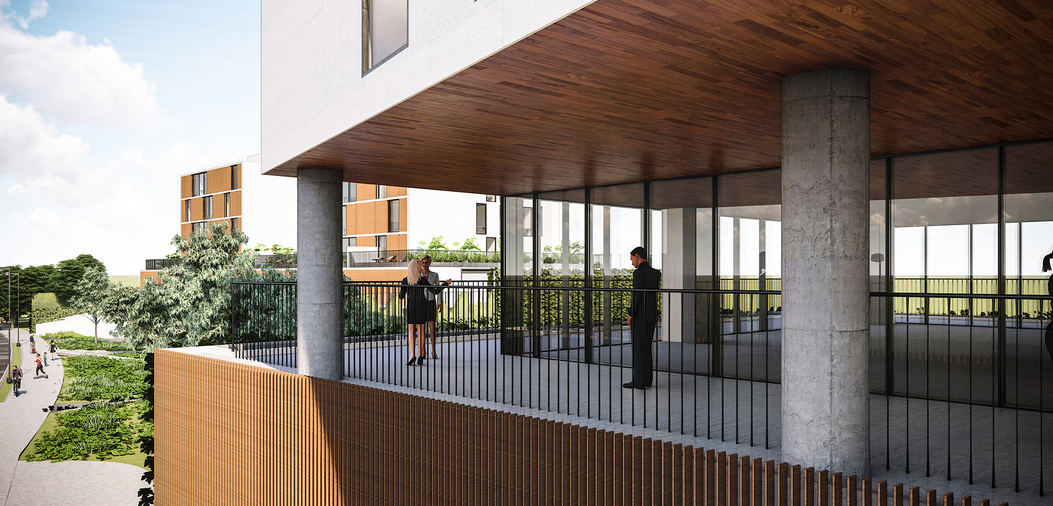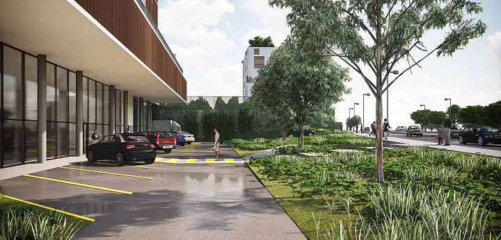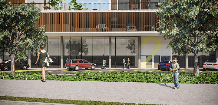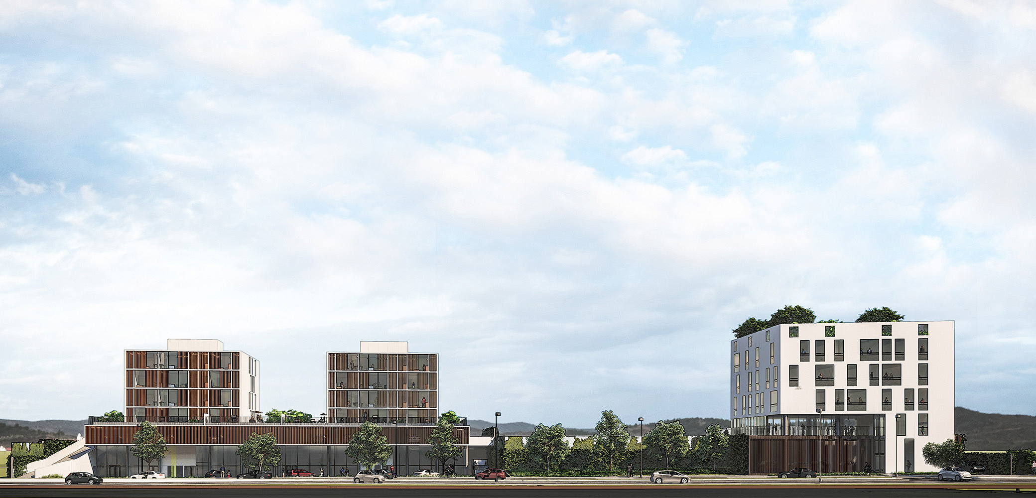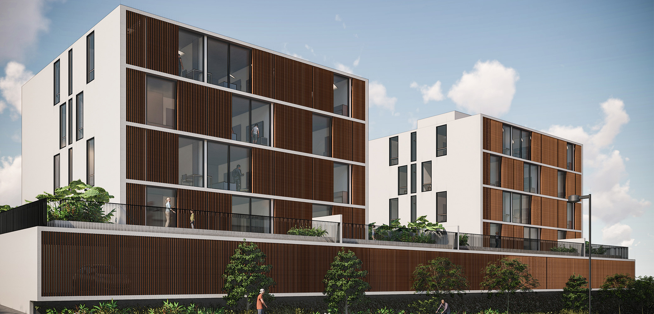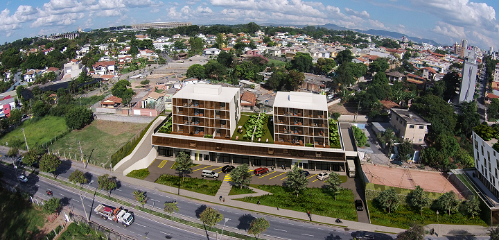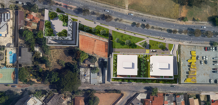 A BCMF Arquitetos assina o projeto de dois empreendimentos, um edifício de uso misto (apartamentos e lojas) e outro de uso comercial, localizado no final da Avenida Fleming, na região da Pampulha em Belo Horizonte. Eles se conectam por meio de uma faixa de área permeável, que é parte do projeto de paisagismo e integração entre os blocos.
