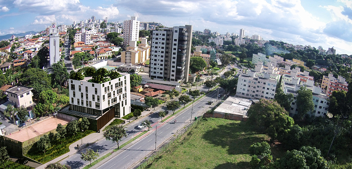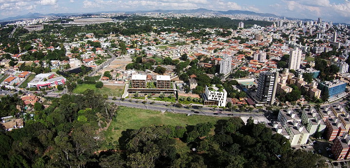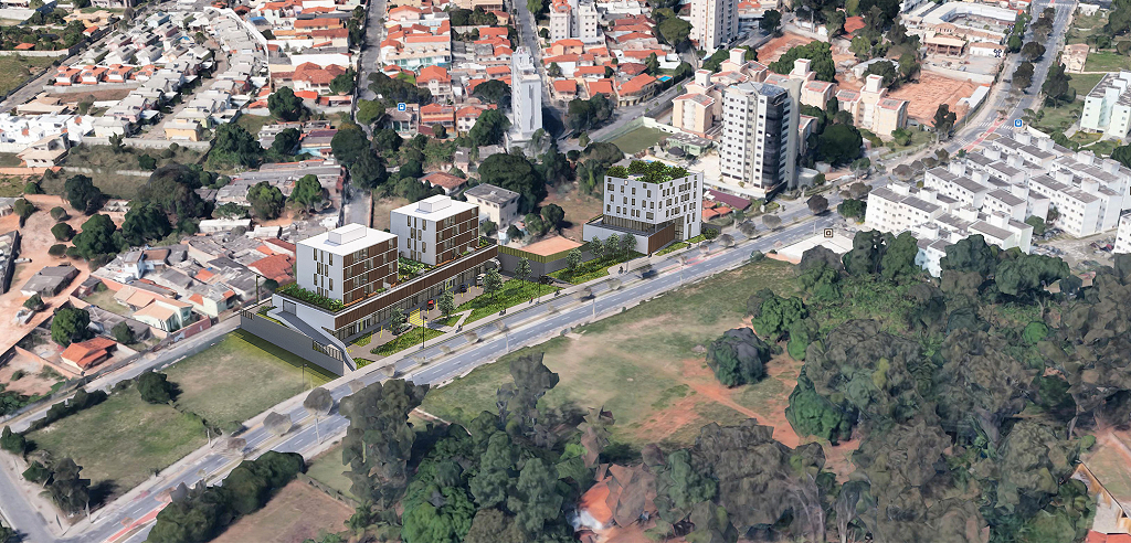Belo Horizonte, MG, Brasil 2019A Pampulha é uma região de Belo Horizonte que cada vez mais ganha centralidade no fluxo urbano da Grande BH, sendo amplamente conhecida pela paisagem modernista composta do Conjunto Arquitetônico da Pampulha, patrimônio mundial da UNESCO. Nosso terreno fica no final da Avenida Fleming, via relativamente jovem que liga o bairro Ouro Preto à Lagoa. A avenida em si é majoritariamente comercial, com grande quantidade de bares e restaurantes, e os arredores mais amplos são compostos em sua maioria de ocupações residenciais de baixa densidade – casas ou prédios baixos, conjuntos habitacionais e moradias universitárias. O projeto pretende trazer um novo tipo de ocupação de uso misto (habitação, comércio, trabalho e ócio) nesta área pouco densa e ainda em desenvolvimento.