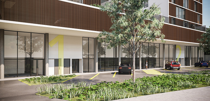 O comercial (Apart Hotel) possui 5 pavimentos, sendo o térreo estacionamento e hall de entrada, o segundo o pilotis (incluindo área comum) e os demais pavimentos-tipo, além de um rooftop com piscina e área gourmet. Já que o projeto foi feito com plantas flexíveis e moduladas, cada pavimento pode ser dividido em até nove apartamentos (estúdios) individuais, ou maiores combinados. O desenho da base acompanha o alinhamento da avenida, criando um chanfro na geometria do edifício que indica a localização da entrada para o pedestre. Sua fachada possui diversas seteiras, distribuídas de forma ritmada e desencontrada, parametrizadas com duas aberturas por módulo de sala, no mínimo.