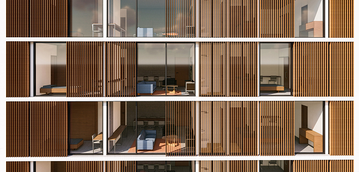 Sua fachada frontal e posterior são inteiramente abertas por amplas esquadrias do piso ao teto, interrompidas apenas por um padrão irracional de brises que garantem privacidade e menor insolação. Além de criar um efeito estético interessante, também apaga as fronteiras entre os apartamentos na visão do transeunte e confere movimento à fachada.