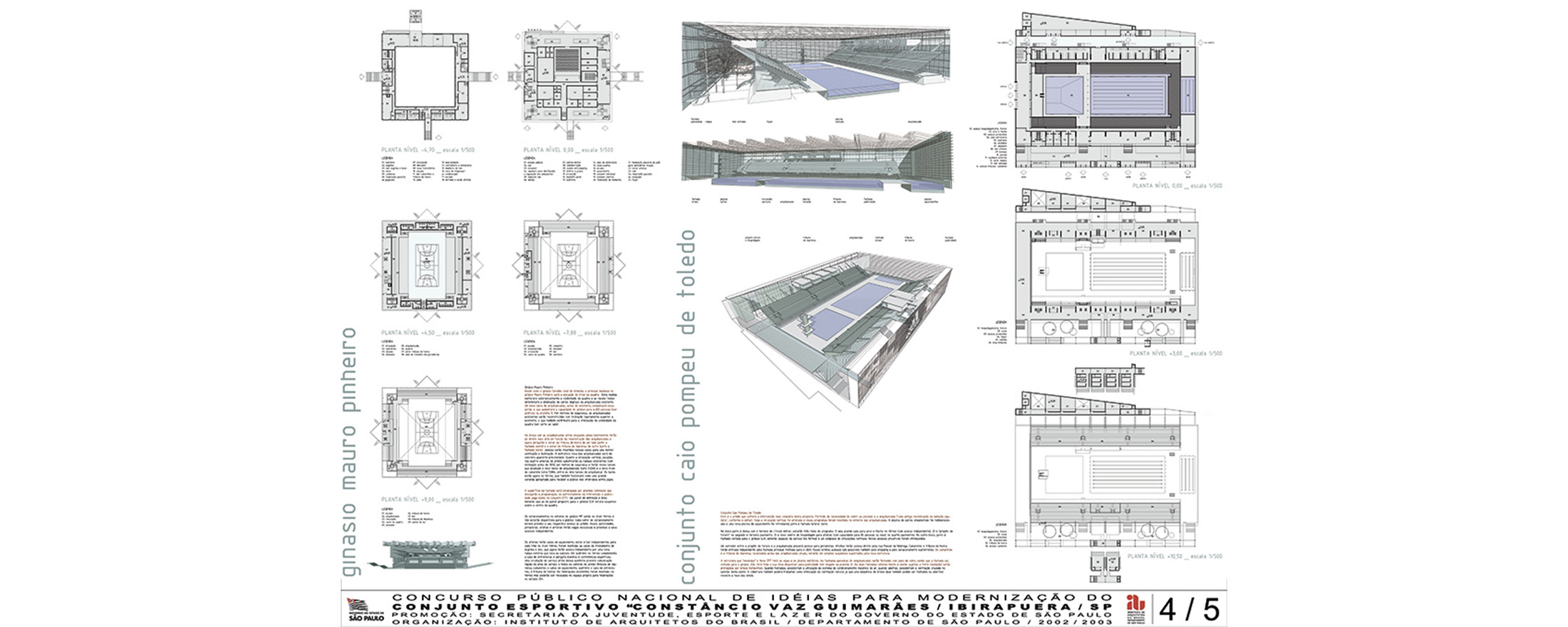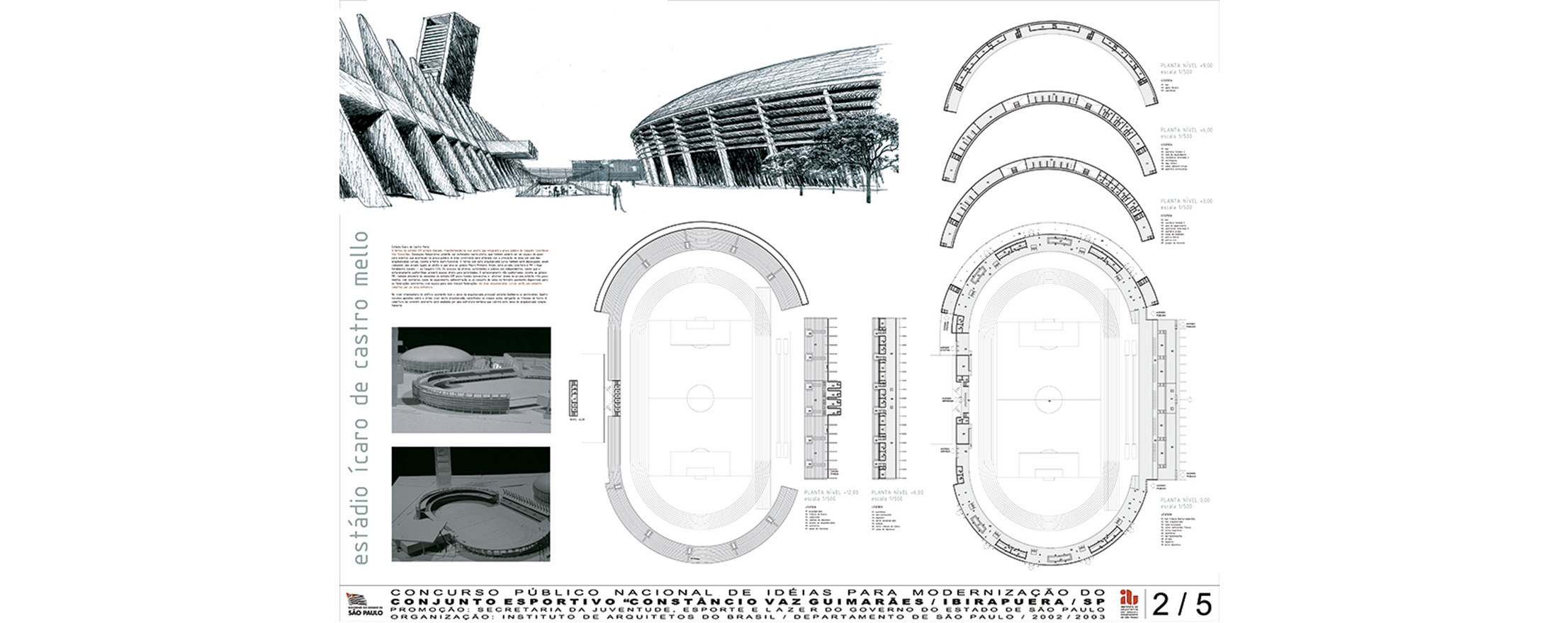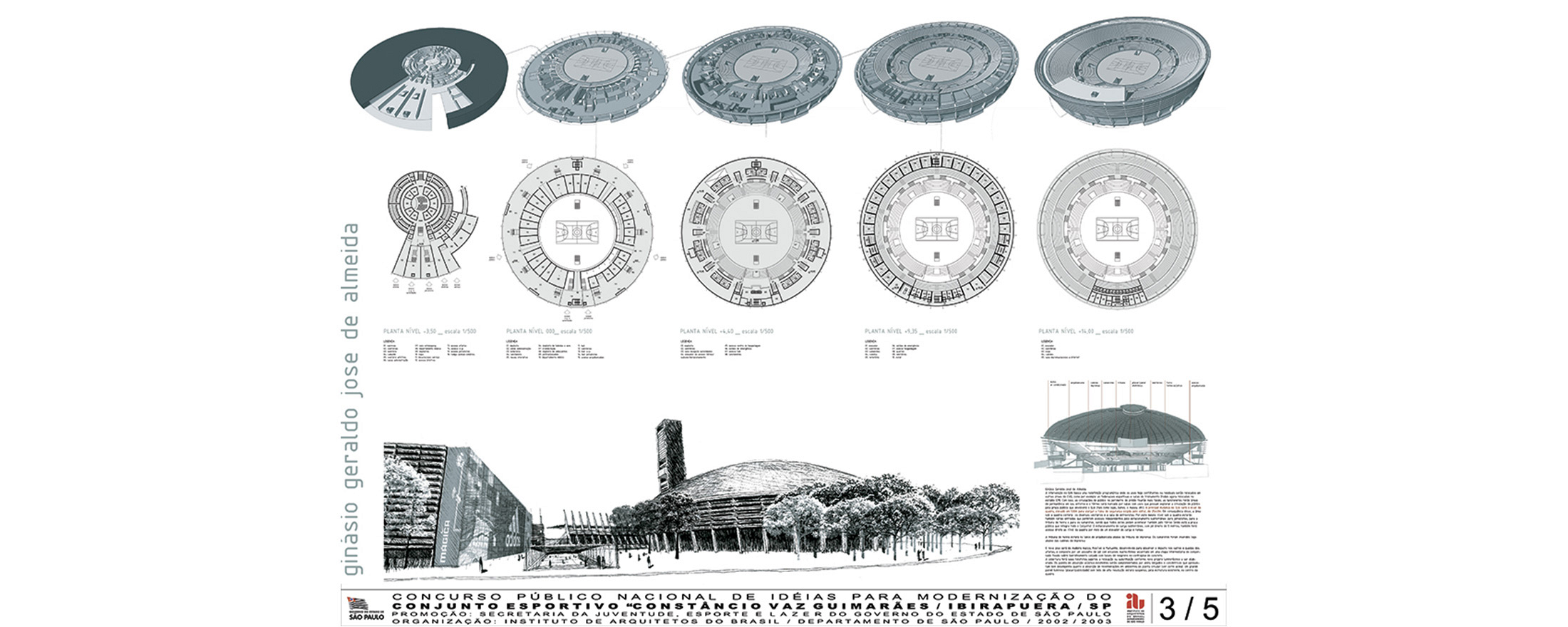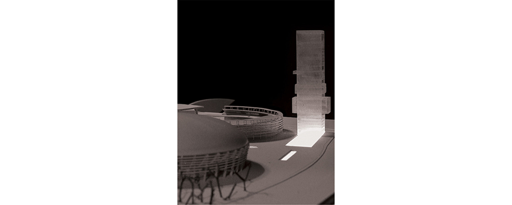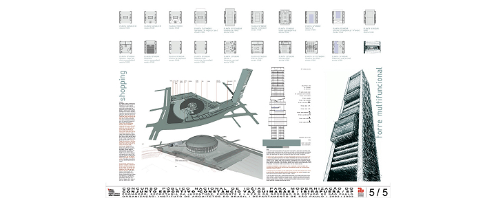 São Paulo, SP, Brasil 2003Concurso para revitalização e modernização do complexo esportivo Ibirapuera, construído em 1963 e constituído por dois ginásios, uma piscina olímpica e uma pista de atletismo. O projeto propõe a adição de um centro comercial subterrâneo que articula todos esses equipamentos pelo sub-solo; e uma torre de 30 andares que abriga quadras, piscinas, um centro de convenções e um hotel. As obras de modernização do complexo esportivo seriam bancadas pelo novo setor privado (centro comercial subterrâneo e hotel na torre).