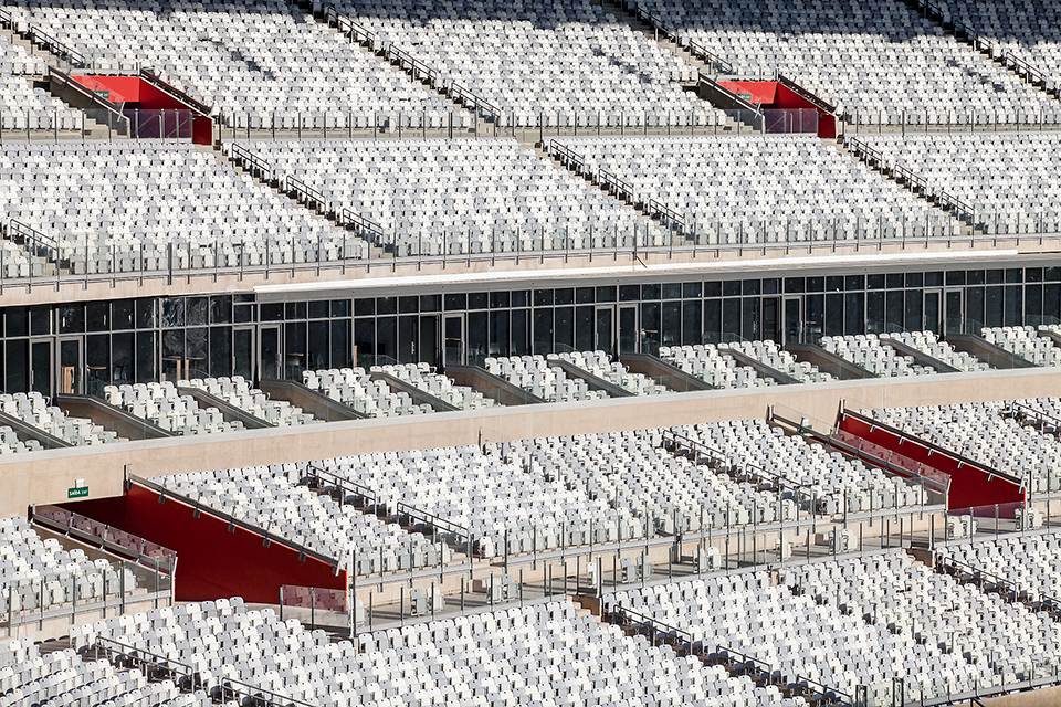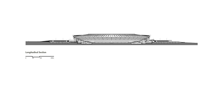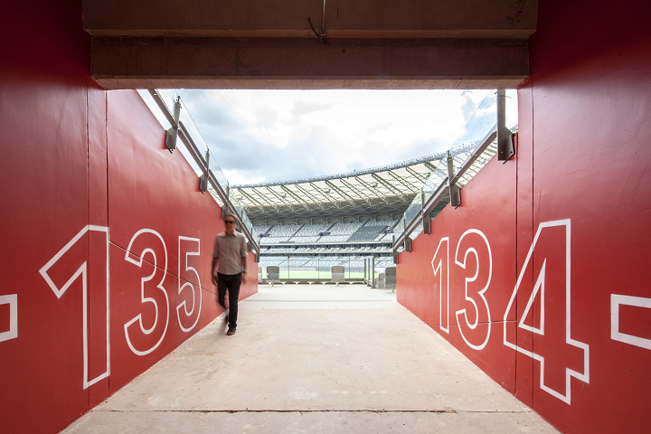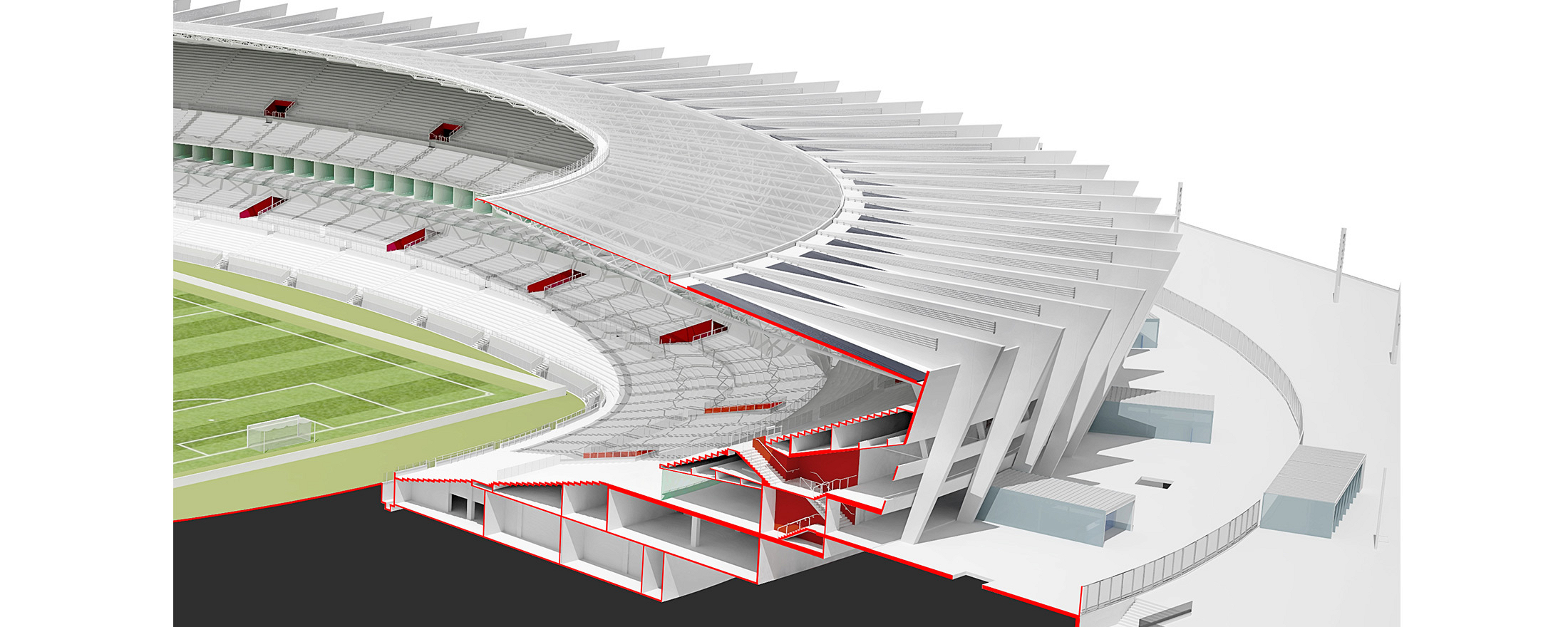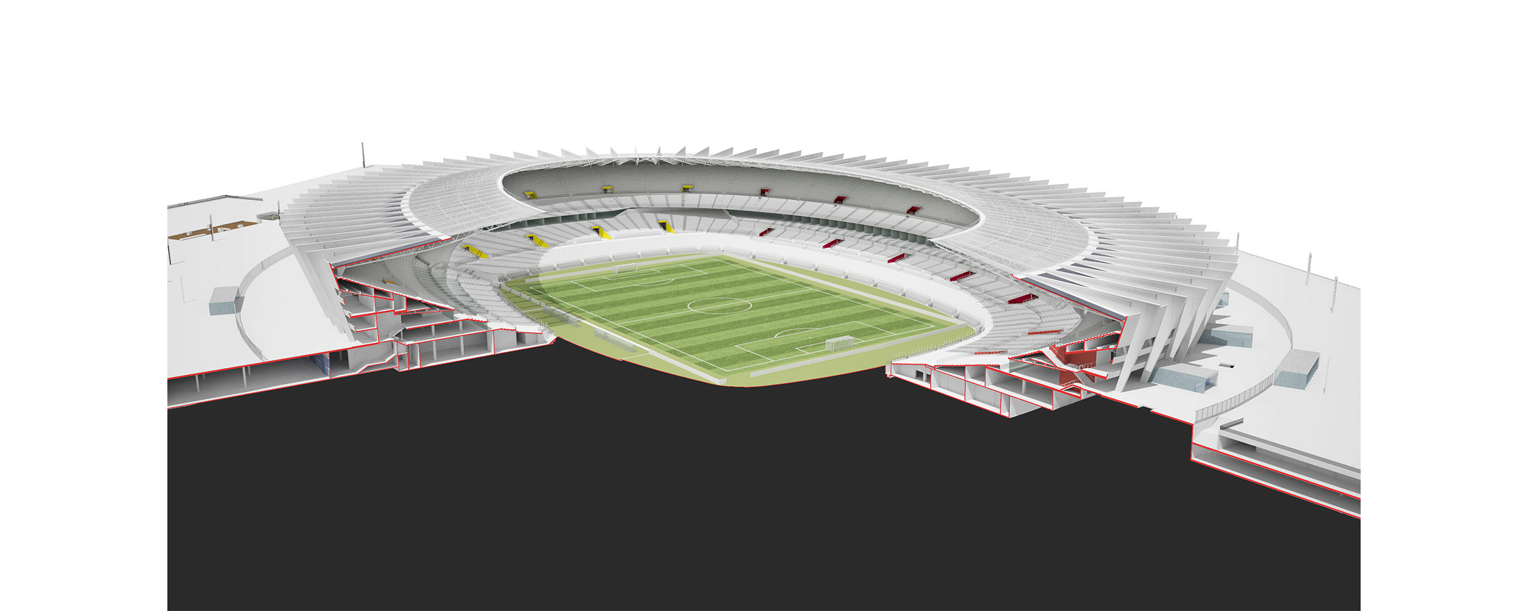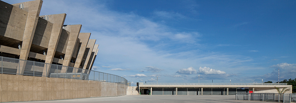 Belo Horizonte, MG, Brasil 2012Inaugurado em 1965 (projeto original de Eduardo Mendes Guimarães Júnior e Gaspar Garreto) como o segundo maior estádio de futebol do mundo, o Mineirão se situa no entorno da Lagoa da Pampulha, próximo das obras seminais de Oscar Niemeyer e Burle Marx, sendo parte do principal cartão-postal de Belo Horizonte. Com a escolha do Brasil para sediar a Copa do Mundo de 2014, veio a oportunidade de transformar o tradicional estádio, cuja fachada é tombada, em um equipamento esportivo multifuncional contemporâneo. Nesse contexto, para transformar “O Gigante da Pampulha” em um moderno complexo multifuncional, procuramos intervir de forma ao mesmo tempo respeitosa e radical, reforçando a monumentalidade da estrutura original do Mineirão na icônica paisagem modernista.