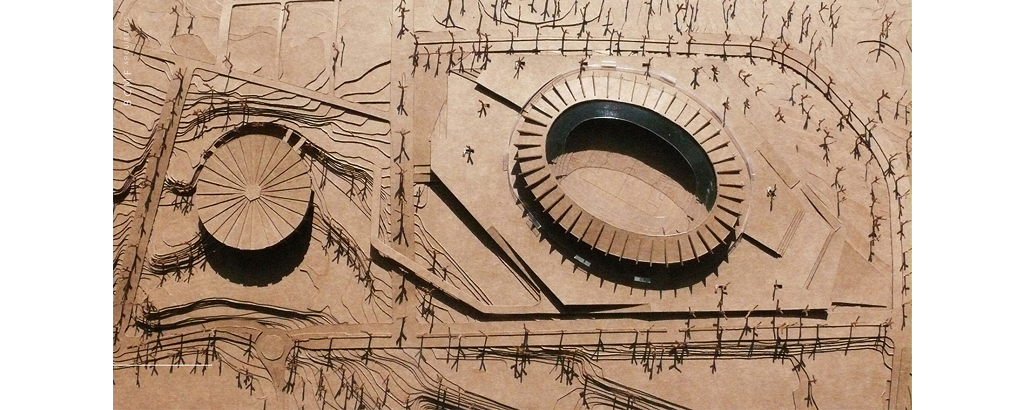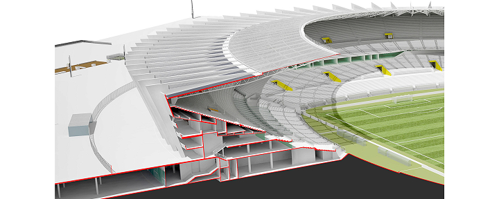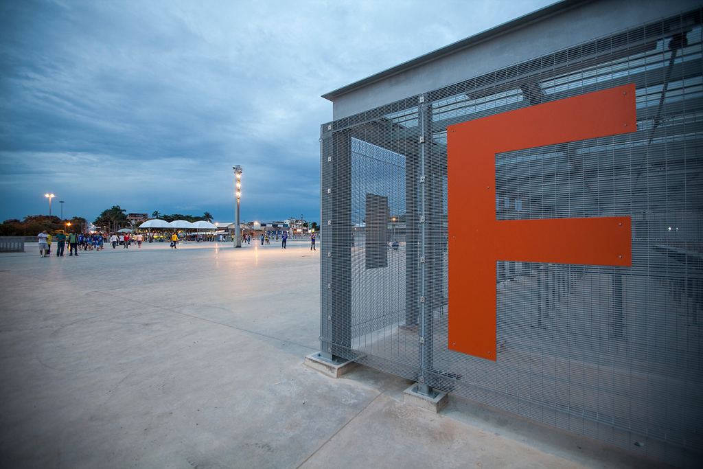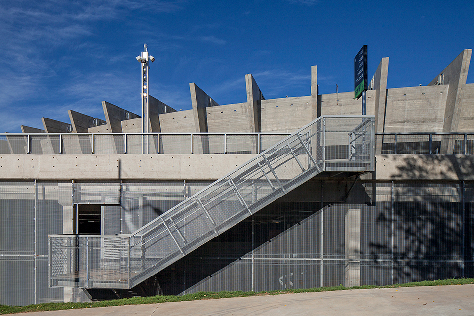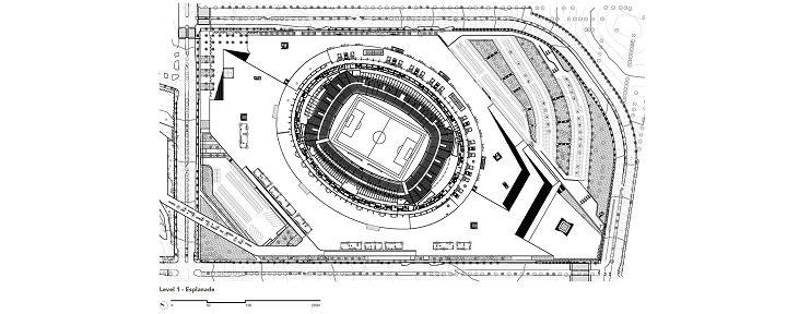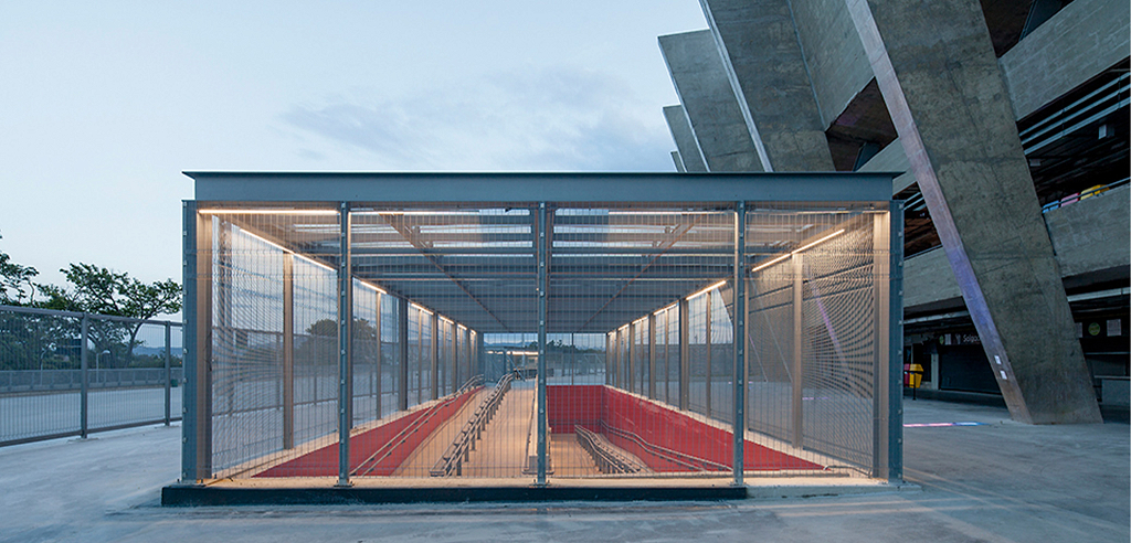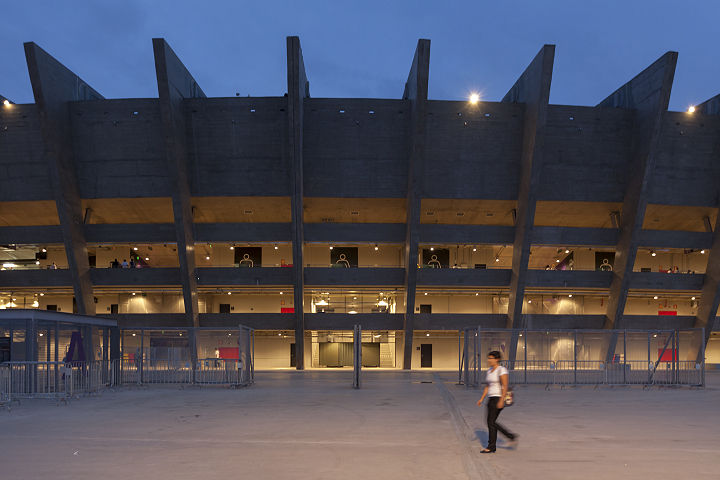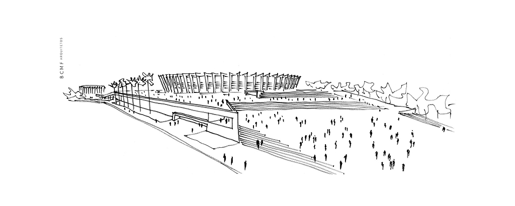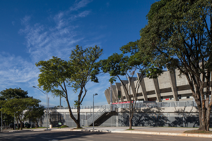 No Mineirão, a adição de programa só poderia ocorrer por meio de um podium, já que o estádio é não apenas uma estrutura existente, mas tombada. A grande inovação da equipe da BCMF foi articular essa plataforma com a cidade e com o estádio. Subvertendo a solução clássica de podium, geralmente associada a um edifício horizontal, a plataforma foi esculpida no terreno, moldando-se a ele e organizando-se em uma série de praças escalonadas de uso semipúblico.