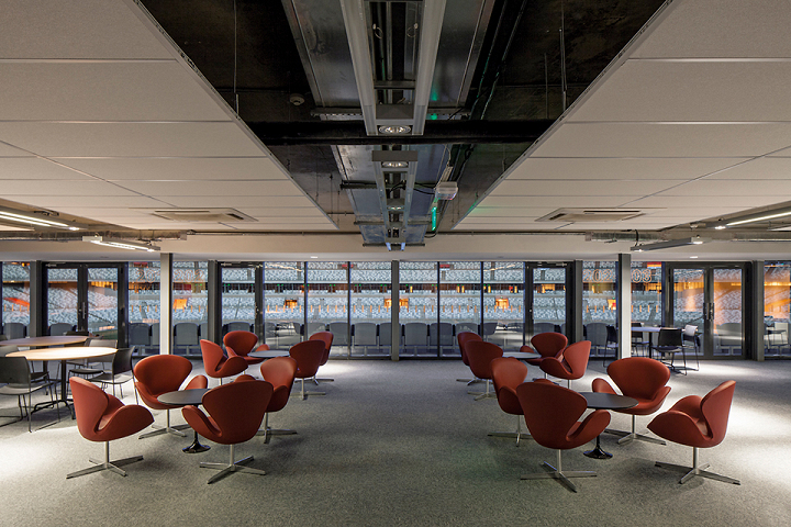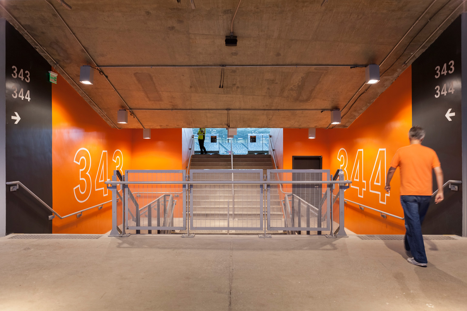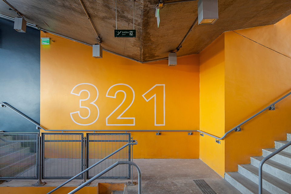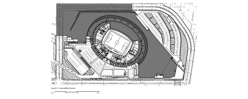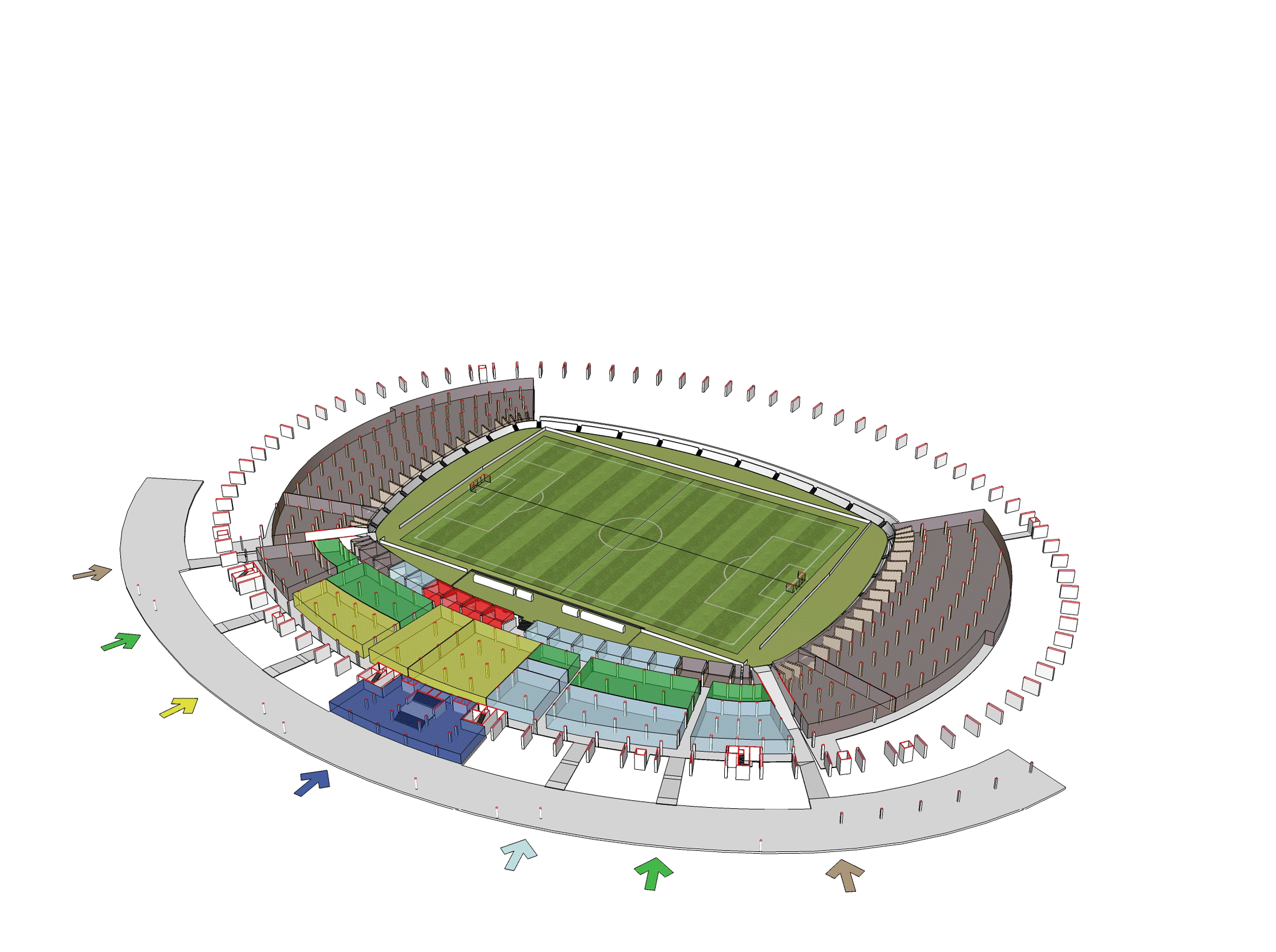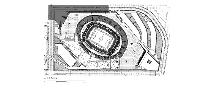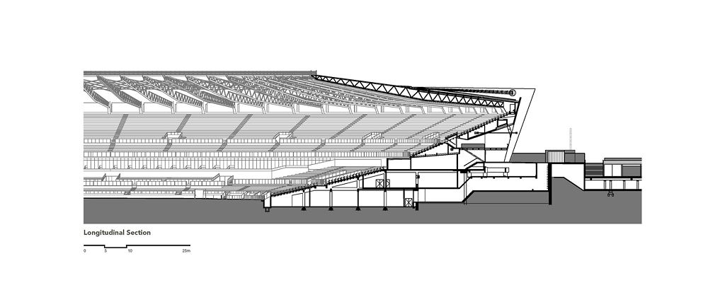 Toda a topografia artificial do térreo é destinada ao fluxo de pedestres e multidões. O subsolo, por sua vez, abriga uma complexa rede de fluxos operacionais e áreas de serviço, além de programas próprios da PPP (áreas comerciais e institucionais) e de exigência do poder público (Museu do Futebol, posto de saúde e juizado de pequenas causas). Cria-se, assim, uma setorização vertical (em corte) associada à tradicional setorização horizontal (em planta), separando o front of house, acima, do back of house, abaixo.