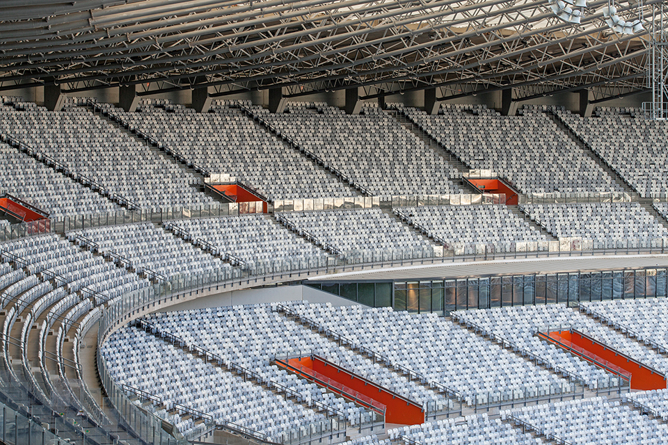 Enquanto os pórticos estruturais, a laje da cobertura e a arquibancada superior, todos tombados, foram preservados, os anéis intermediário e inferior foram demolidos, e o campo rebaixado em 3,40 m. Com isso, atenderam-se os requisitos técnicos da Fifa. Todas as arquibancadas receberam assentos numerados, ergonômicos e resistentes, em três tons de cinza, gerando um inusitado efeito pixelado, que funciona como fundo neutro para a comunicação visual de cores vibrantes dos quatro setores, projeto da Hardy Design. A capacidade do estádio passou a ser de 62.160 lugares.