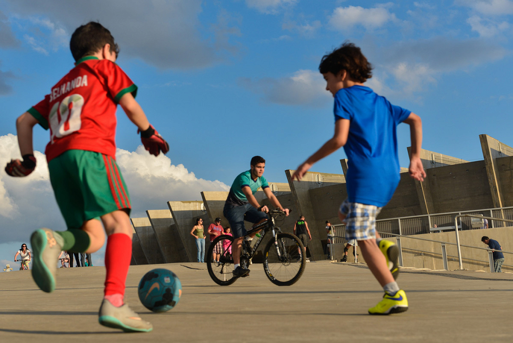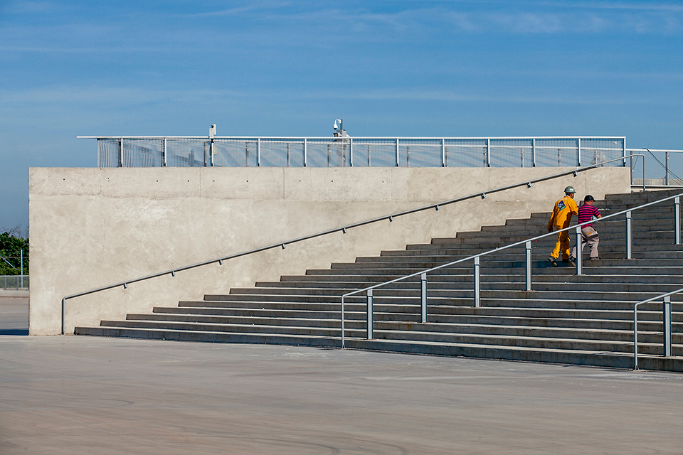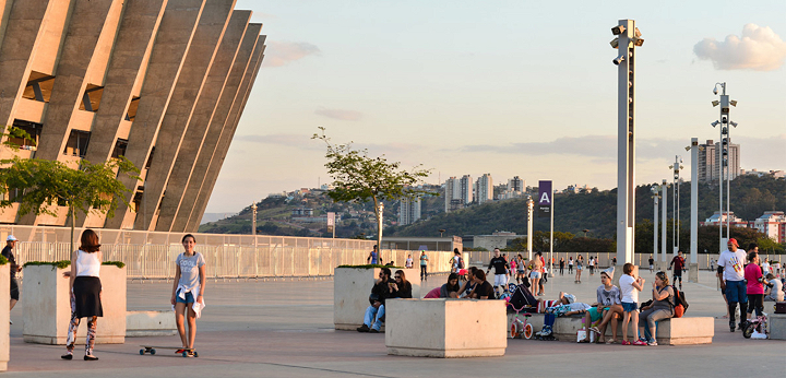 Essas praças são integradas em nível ao entorno imediato e percebidas como uma continuação do solo da cidade. Suaves rampas e planos inclinados, ladeando escadarias com proporções de arquibancada, garantem acessibilidade universal a todos os pontos, inclusive à arena. A aproximação do público é gradual, pontuada por diversas áreas de estar. A partir de uma delas, estabeleceu-se a conexão com o Ginásio do Mineirinho, sobre o sistema viário existente.