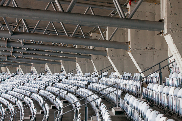 O primeiro passo foi o alívio de tensões estruturais, por meio de um trabalho de protensão com macacos hidráulicos e cabos de aço. A estrutura, que havia cedido cerca de 30 cm ao longo dos anos, foi elevada acima de seu nível original para que, com a nova carga, retornasse a uma condição próxima à inicial. Em seguida, os pilares foram reforçados com sistemas de contraventamento, integrando chapas metálicas e tirantes de aço. Posteriormente, foram instaladas, uma a uma, treliças planas compostas por tubos de aço, engastadas em peças de concreto moldadas junto aos pórticos. Por fim, o conjunto recebeu uma membrana autolimpante.