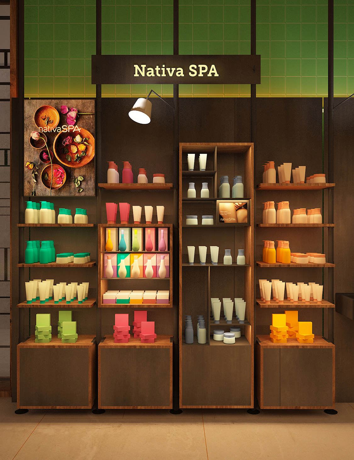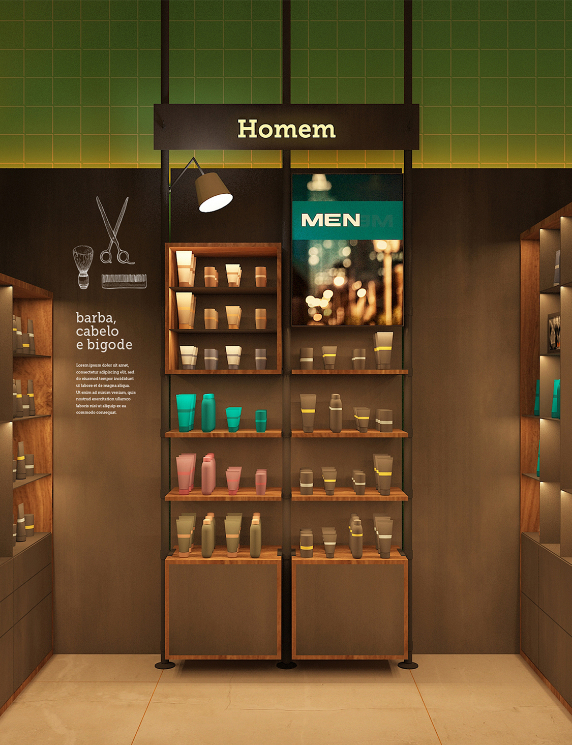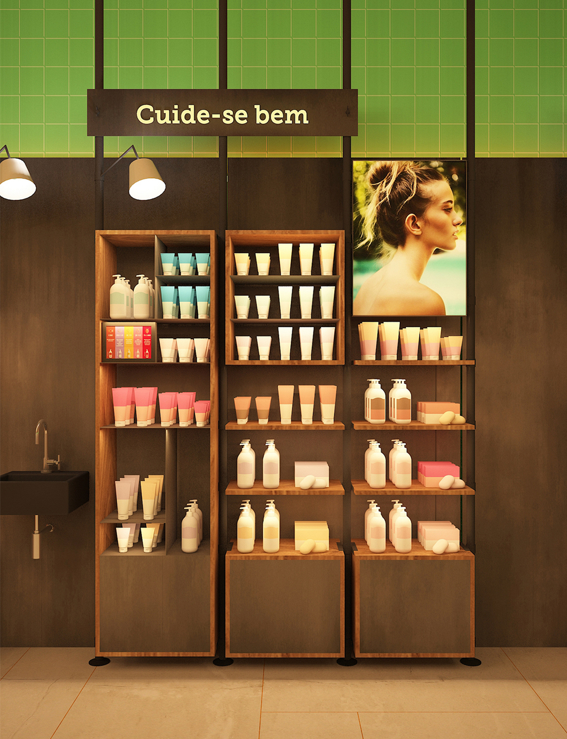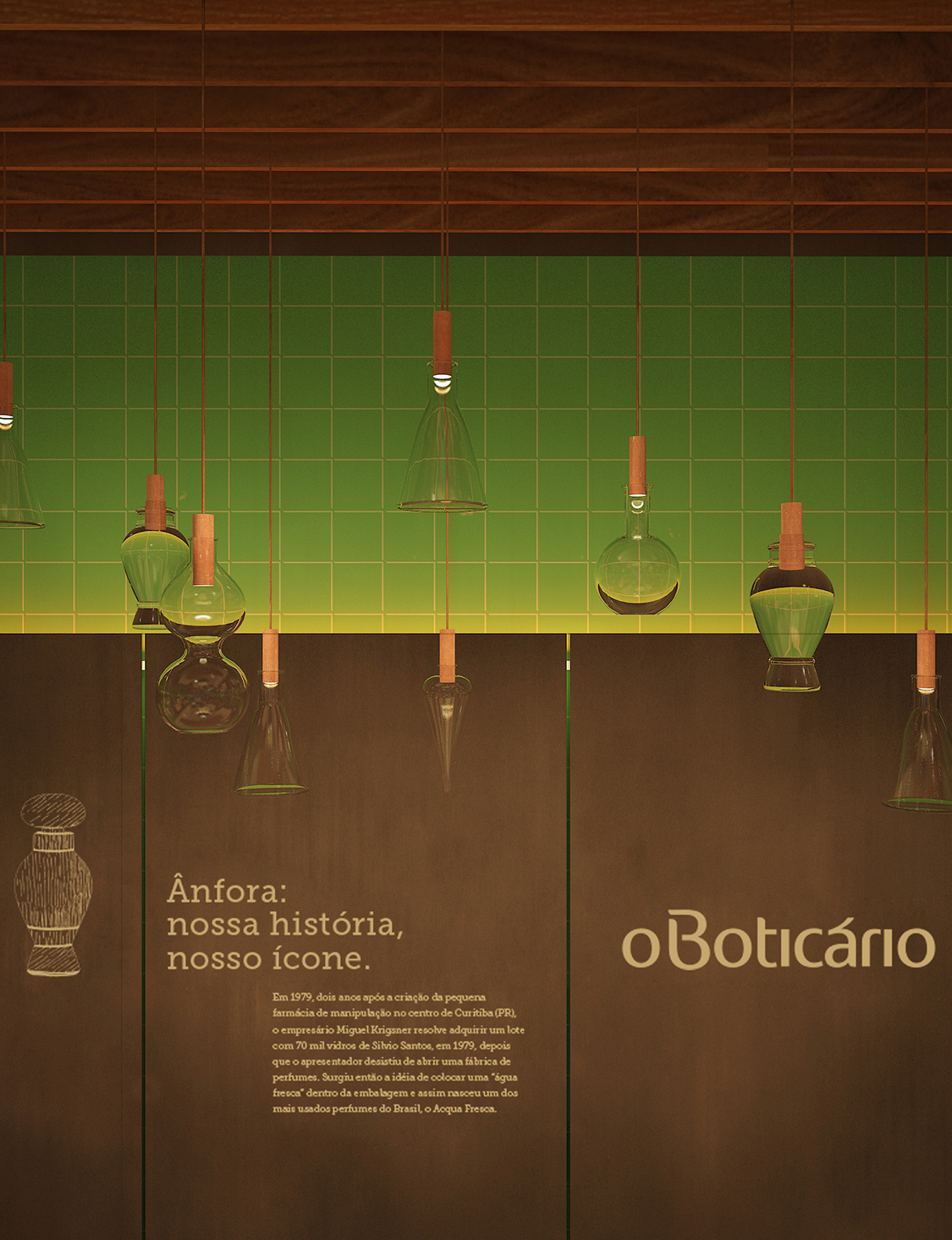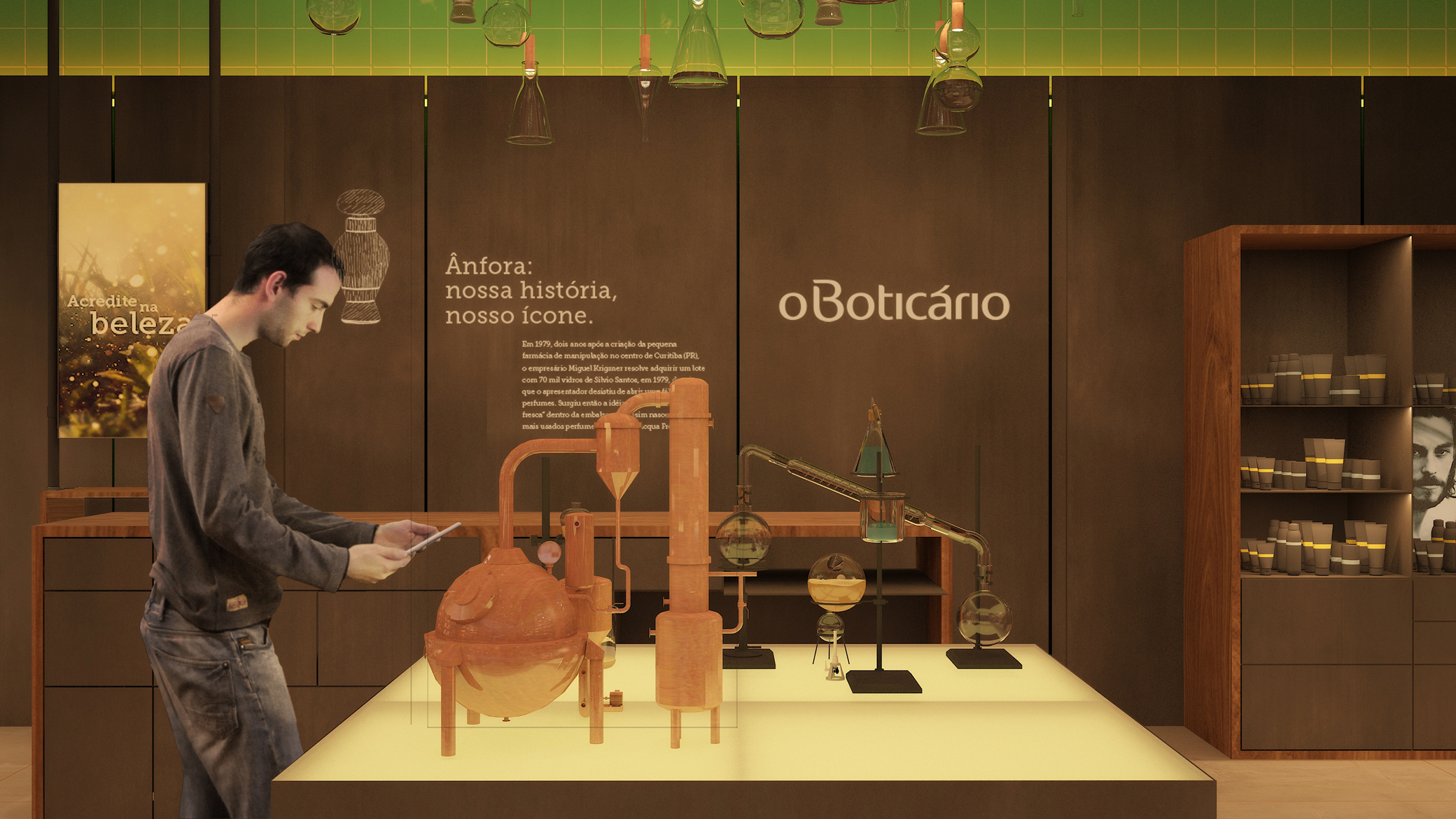As referências para o desenho dos expositores verticais têm origem nos laboratórios e, mais especificamente, nos instrumentos de metal e vidro que fazem parte deste universo. O “suporte universal” é a inspiração para a criação de um sistema de mobiliário expositivo que combina vários tipos de suporte para exposição e guarda de produtos, além de painéis retroiluminados e recursos digitais de visual merchandising. Funil, béquer, balão, tubo de ensaio, erlenmeyer e bureta são elementos utilizados na criação de uma instalação luminosa sobre o mobiliário central.