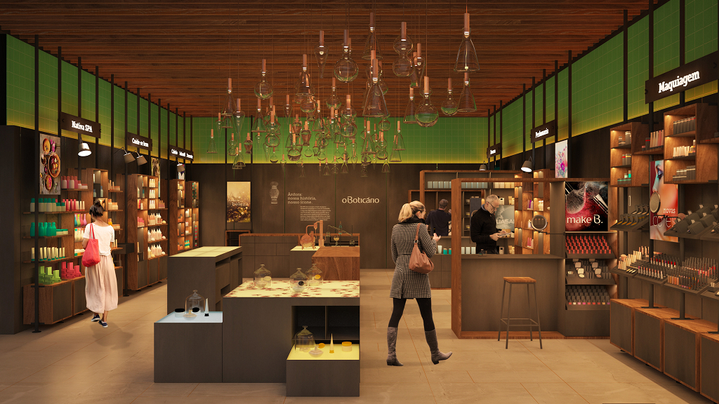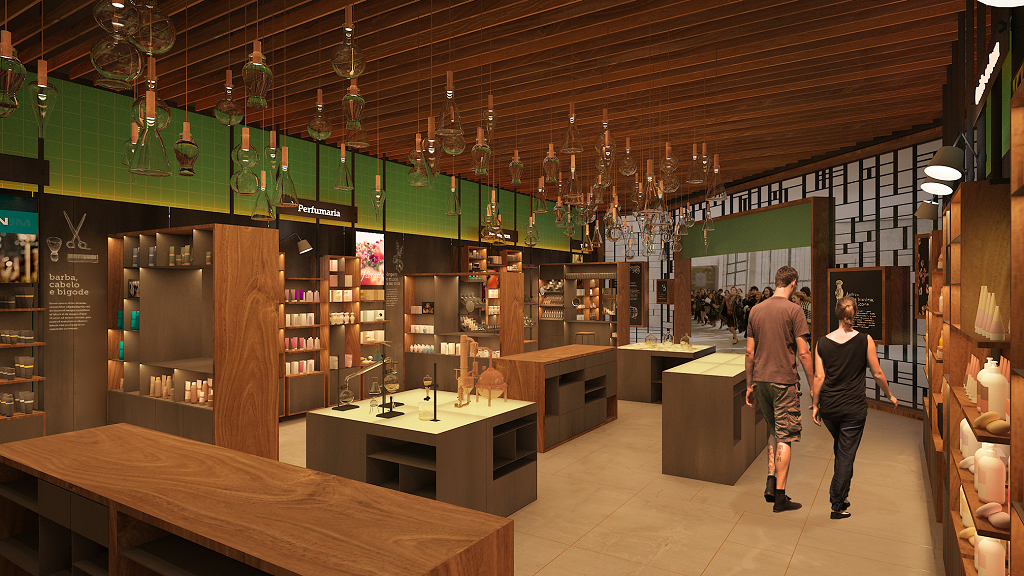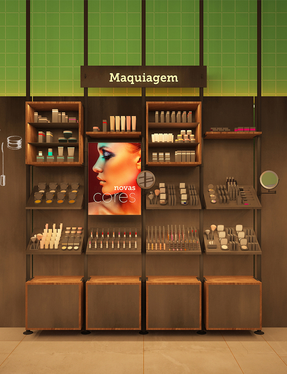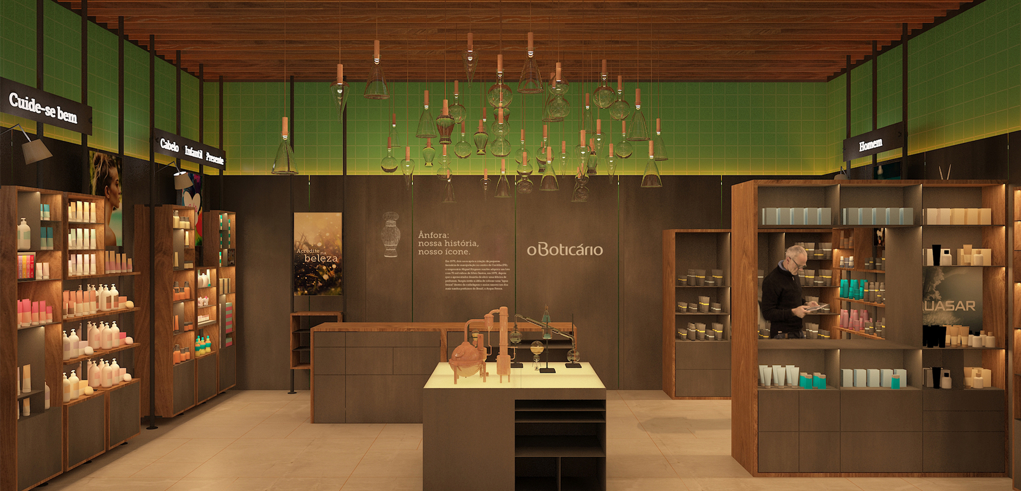 Brasil 2016-2017No projeto da nova loja d’O Boticário, o desenho do mobiliário, o grafismo da fachada e a atmosfera da loja são fruto da inspiração nos chamados “gabinetes de curiosidades”. Estes ambientes, surgidos durante o Renascimento na Europa e hoje considerados antecessores diretos dos museus, abrigavam elementos dos três ramos da biologia considerados na época – animal, vegetal e mineral – em coleções de anotações, desenhos, pinturas, objetos, fósseis, etc. Para organizar elementos tão distintos, os gabinetes de curiosidades possuíam uma grande variedade de dispositivos “expográficos” a partir de uma modulação ortogonal. A partir do sistema geométrico da organização espacial dos gabinetes de curiosidades, criamos um grid parametrizado e exclusivo, que se aplica em diferentes escalas, técnicas construtivas e materiais em diversos elementos da loja: piso, fachada, mesas e expositores verticais.