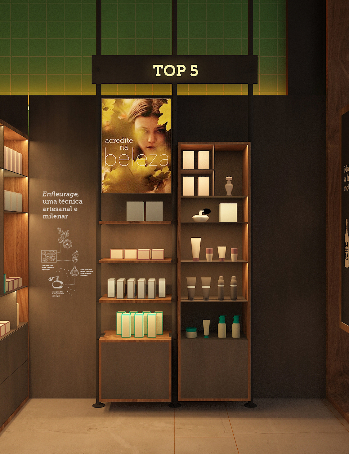 como em uma biblioteca, refere-se ao local de pesquisa; as mesas centrais, local de trabalho repleto de referências, instrumentos e inspirações; e os expositores altos, característicos das boticas clássicas, como local de guarda e exposição de seus produtos.