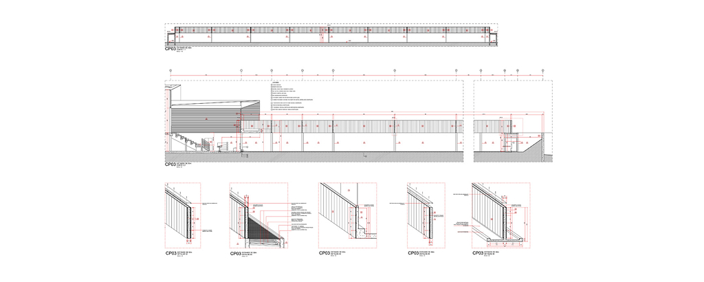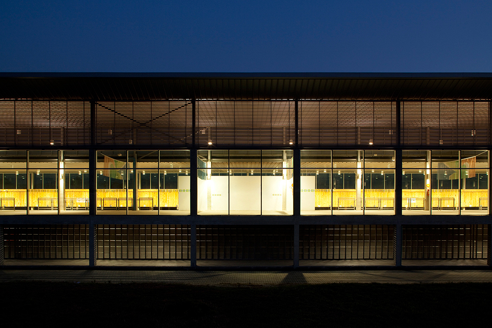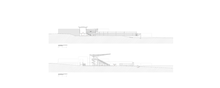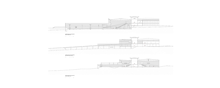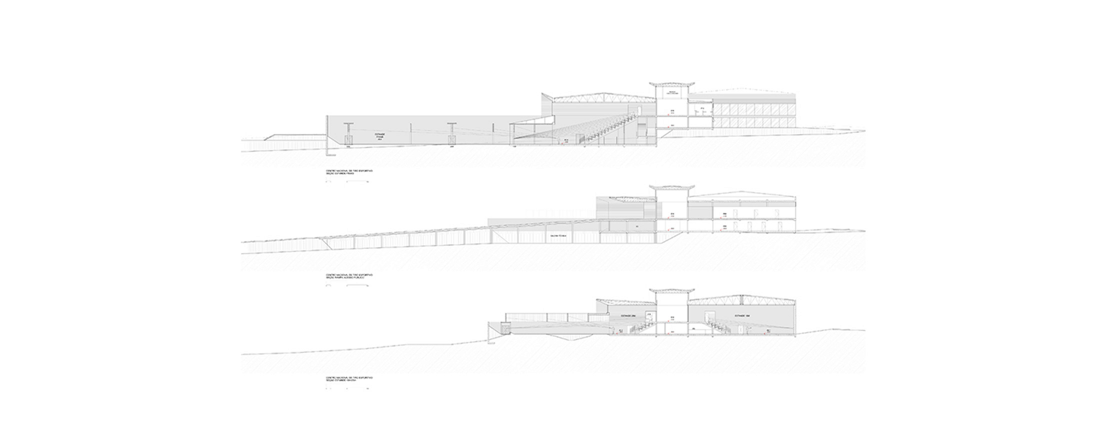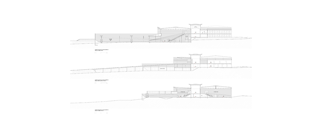 Nesta instalação, talvez os cortes sejam mais esclarecedores do que as plantas. Os diversos desníveis foram induzidos pela topografia, na intenção de se compensar os volumes de corte e aterro e também pela necessidade de separação das áreas de atletas (nível inferior) das áreas de público (nível superior). Esses fluxos nunca se cruzam, mesmo quando ocorrem no mesmo nível.