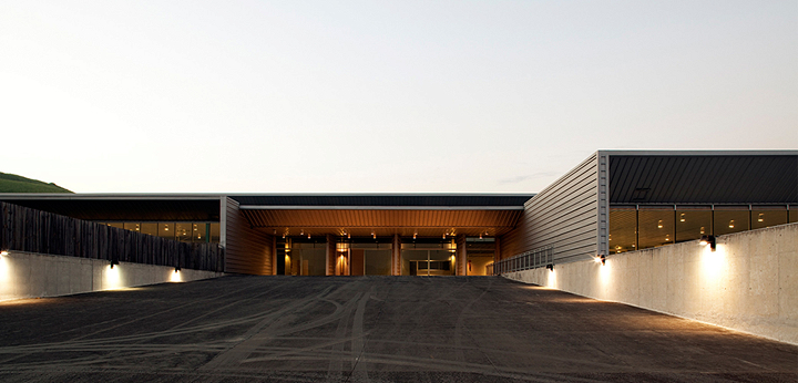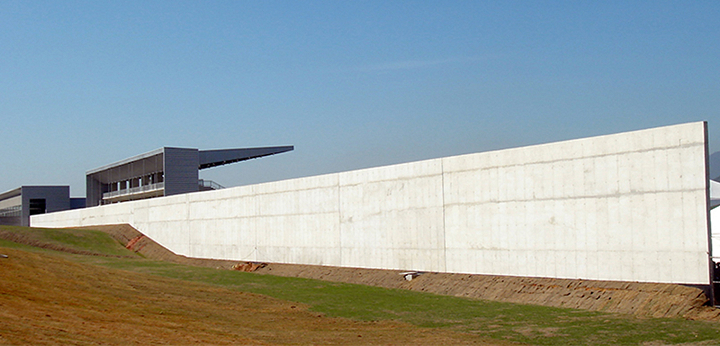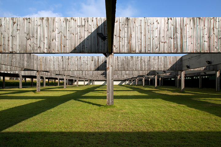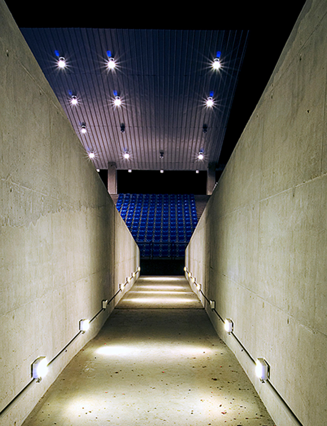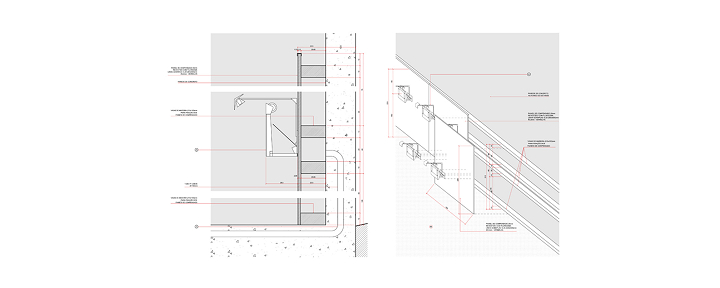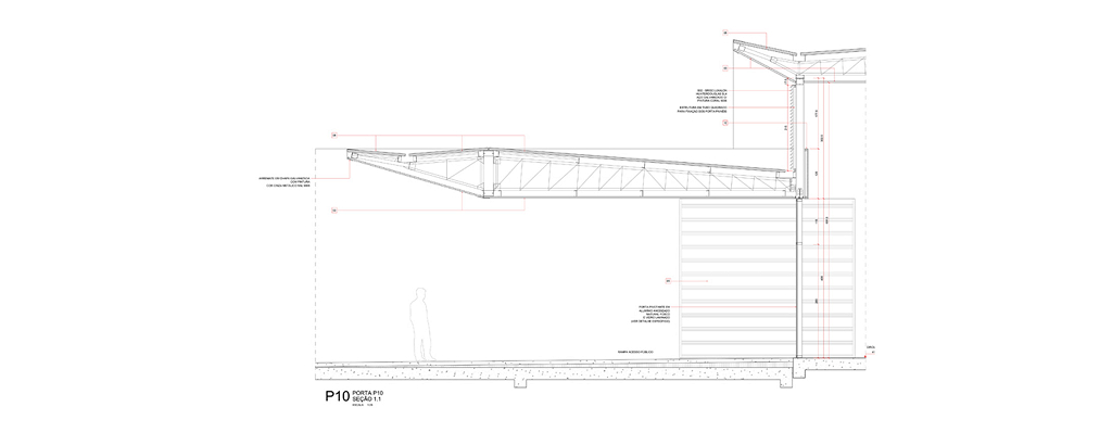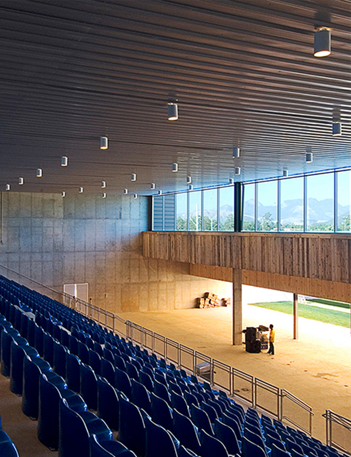 Nesta instalação, talvez os cortes sejam mais esclarecedores do que as plantas. Os diversos desníveis foram induzidos pela topografia, na intenção de se compensar os volumes de corte e aterro e também pela necessidade de separação das áreas de atletas (nível inferior) das áreas de público (nível superior). Esses fluxos nunca se cruzam, mesmo quando ocorrem no mesmo nível.