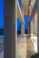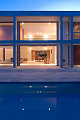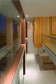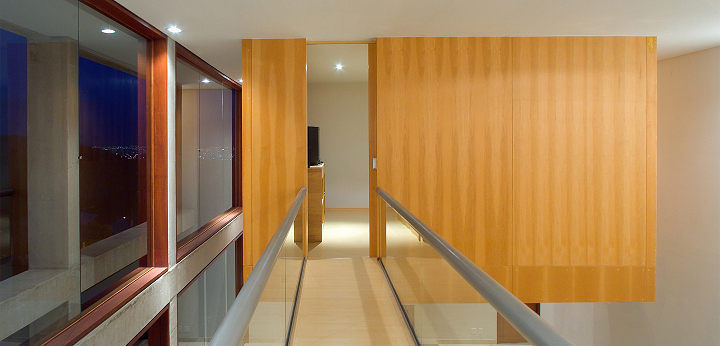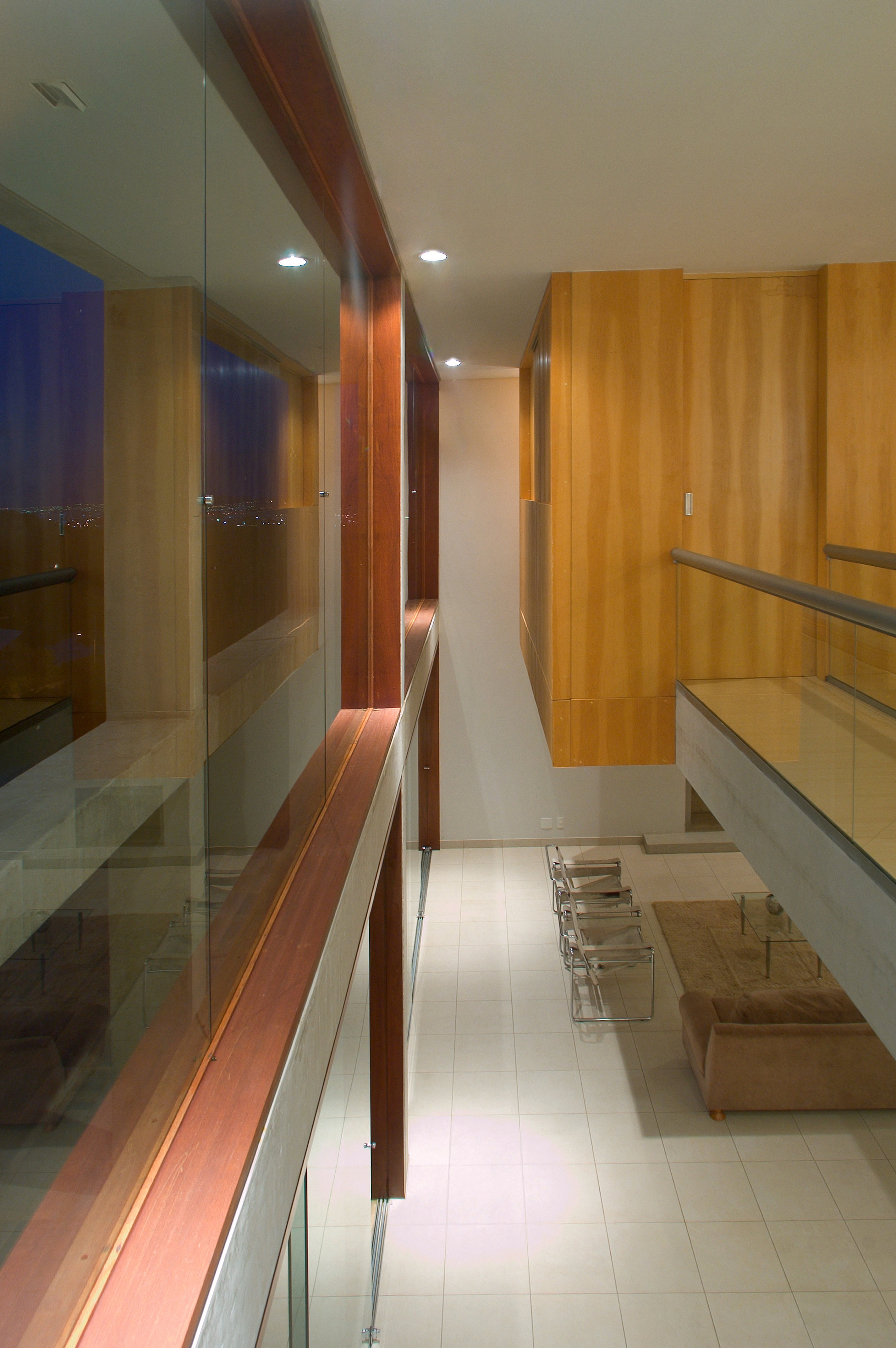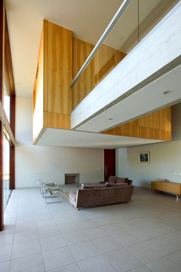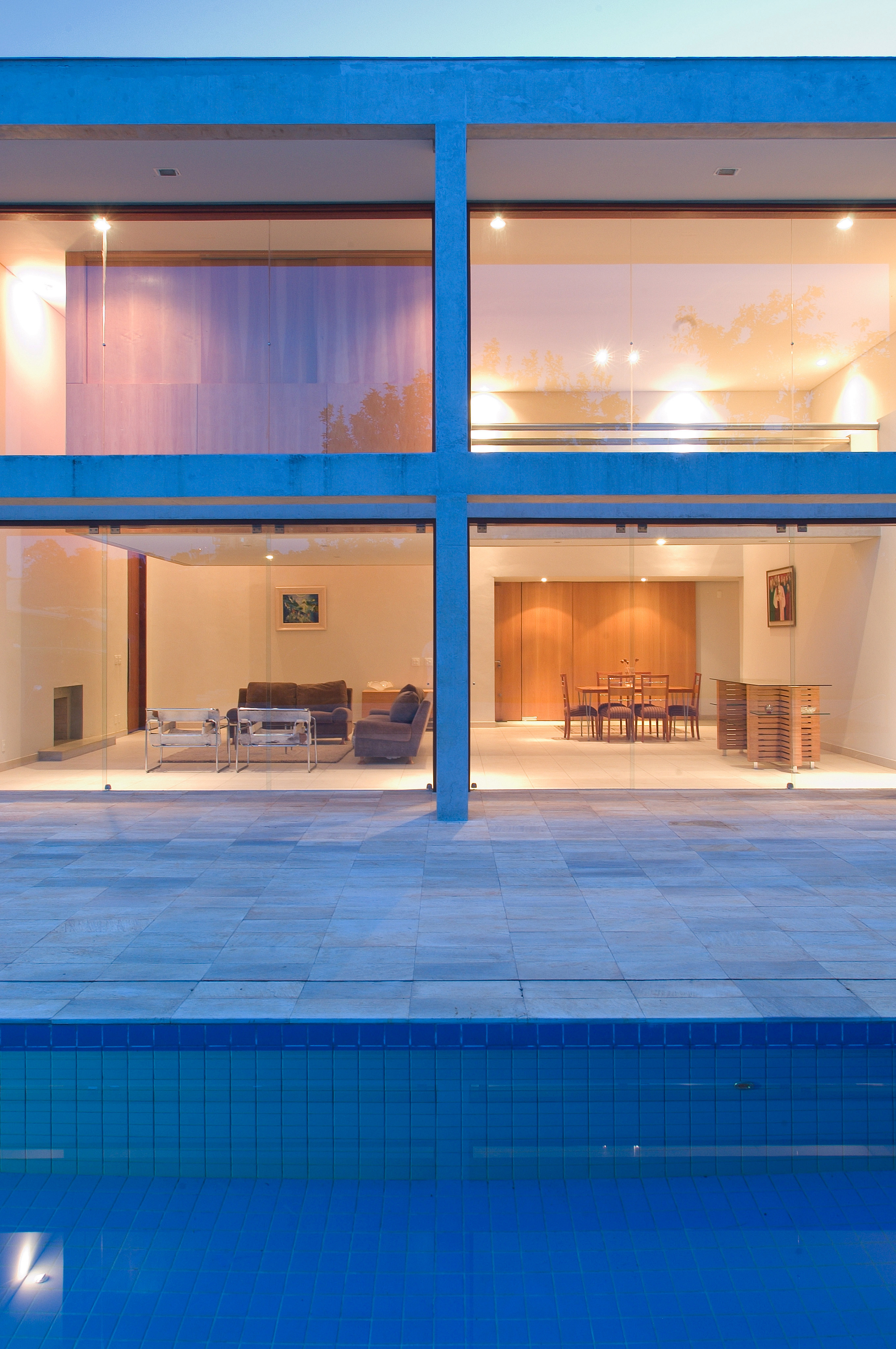 As áreas social e íntima são tratadas de forma diferenciada no volume prismático da casa. A área social possui a altura total do prisma, transparência e seus elementos de vedação – porta de entrada e panos de vidro – explicitam a volumetria interna. A área íntima, mais fechada e reservada, subdividide a altura do prisma em dois pavimentos_ o andar superior é ocupado pelo quarto do casal e o pavimento térreo pelas filhas, escritório e eventuais hóspedes.