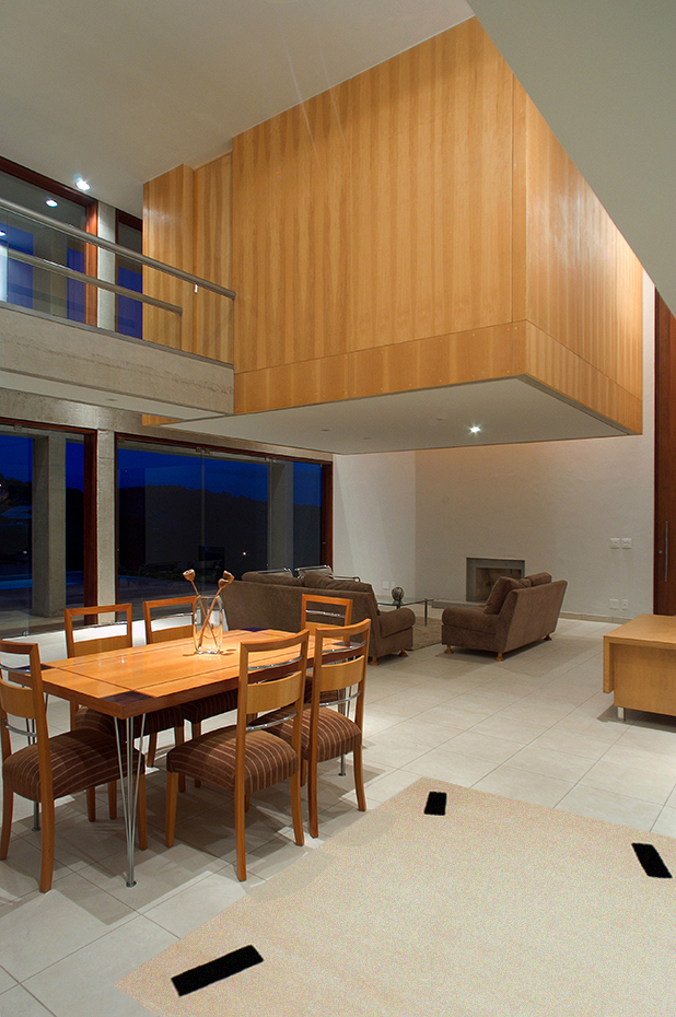Na área social, foi criada uma caixa de madeira atirantada ao teto – home theatre – quebrando o grande volume vazio e proporcionando, através da variação de pé-direito, diferentes ambientes dentro do mesmo espaço. A cozinha, através de um painel de correr permite sua total abertura e integração com as salas.
