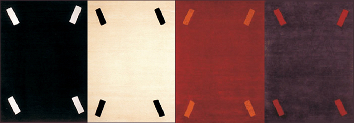 No caso, os quatro riscos têm sempre sua relação de proporção constante em relação ao vazio. A mudança de orientação sutil de um dos quatro riscos (qual deles?) na superfície lisa do tapete brinca com nossa tendência de perceber certas simetrias, ao invés de outras possíveis. No caso, dependendo do risco a ser ‘reajustado’ visualmente podemos ter uma composição concêntrica, centrífuga, longitudinal, transversal ou mesmo diagonal. O olhar rápido e desatento assume a simetria mais óbvia, e às vezes nem mesmo percebe o pequeno ‘erro’ de posição. A grande superfície sem desenho valoriza a qualidade da lã grossa e suas nuances de tom.